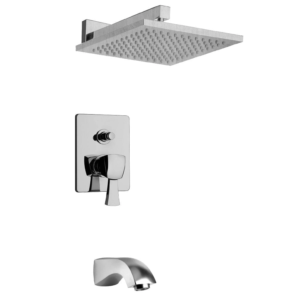 KIT including:- 8" Brass Square rain shower head- Anti Limestone- 12" Brass Square wall mounted arm & flange- Trim 788 with diverter & ceramic disc valve cartridge- Rough in valve 788- 8 17/64" Brass tub spout 1/2" NPT inlet connections