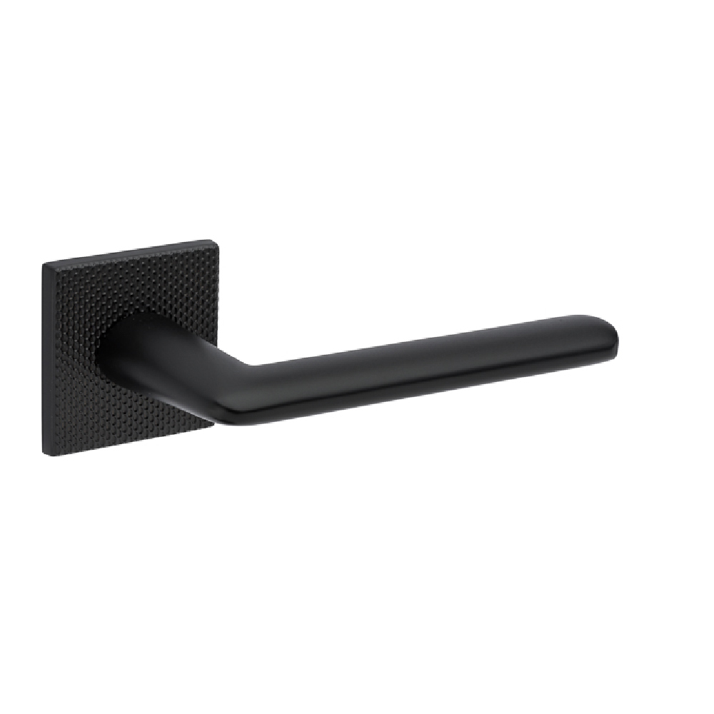 Lever set. 0.19" plate. Easy to fit into the metallic adapter with a “click” system. Reversible recuperating spring. 0.3"x3.5" square spindle. Handle fixed by a M 6 hidden threaded pin.