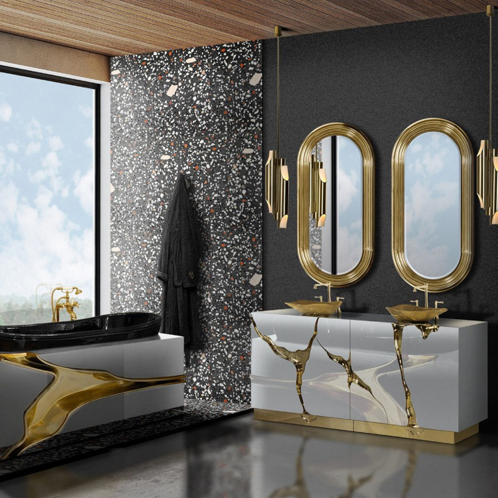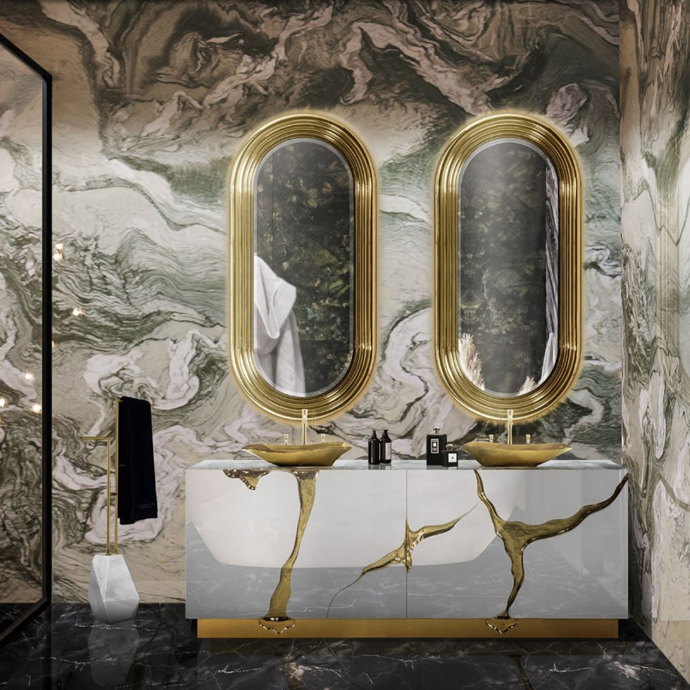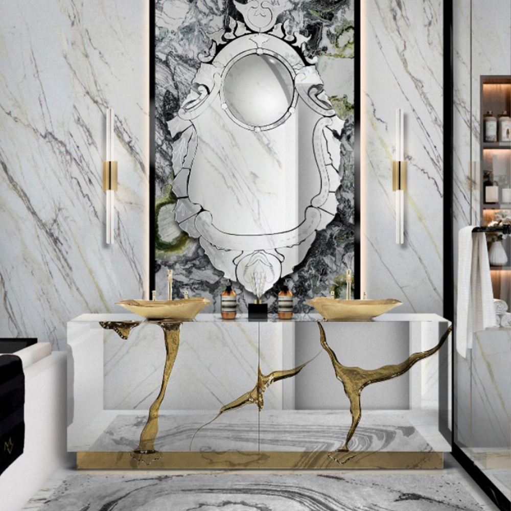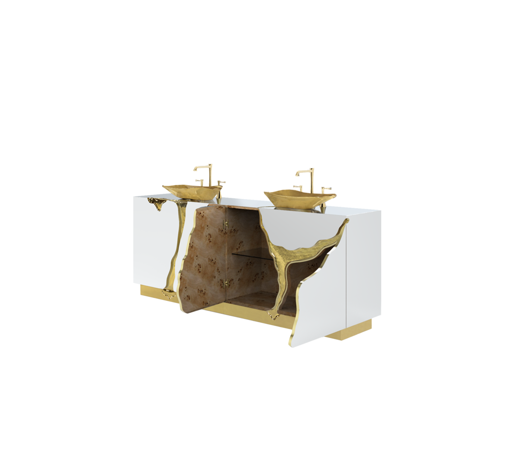 Structure: Sheet of stainless steel | Polished brass tears, High gloss varnish; Inside: Poplar Root Veneer; Four doors; Water drainage: Wall