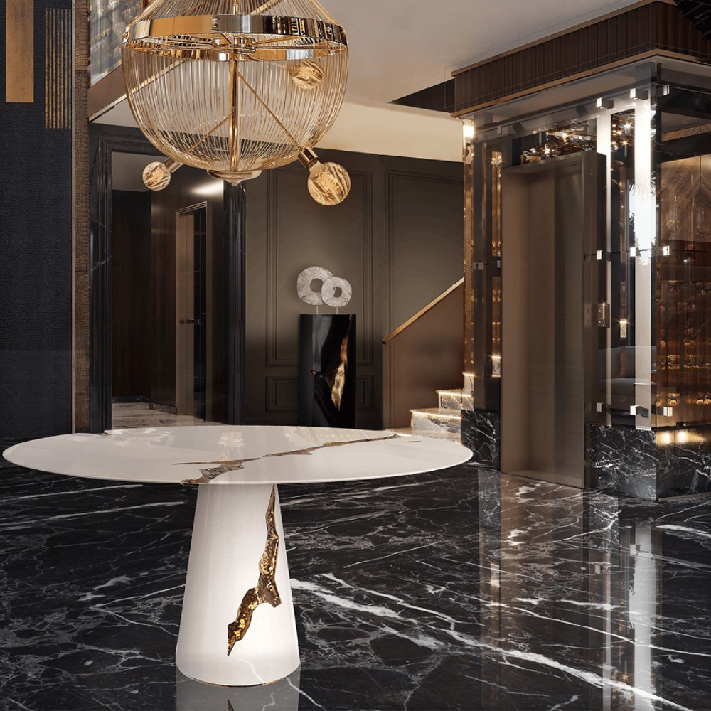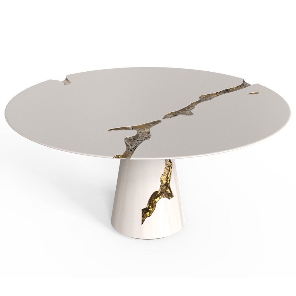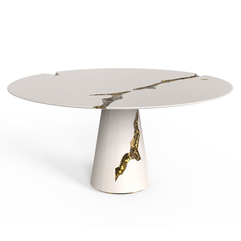 The Lapiaz dining table’s surface is made in mahogany and white lacquer, with high polished brass details to fill the cracks. Its legs, also made from mahogany are finished the same way, and with polished brass sheets.