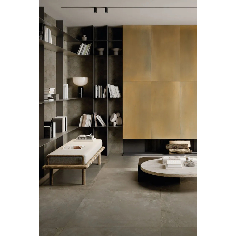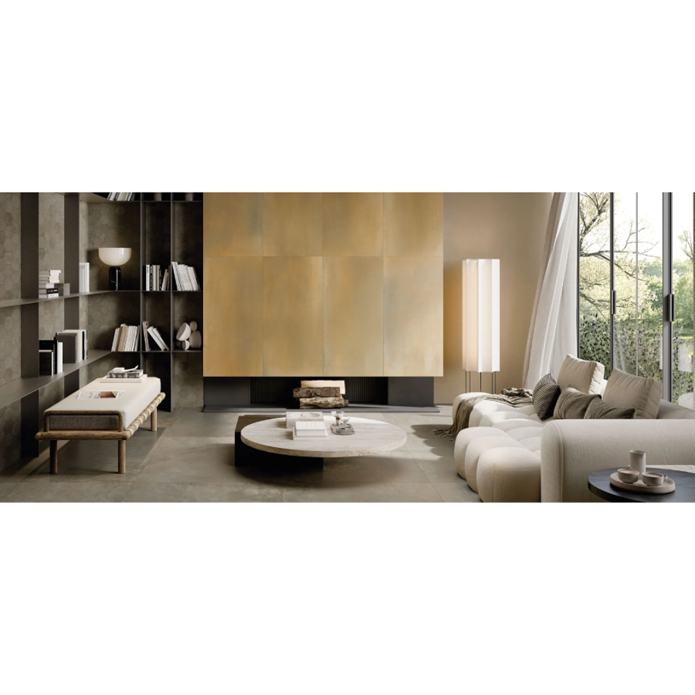 Legame emphasizes the dual spirit of stone and concrete, enhanced with metallic accents, reflecting modern trends in architecture and interior design. Available in rectified sizes of 40” × 40”, 24” × 48”, and 24” × 24”, Olive supports ultra-thin grout lines, evoking the industrial-chic elegance of repurposed factory spaces while offering a refined, contemporary look.