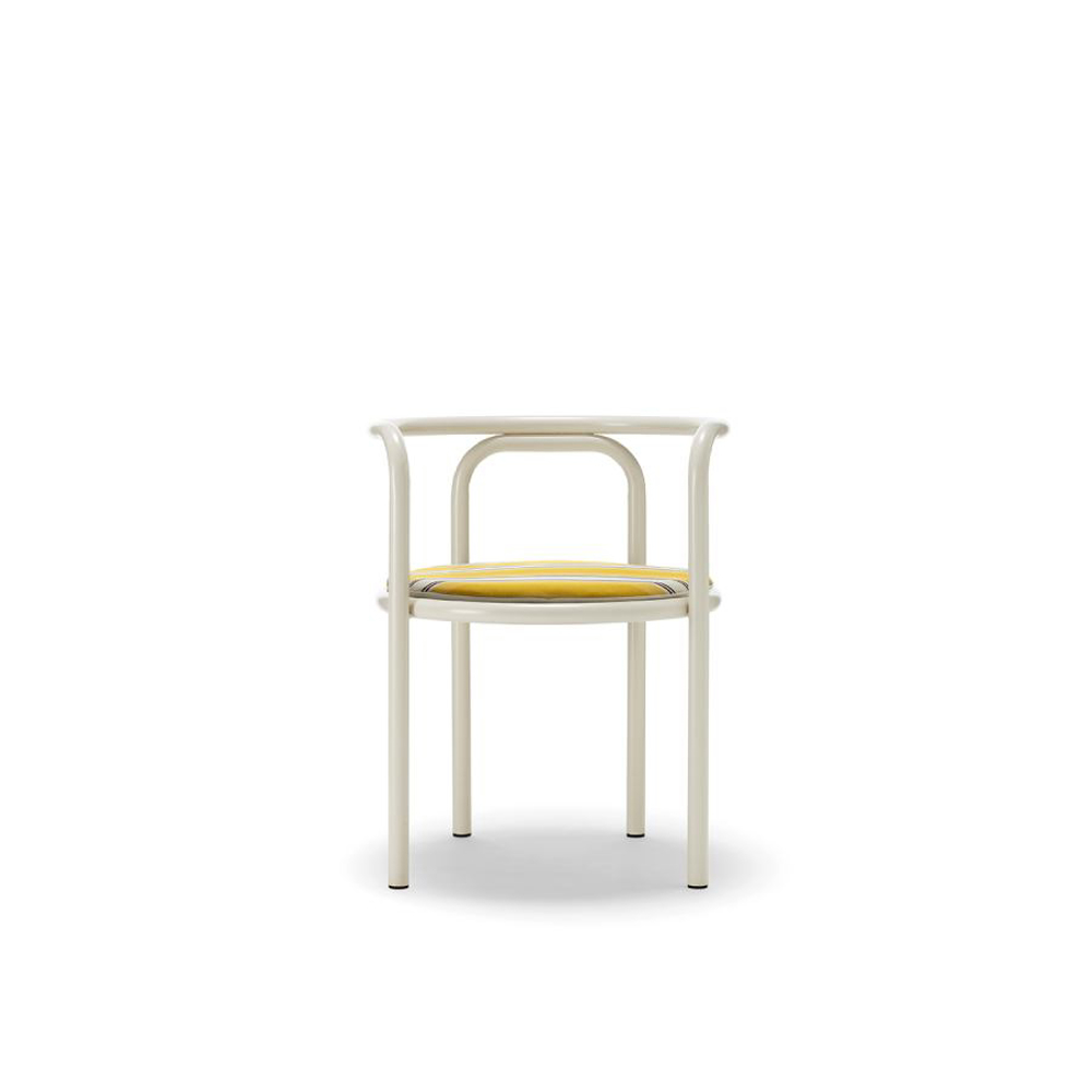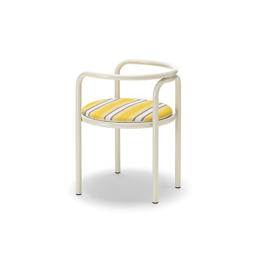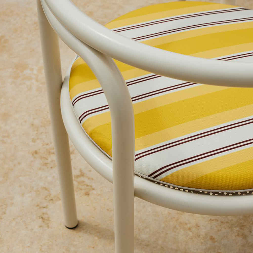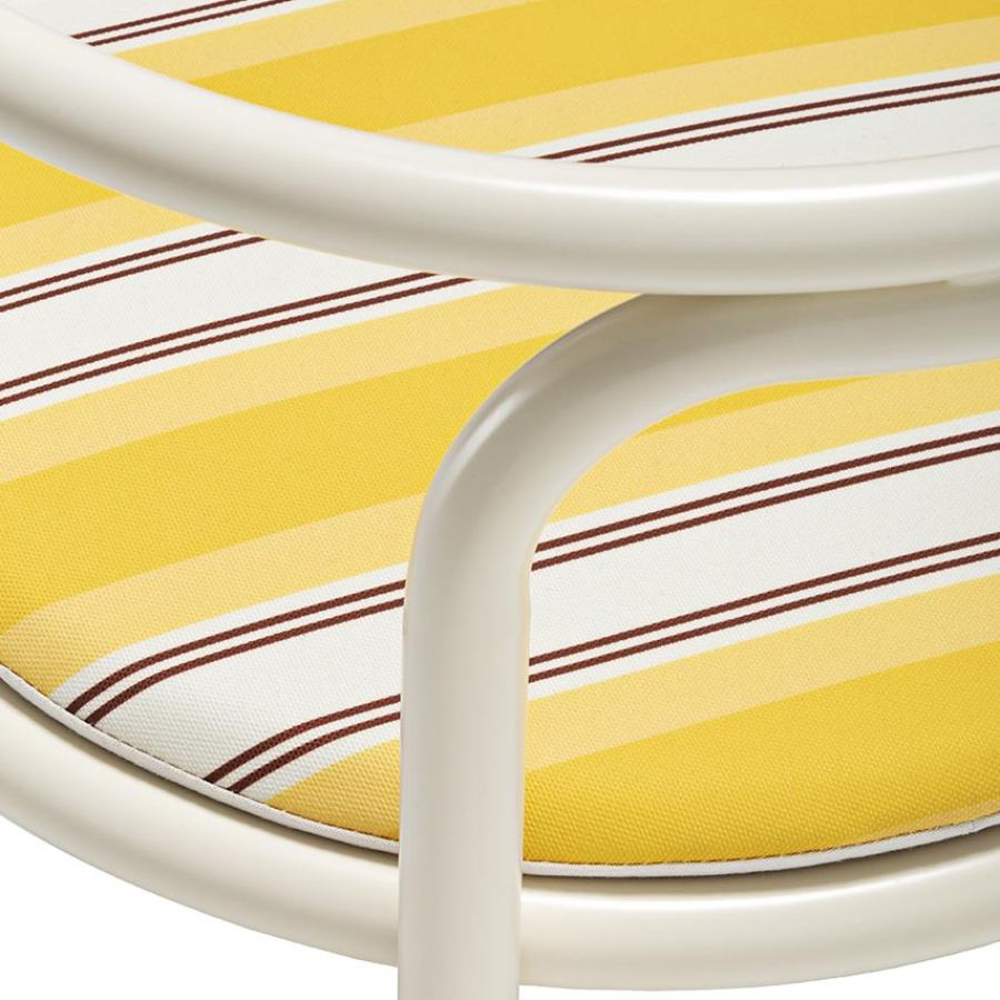 The frame of the Locus Solus Chair is made of painted stainless steel tubulars. This capsule collection offers an Off-White metal structure with seats available in two versions: yellow-striped or beige fabric with contrasting hand-embroidered details.