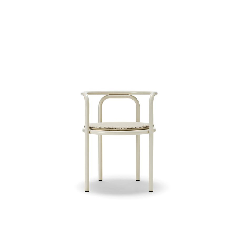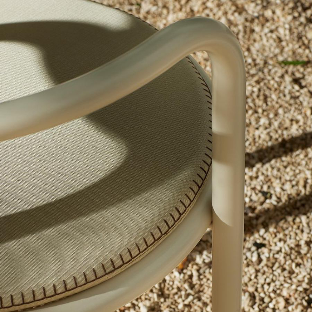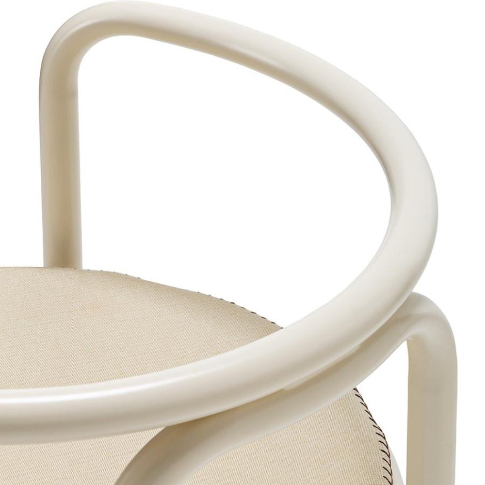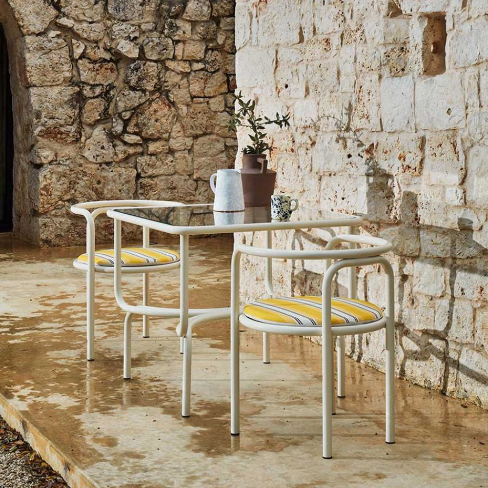 The frame of the Locus Solus Chair is made of painted stainless steel tubulars. This capsule collection offers an Off-White metal structure with seats available in two versions: yellow-striped or beige fabric with contrasting hand-embroidered details.