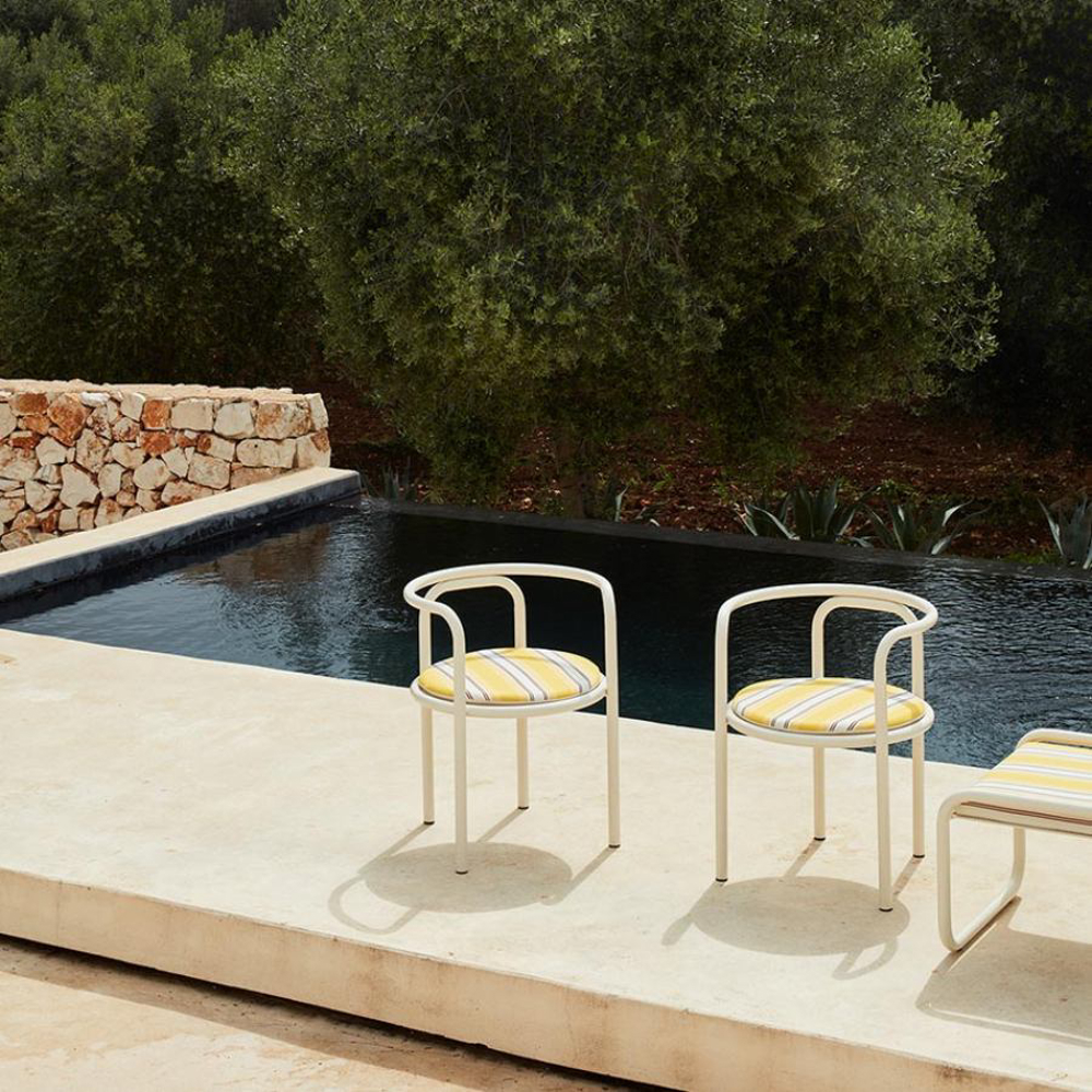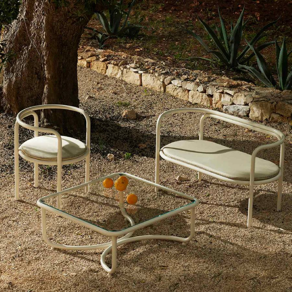 The collaboration spontaneously born between Exteta and Jacquemus brings back the iconic Locus Solus collection from 1964 in an original edition, bearing the prestigious signature of Gae Aulenti. This pop series offers strong lines with a vintage charm, renewed in fabrics and colors through the contemporary vision of designer Simone Porte Jacquemus, who has always been an admirer of Aulenti's work and a devoted collector of her chairs. This capsule collection combines the Italian craftsmanship of Exteta with the bold taste of Jacquemus, Parisian fashion brand with an unmistakable touch.