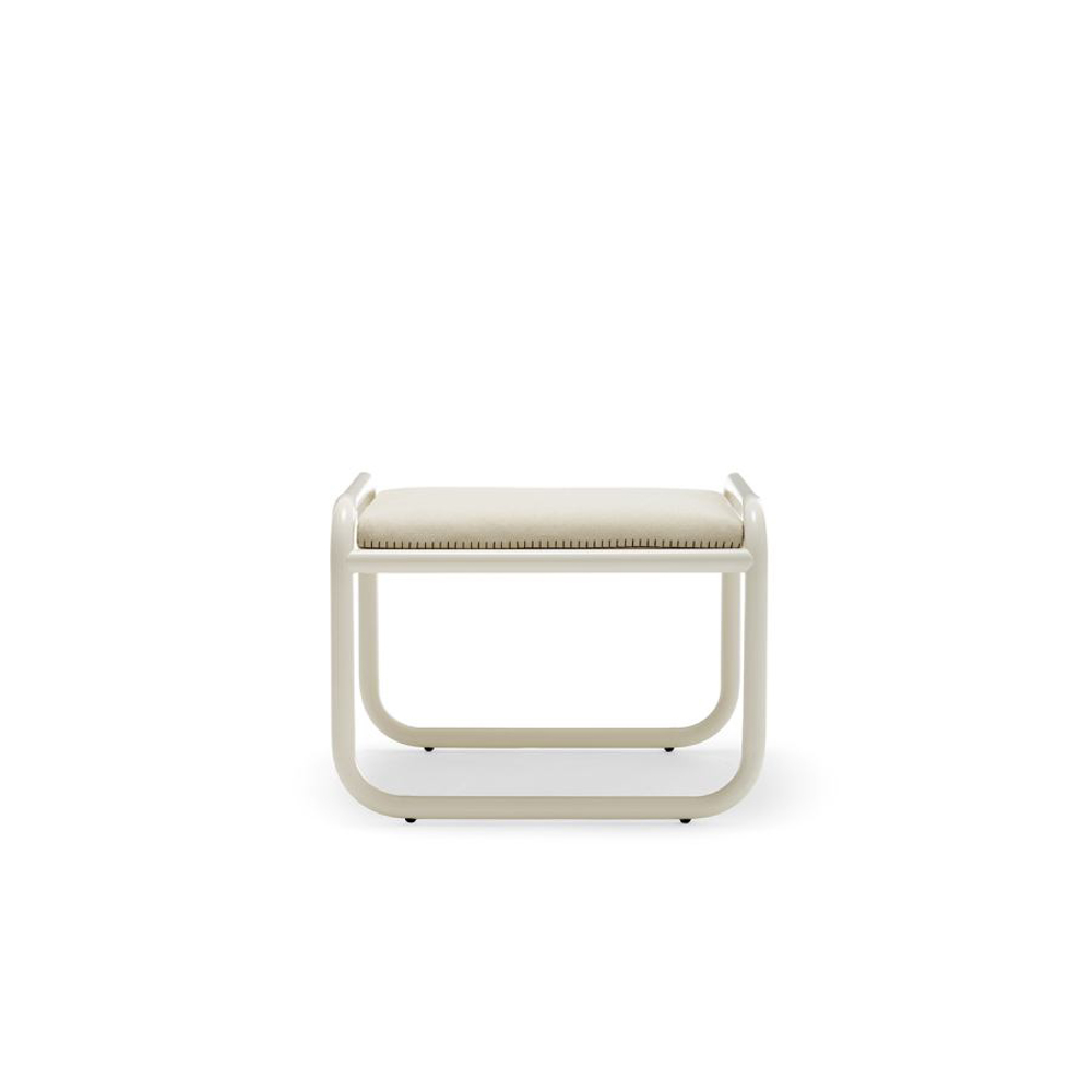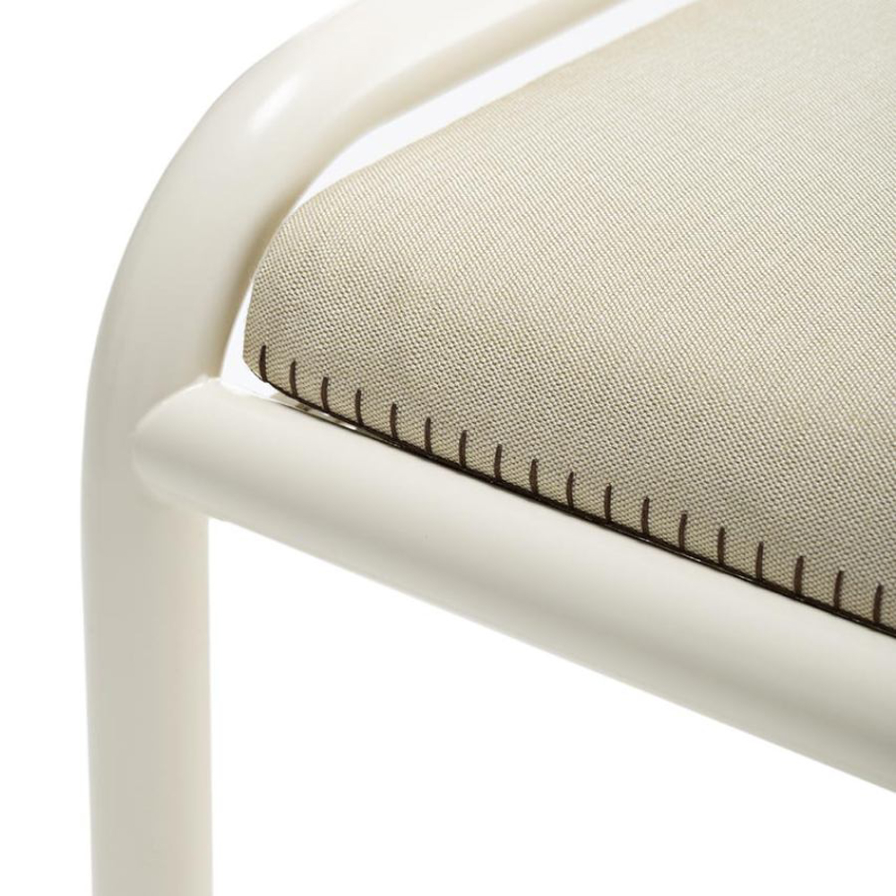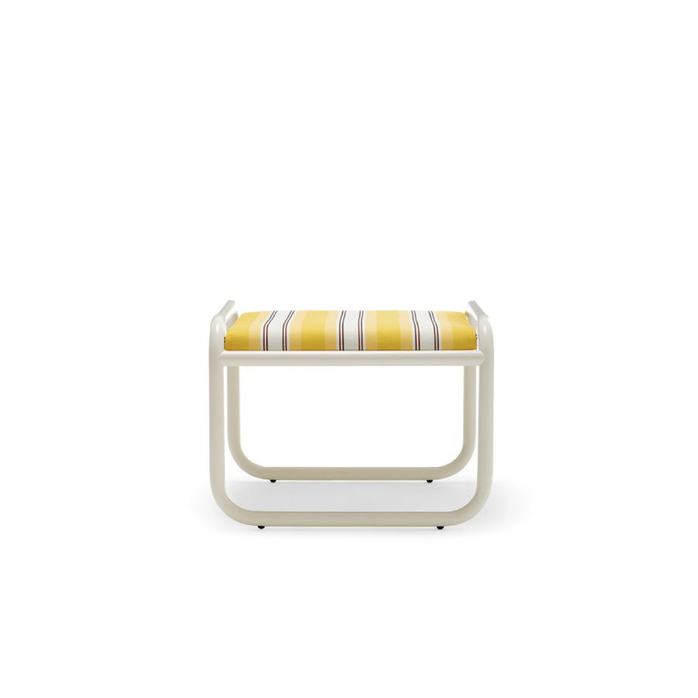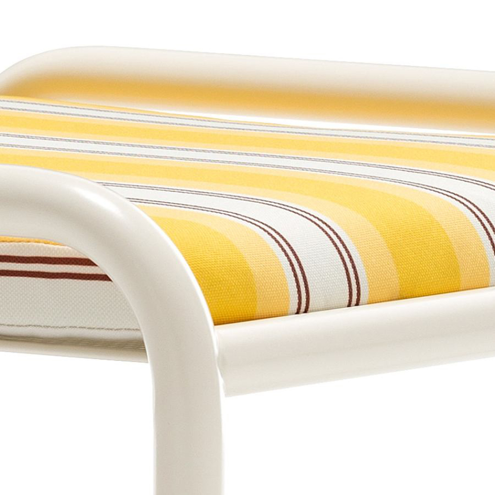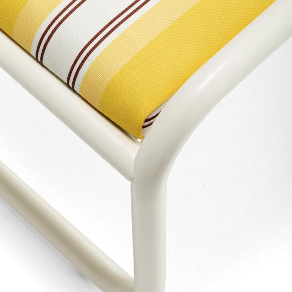 The frame of the Locus Solus Pouf is made of painted stainless steel tubulars. This capsule collection offers an Off-White metal structure with seats available in two versions: yellow-striped or beige fabric with contrasting hand-embroidered details.