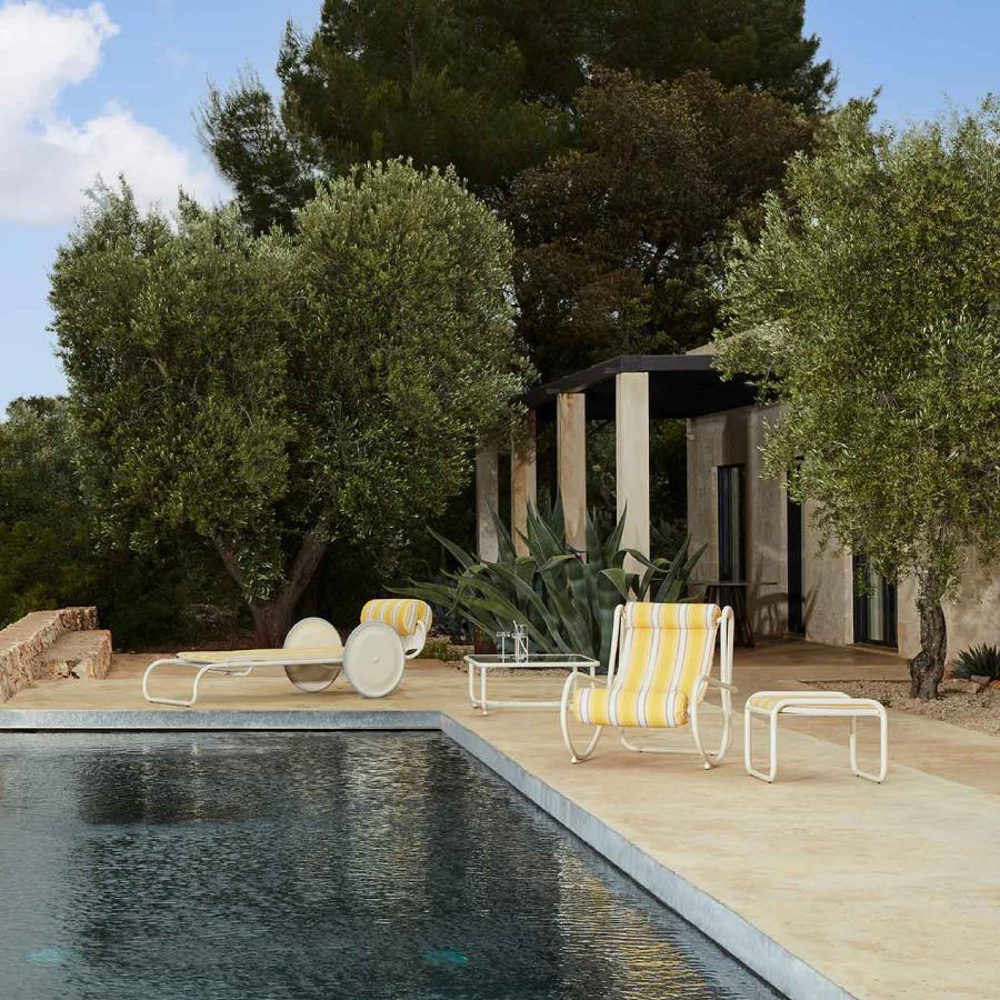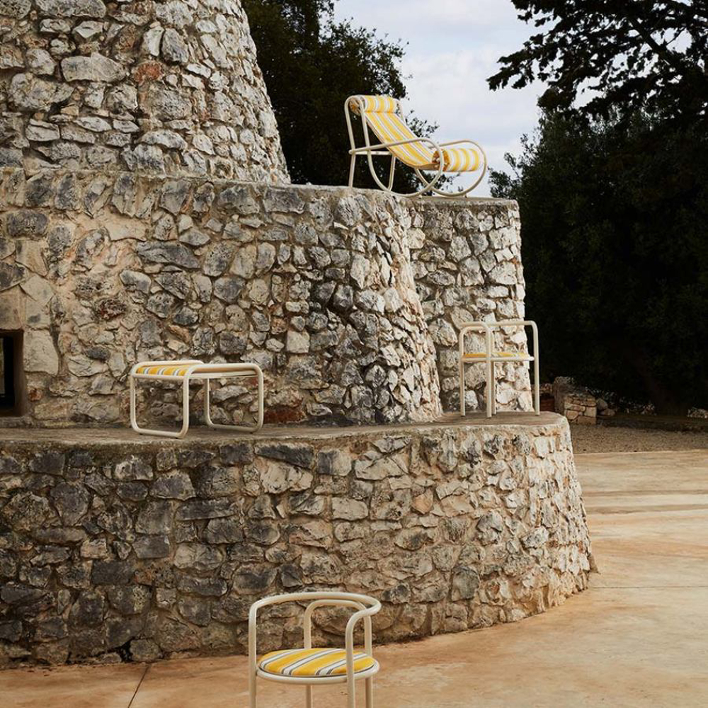 The collaboration spontaneously born between Exteta and Jacquemus brings back the iconic Locus Solus collection from 1964 in an original edition, bearing the prestigious signature of Gae Aulenti. This pop series offers strong lines with a vintage charm, renewed in fabrics and colors through the contemporary vision of designer Simone Porte Jacquemus, who has always been an admirer of Aulenti's work and a devoted collector of her chairs. This capsule collection combines the Italian craftsmanship of Exteta with the bold taste of Jacquemus, Parisian fashion brand with an unmistakable touch.