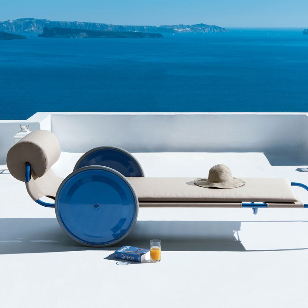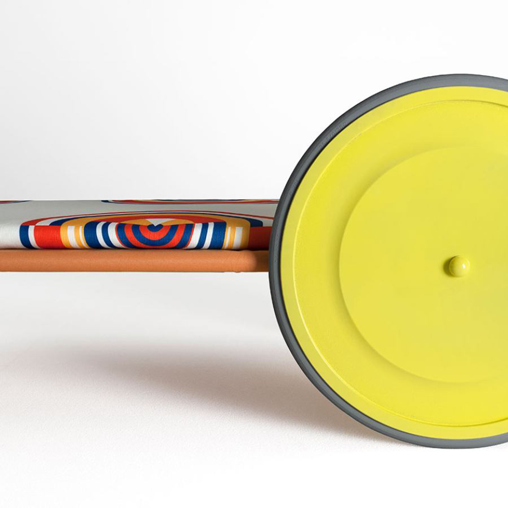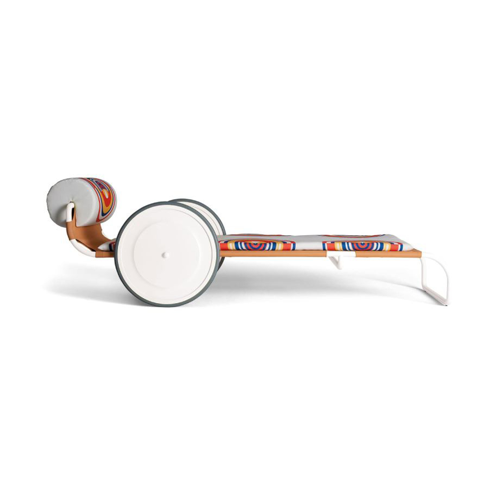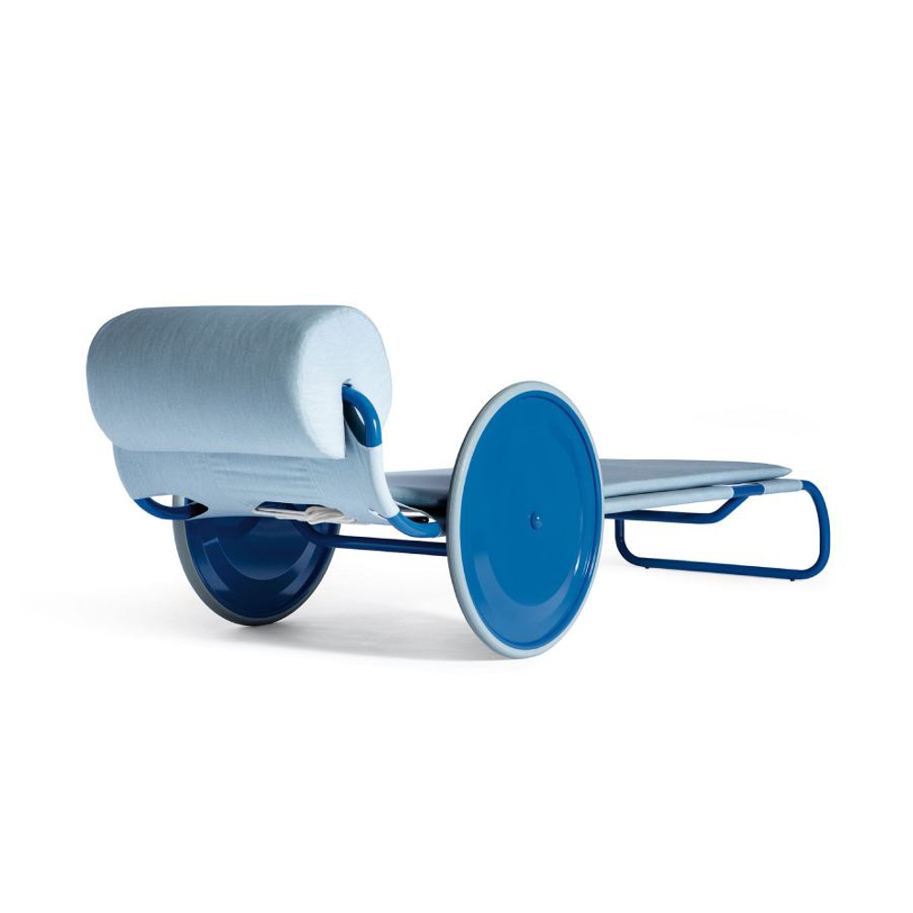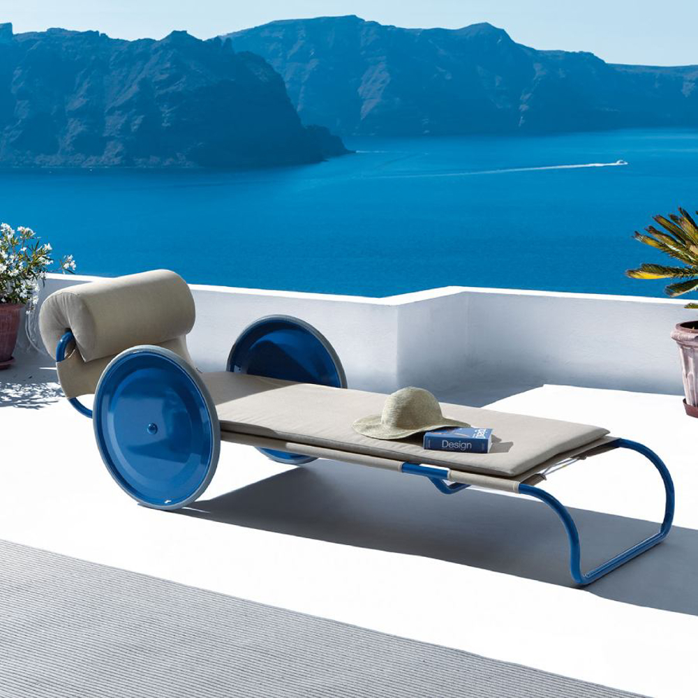 The eccentric painted wheels with their large diameter are the characteristic signature of Locus Solus Sun Longer. In addition to giving it distinct originality, they act as rounded armrests and make it easy to move the sunbed. The frame of the structure frames the seat to offer a perfect union between relaxation and design.