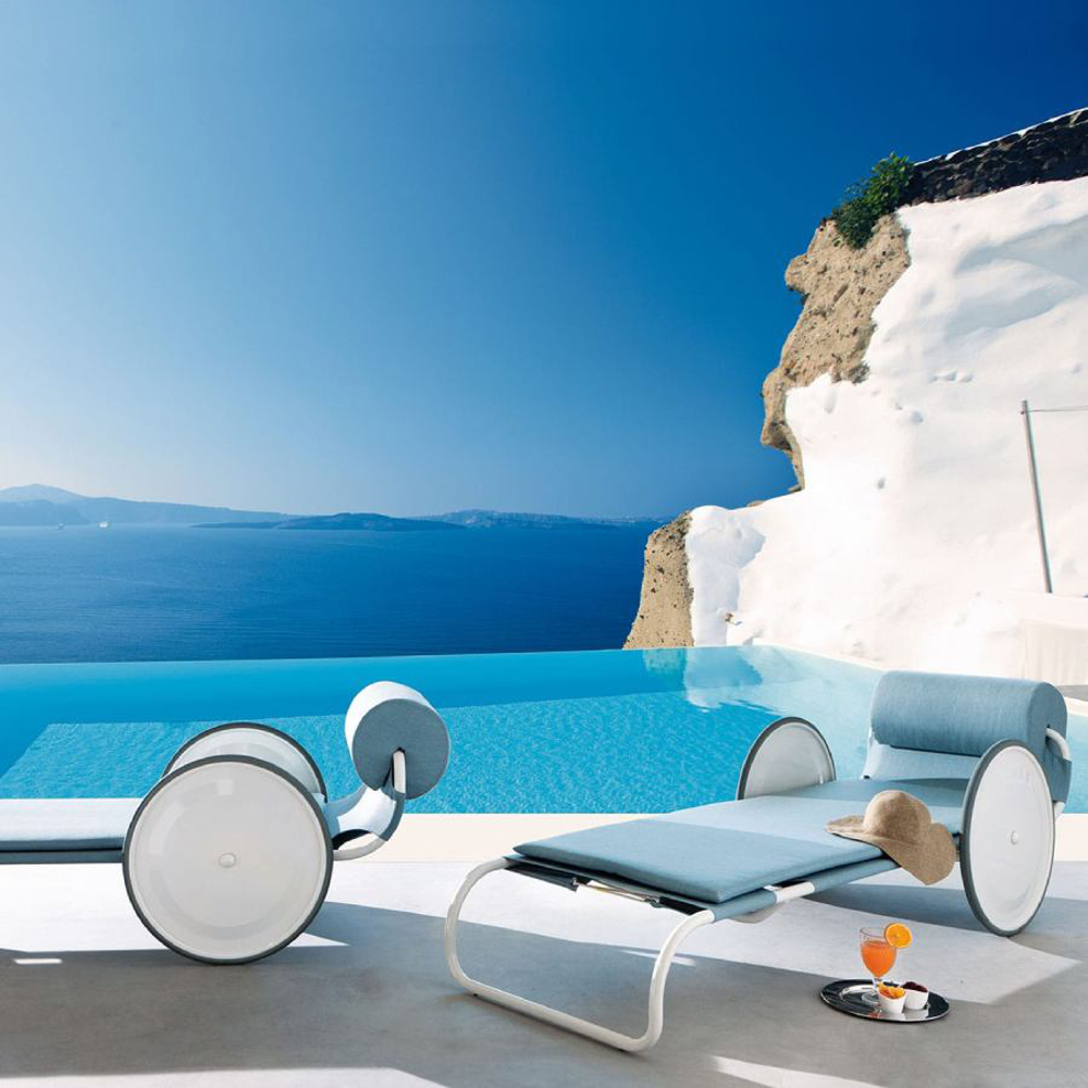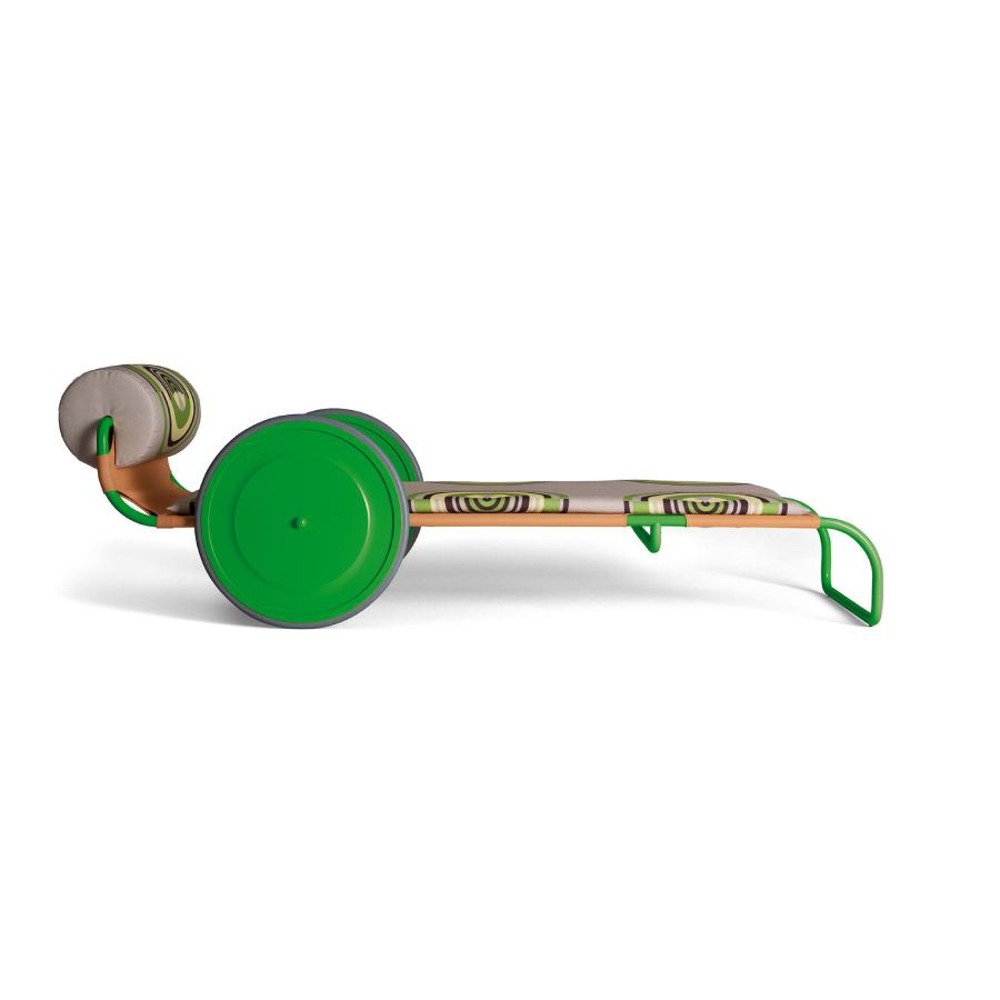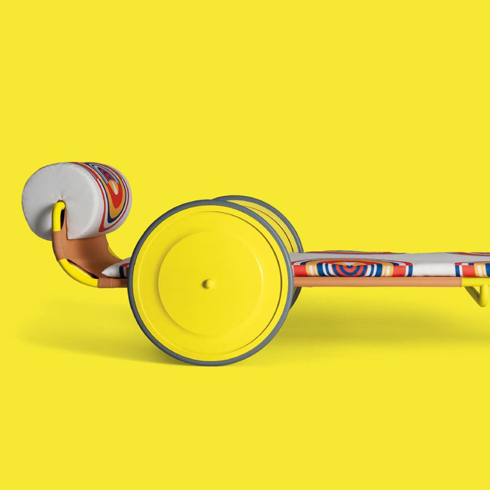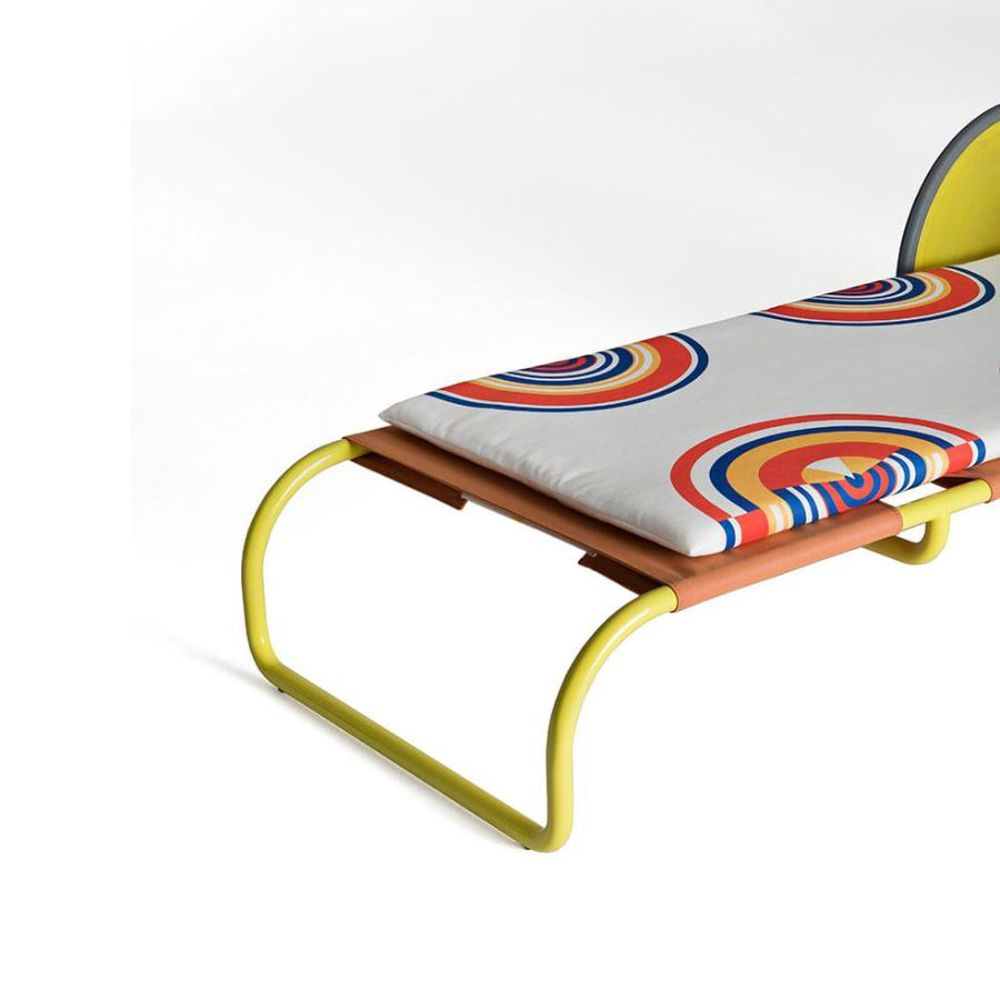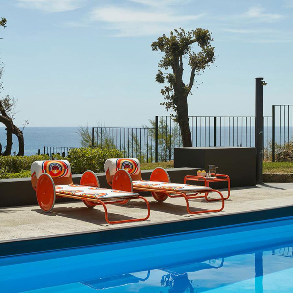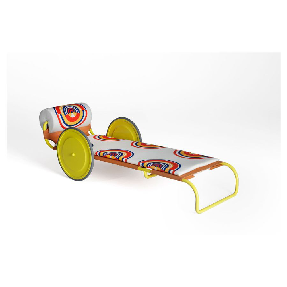 The eccentric painted wheels with their large diameter are the characteristic signature of Locus Solus Sun Longer. In addition to giving it distinct originality, they act as rounded armrests and make it easy to move the sunbed. The frame of the structure frames the seat to offer a perfect union between relaxation and design.