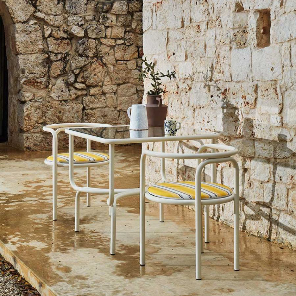 The collaboration spontaneously born between Exteta and Jacquemus brings back the iconic Locus Solus collection from 1964 in an original edition, bearing the prestigious signature of Gae Aulenti. This pop series offers strong lines with a vintage charm, renewed in fabrics and colors through the contemporary vision of designer Simone Porte Jacquemus, who has always been an admirer of Aulenti's work and a devoted collector of her chairs. This capsule collection combines the Italian craftsmanship of Exteta with the bold taste of Jacquemus, Parisian fashion brand with an unmistakable touch.