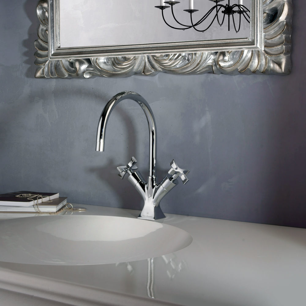 Three holes basin mixer with waste. A transversal design that interprets the classic aesthetic in a modern style. The traditional regenerated cross handle combining decorative research and essentiality. The new faucet collections are a complete proposal inspired by modern and innovative design. The traditional production of the company made using new technologies, shapes, and volumes. The faucets are designed as small sculptures, of strong character, unique in shape, with pure and essential design, reach details; original objects adaptable to any context and place.