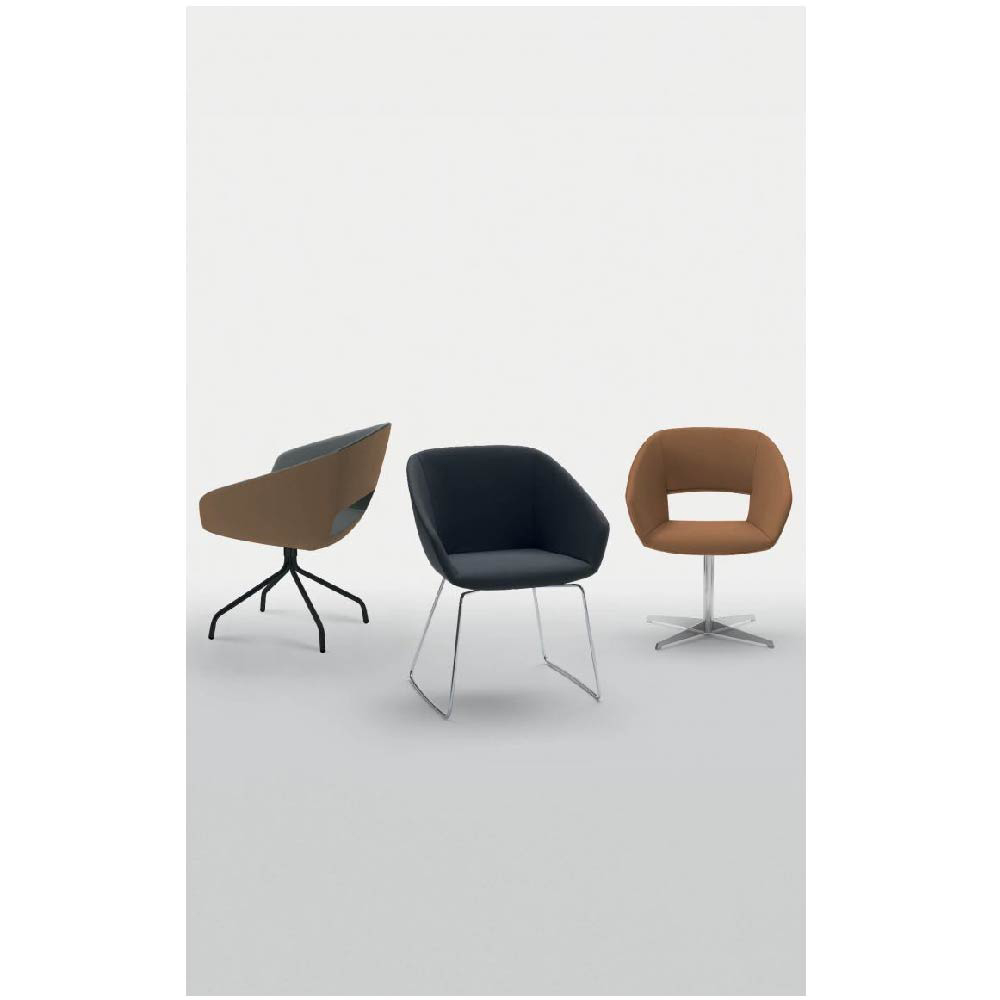 Look Armchair with an open, wide shape, available with metal or wooden bases. An armchair with an open and welcoming design, featuring clean and wide lines.