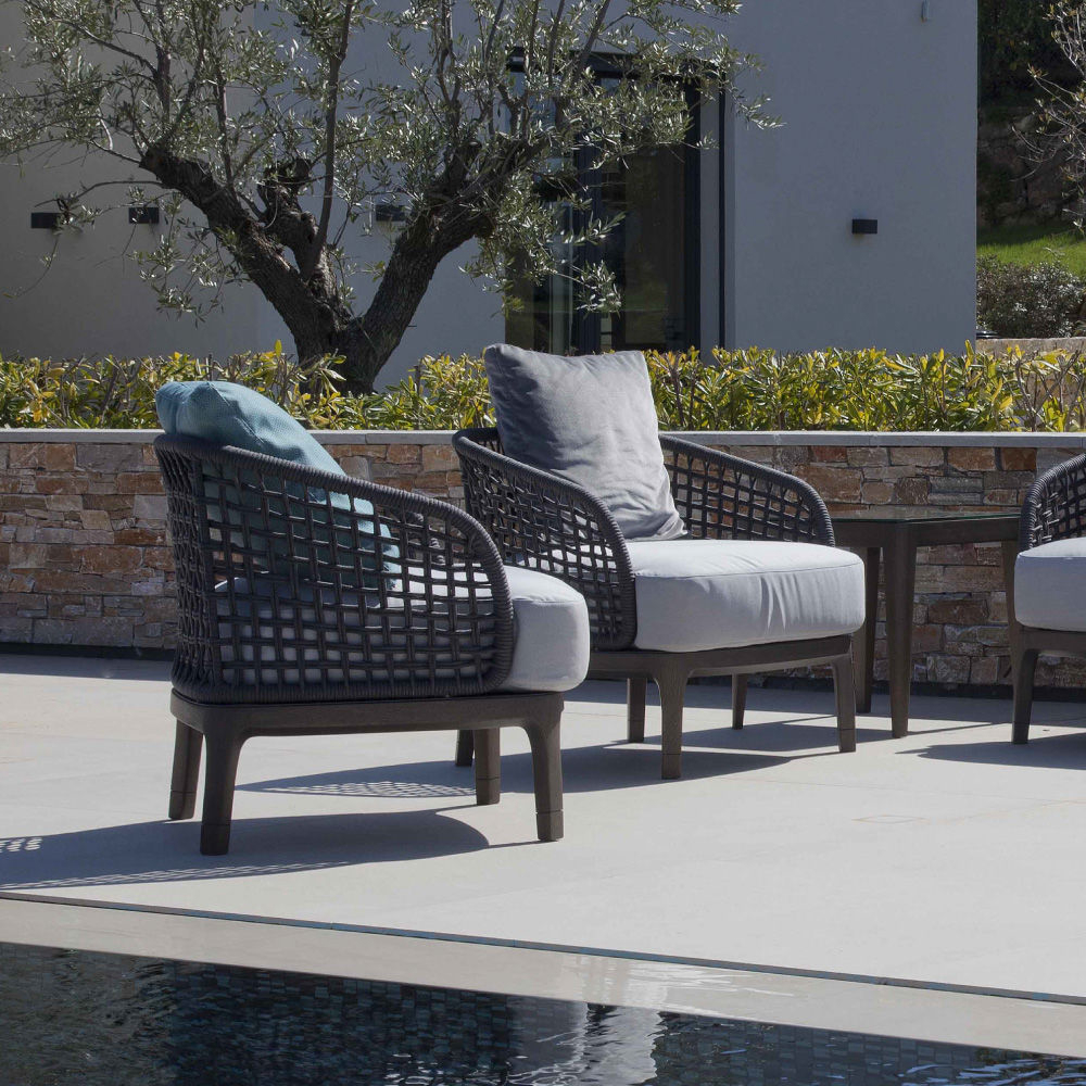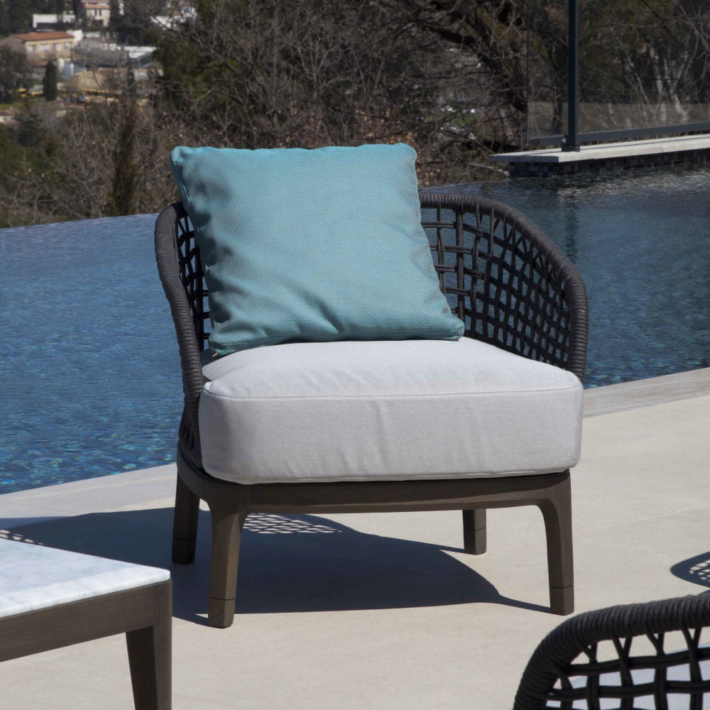 You can choose the texture and color of the cover from a complete collection of waterproof fabrics. Lungotevere outdoor collection comes from the indoor collection: same design but different materials specific for the outdoor use. Base made by IROKO wood, metal structure with interlacing and special waterproof upholstery make Lungotevere sofa suitable for any weather situation. You can choose the texture and color of the cover from a complete collection of waterproof fabrics.