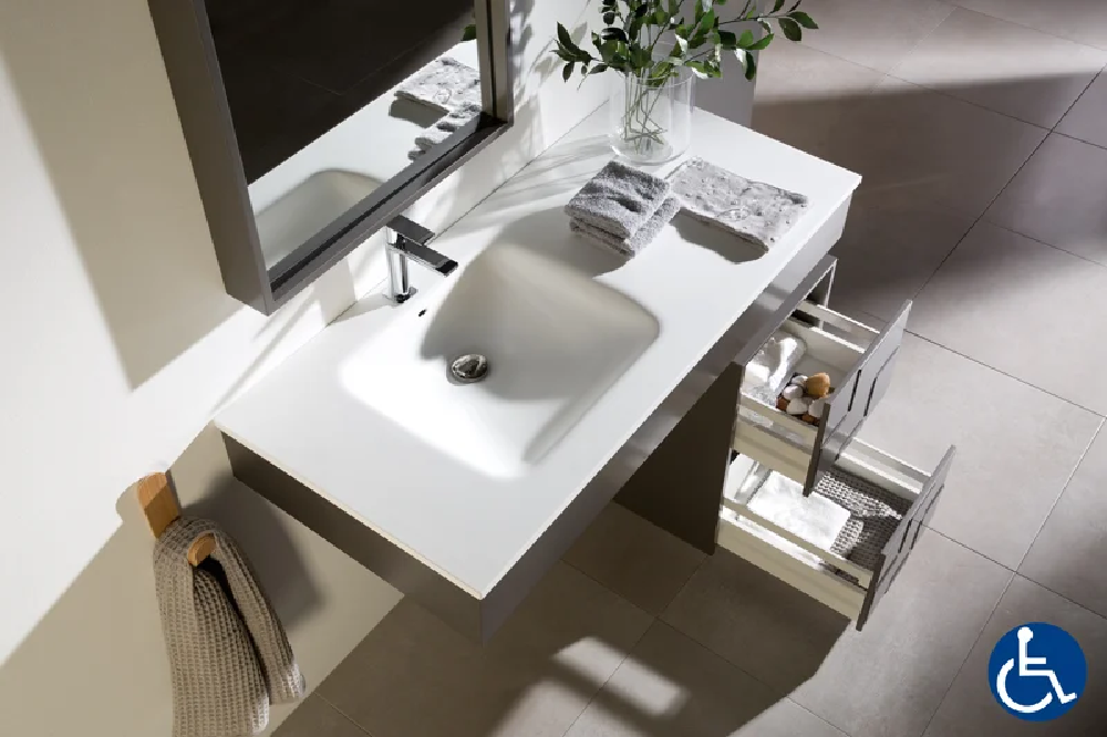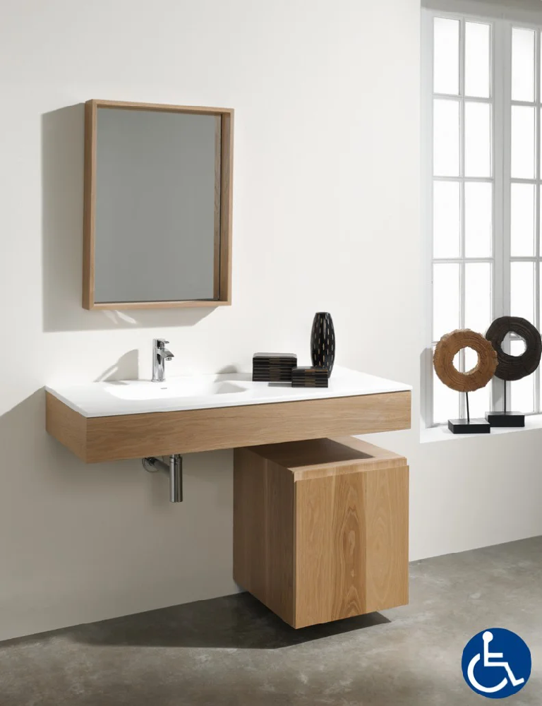 MALMÖ is a collection designed for people who have limited mobility. We studied the market for units designed for people with reduced mobility and found that they were only designed for their technical requirements ignoring the aesthetical design of the unit. In Naxani we wanted to meet both requirements and it was thanks to this that the MALMÖ collection was born. Description of the designer bathroom furniture adapted for PMR Malmö Designed for a person with reduced mobility in a wheelchair, the Malmö bathroom furniture is an aesthetic concept for all bathrooms. This set of 2 pieces of furniture consists of a suspended washbasin support. It measures 54 cm deep and 15.8 cm high with the built-in basin. The width of the vanity top varies from 100 cm to 150 cm. The 2nd piece of designer bathroom furniture adapted for PMR is a module composed of your choice: a large drawer unit with a drawer hidden in the large one; a piece of furniture with 2 drawers of identical dimensions. The offset unit measures 62 cm in height, 40 cm in width and 54.5 cm in depth. Materials and finishes available for this designer bathroom furniture adapted for PMR The designer bathroom furniture adapted for PMR Malmö is available in various finishes. Lacquered wood with a satin, textured or matte finish or even solid American oak wood, the choice is vast. The front of the furniture in lacquered wood finish is original with cubes carved in relief. 10 colors are available from aquamarine to light gray or taupe. Malmö, an exclusive designer bathroom furniture adapted for disabled people by Legnori Furnishing the space of the house with bathroom furniture of character, functionality and design is the credo of the Spanish designer Naxani. With the designer bathroom furniture adapted for PMR Malmö, Legnori achieves its objectives by combining innovation, aesthetics and accessibility. The bathroom furniture from Legnori designers demonstrates the qualities of artisanal cabinetmaking.