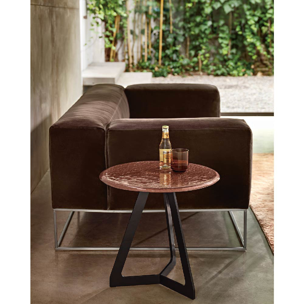 Studio Klass Coffee table with 0.39” fused, back-lacquered glass top with metal paints, or with marble top. Metal painted base available in Lava Grey or metallic Champagne finishes.