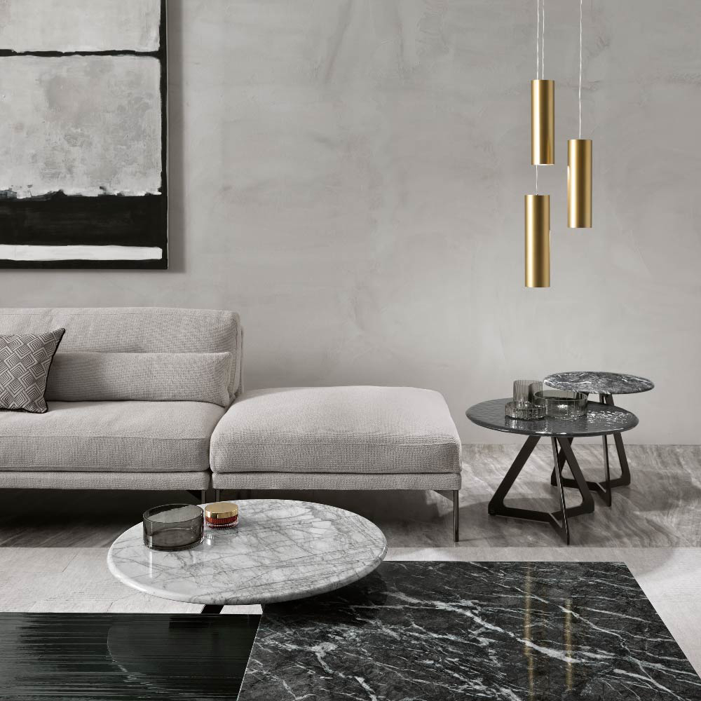 Studio Klass Coffee table with 0.39” fused, back-lacquered glass top with metal paints, or with marble top. Metal painted base available in Lava Grey or metallic Champagne finishes.