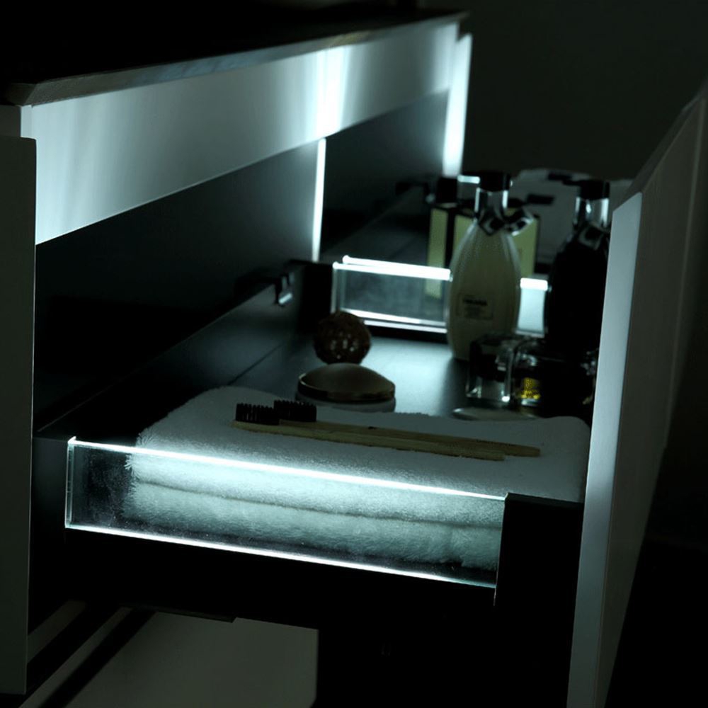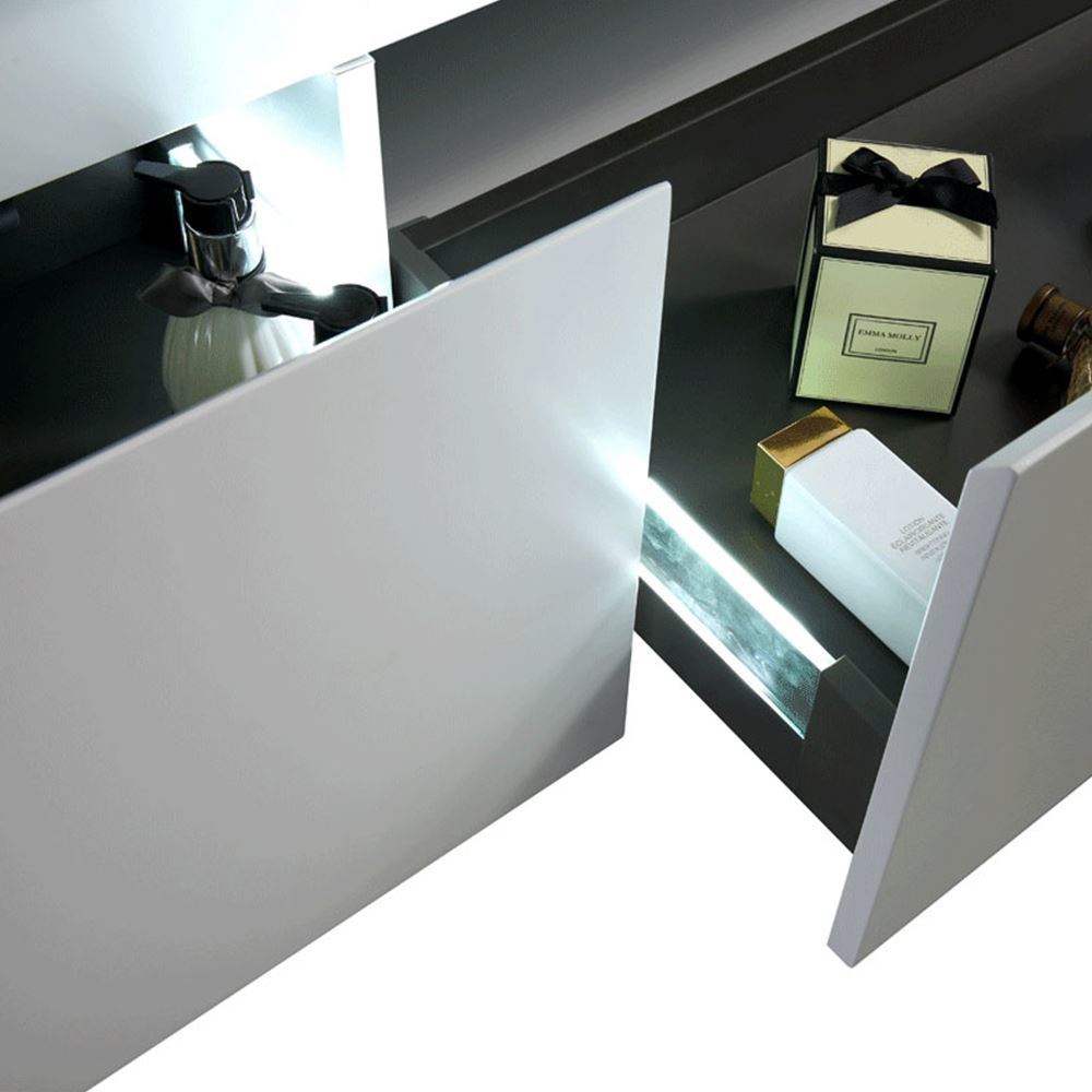 Made from high-quality MDF and MFC materials, 8-level hardness artificial stone basin combination, this double-level vanity will serve you for a lifetime. The rail used is corrosion-resistant stainless steel, with a heavy-duty self-closed sliding feature.
