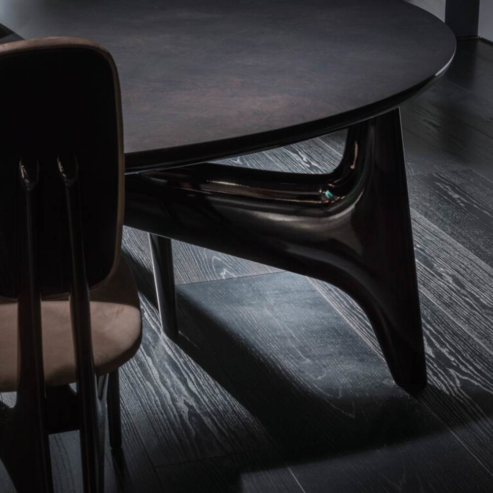 Mémoire is not just a table, it is also a precious object, in which the soft and sinuous shapes intertwine and compose reassuring but not predictable geometries. Looking at it, in fact, the beauty of signs, surfaces and flavors that reinterpret the past comes to mind. And so each of its curves becomes almost a caress and envelops the user like a sweet, graceful and welcoming hand. At the Salone it is presented with the top in gray stained ash root and in the round version.