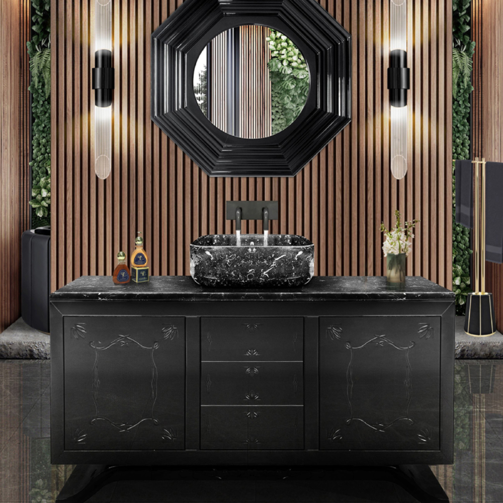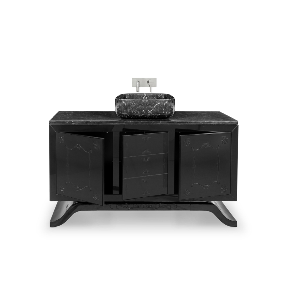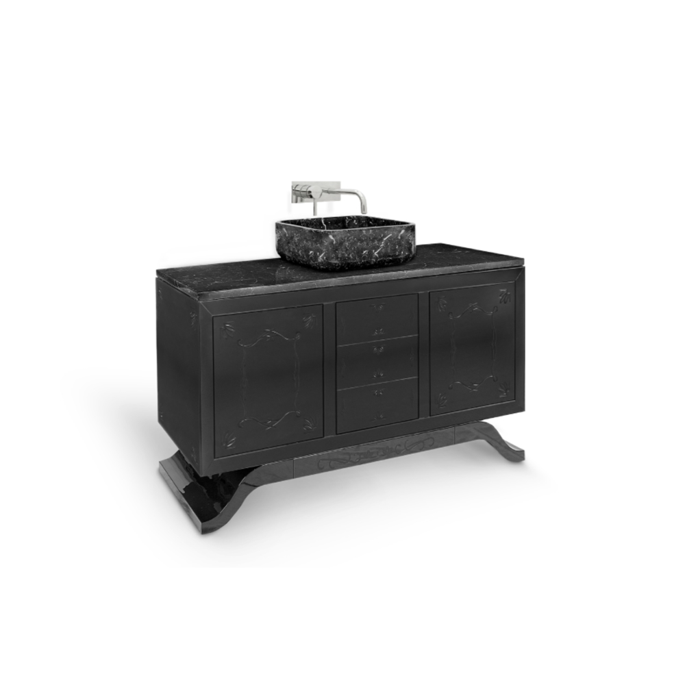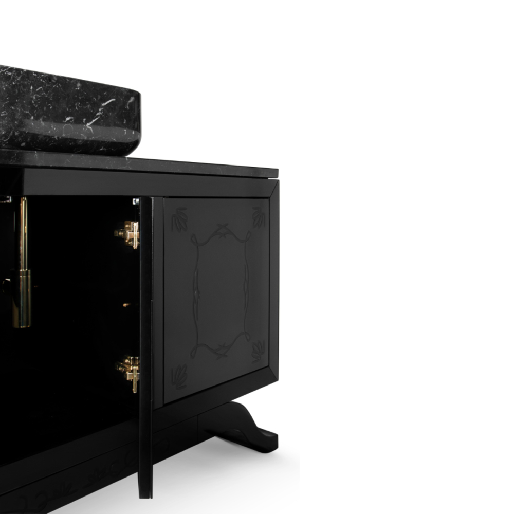 Structure: Wood with black lacquered hand-carved mirror on top; Top: Nero Marquina Marble Sink: Nero Marquina Marble Feet: Black Lacquered High Gloss Varnish; Water drainage: Wall