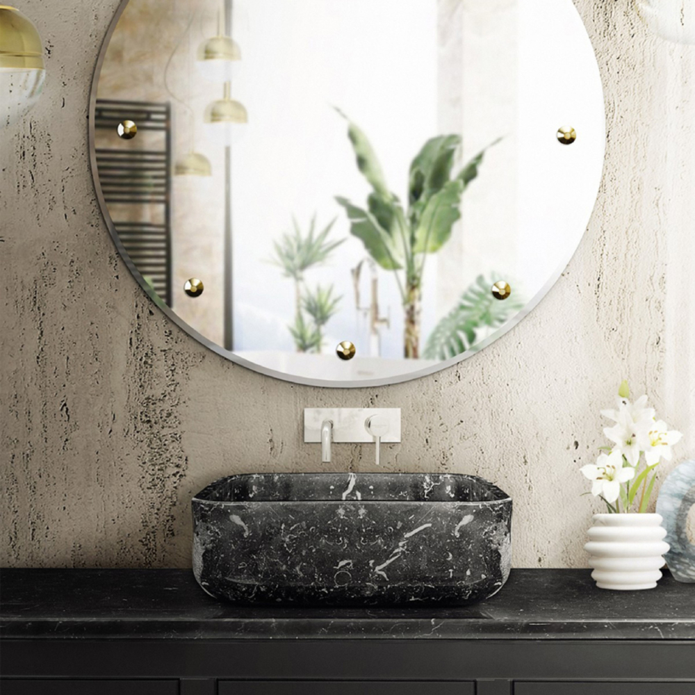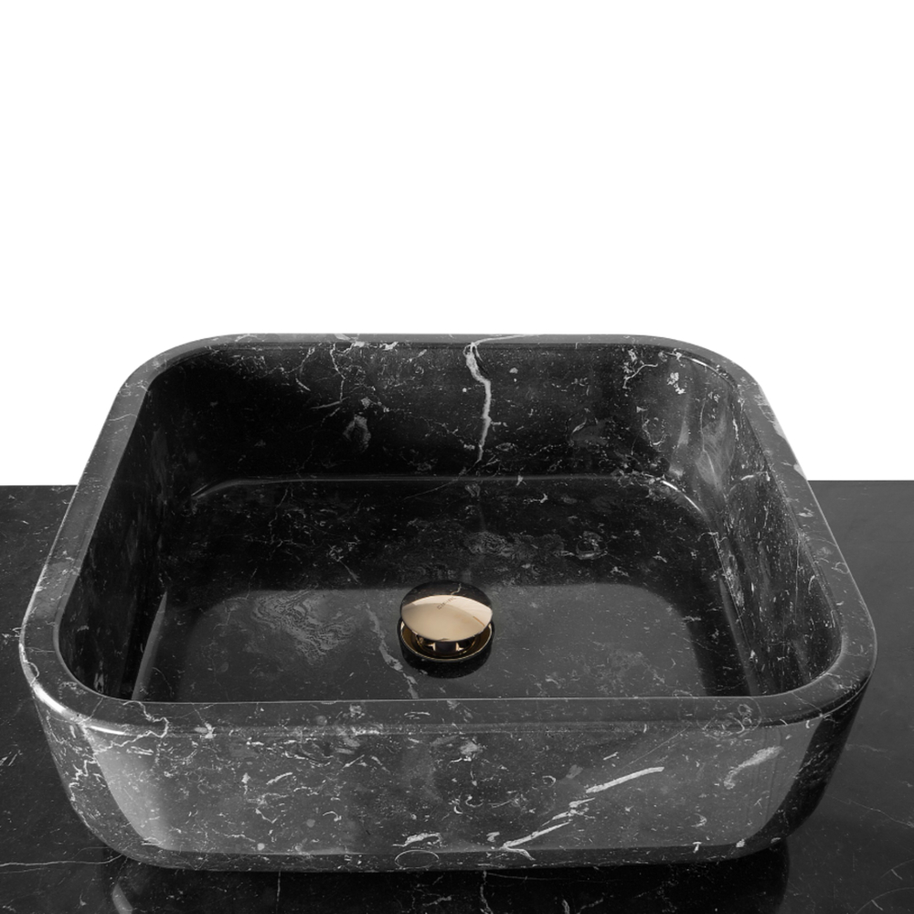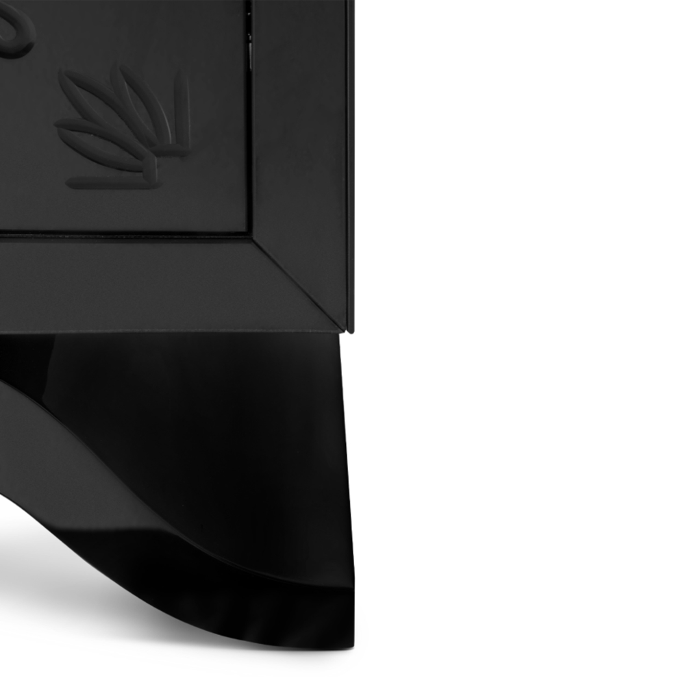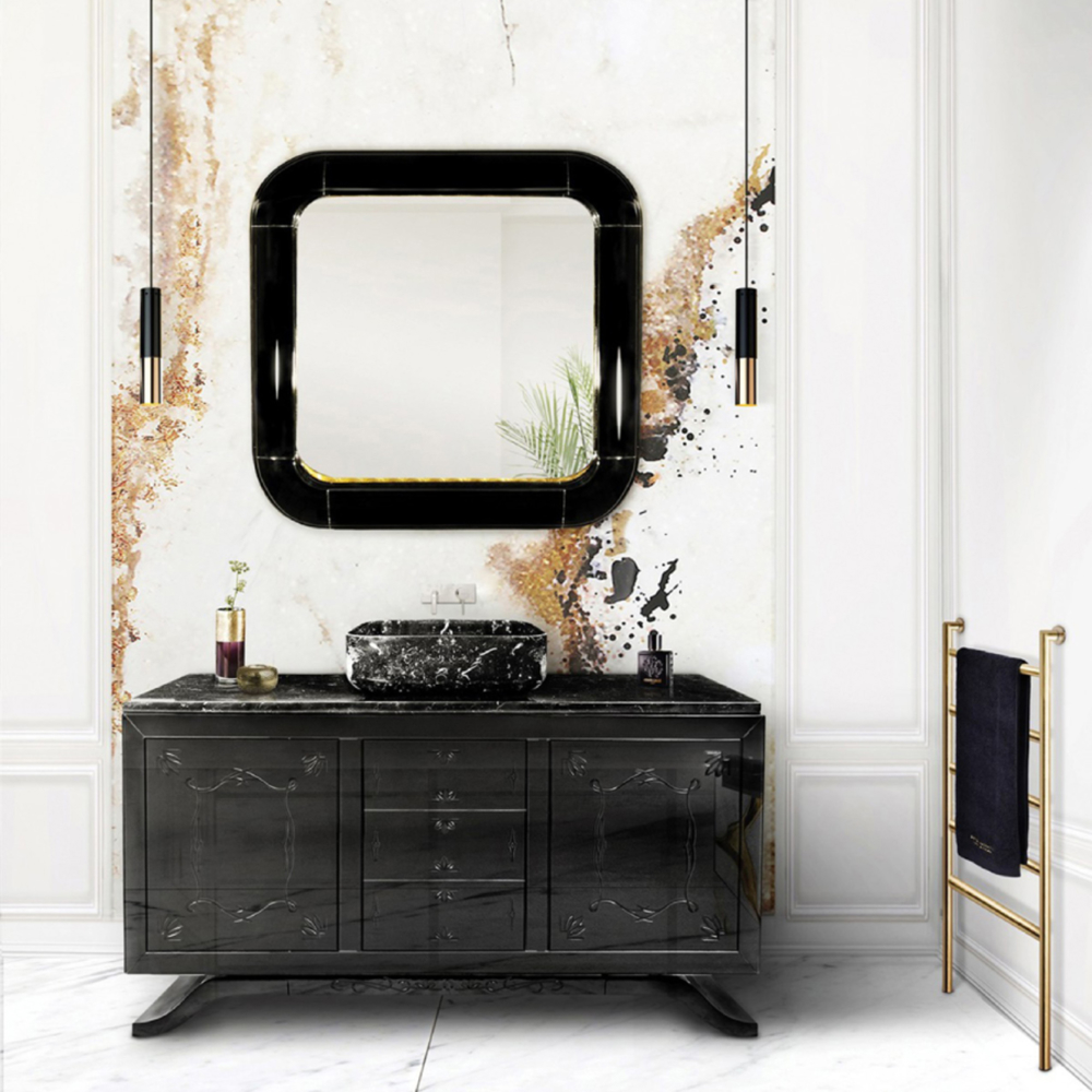 Structure: Wood with black lacquered hand-carved mirror on top; Top: Nero Marquina Marble Sink: Nero Marquina Marble Feet: Black Lacquered High Gloss Varnish; Water drainage: Wall