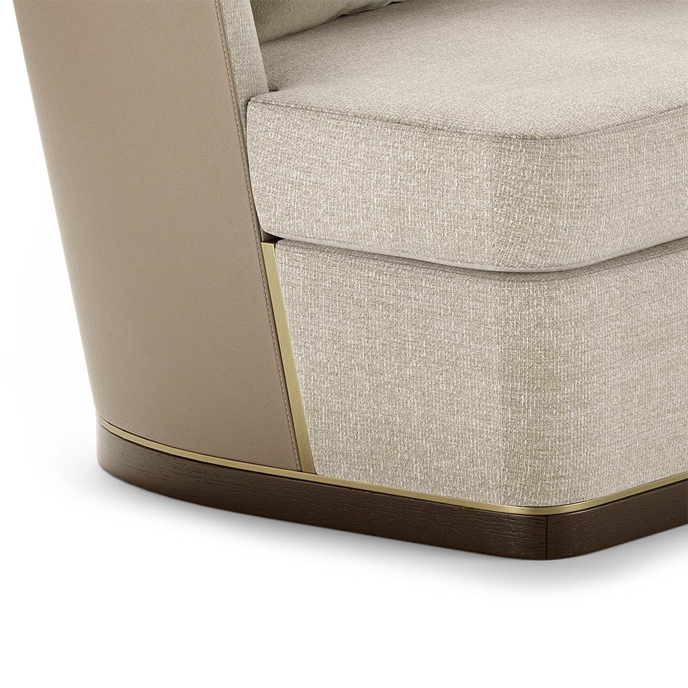 Materials and Finishes: Moka Oak Stain Matte Wood, Fabric and Brushed Brass
