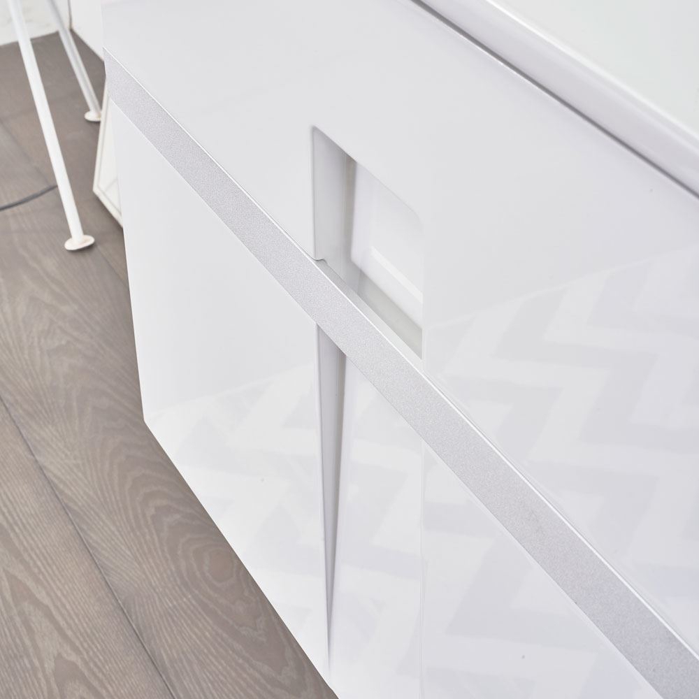 This contemporary single Mino Glossy White bathroom vanity is designed for people, who seek more than a modern and clear design. Perfect shaped corners, integrated handle and a specific rectangular shape woodcut in the middle accentuate the aesthetic style of this vanity.