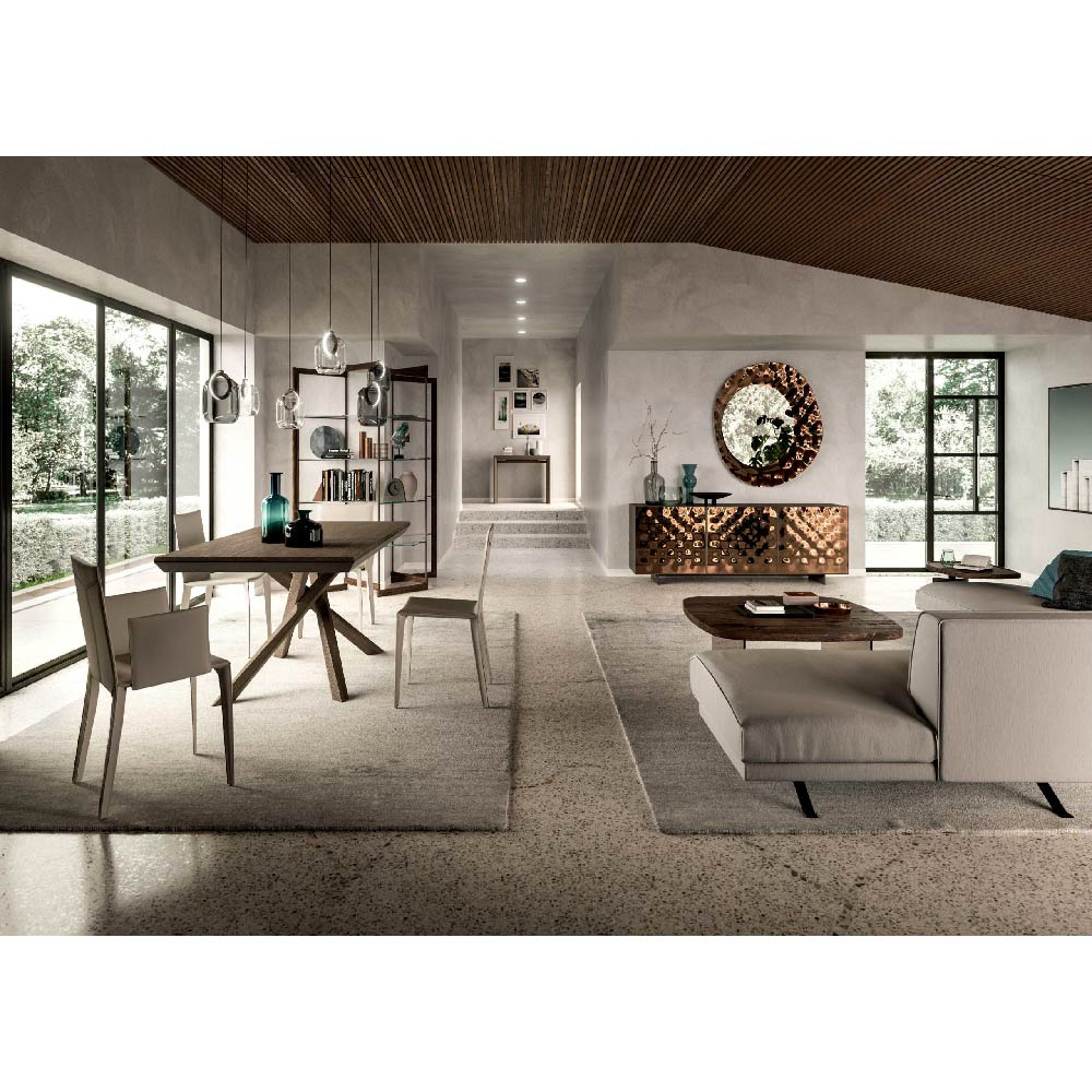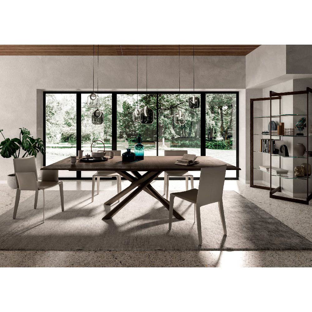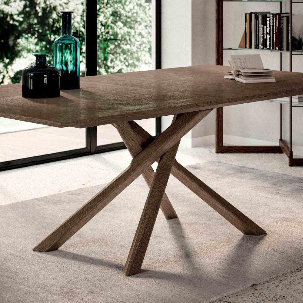 Extendable dining table with wooden base, wooden tops and extensions with sliding metal guides. Height-adjustable feet.