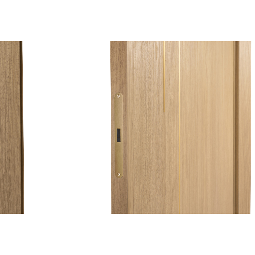 The Modern White Oak Interior Door with 2 Vertical Brushed Gold Aluminum Lines features two slim vertical aluminum inlays seamlessly integrated into the door surface. These metallic accents introduce a subtle architectural detail, adding a modern and sophisticated contrast that enhances the door’s contemporary design.