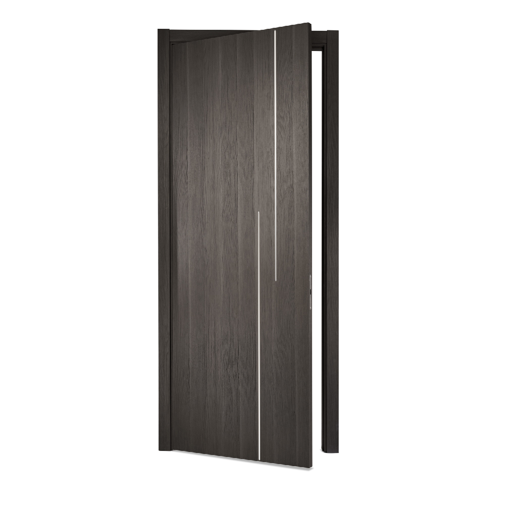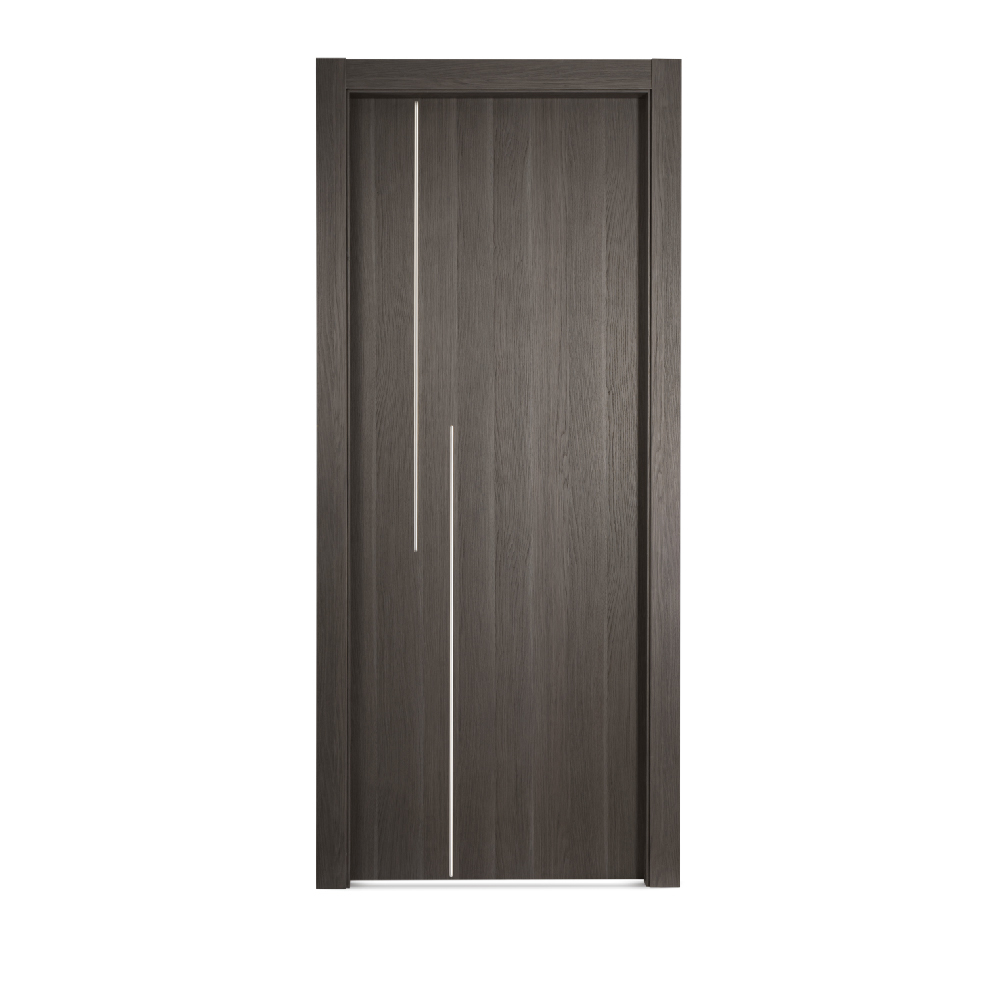Gray Interior Door with 2 Vertical Brushed Titanium Aluminum Lines is a premium prefinished wooden interior door designed to bring contemporary elegance and functionality to both residential and commercial spaces. Featuring a refined Rovere Gray wood texture and advanced Made in Italy surface technology, this modern gray interior door offers exceptional durability, scratch resistance, and long-lasting performance. The sophisticated neutral gray finish blends effortlessly with modern, minimalist, and contemporary interiors, making it an ideal choice for modern homes, apartments, offices, and commercial environments.