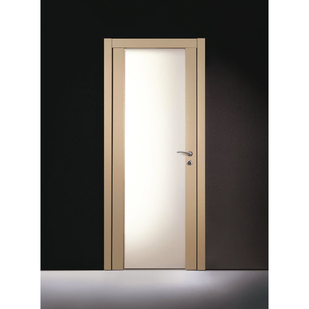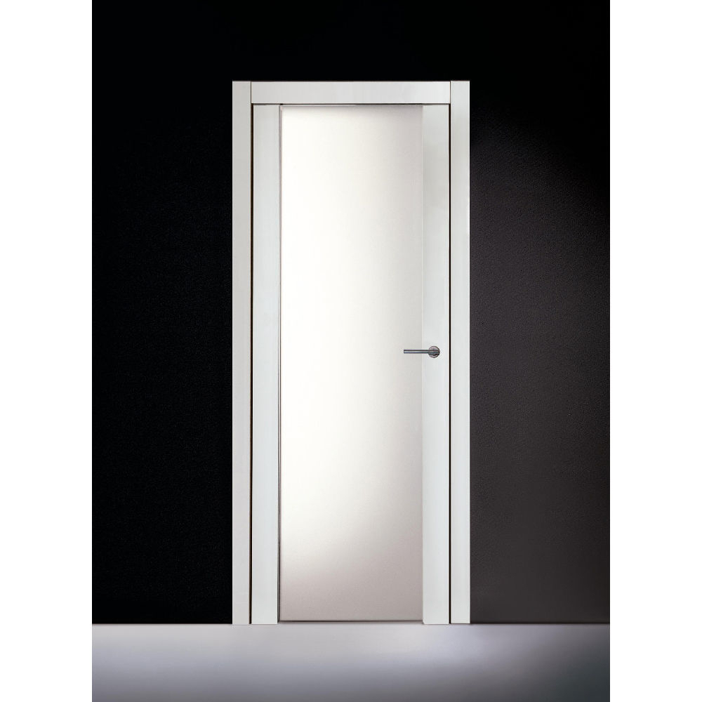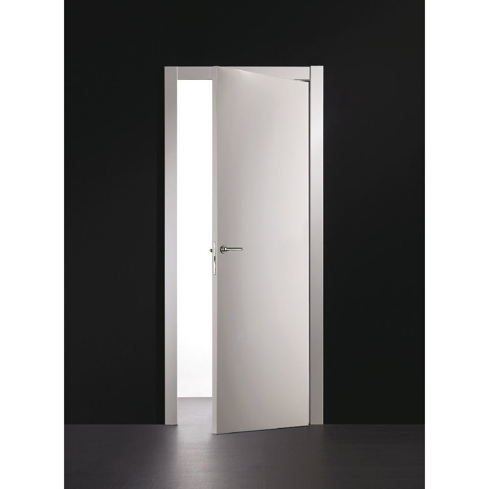 Internal door with door post and trims to be installed on wooden subframe. Plain panel, thickness 42 mm, opening by turning on a vertical axis, veneered or lacquered hinged on the squared section. Three axis adjustable concealed hinges; lock 50 mm backset, magnetic wc lock (key or cylinder on demand).