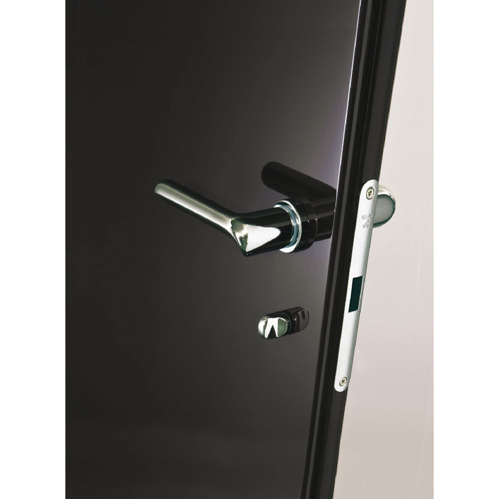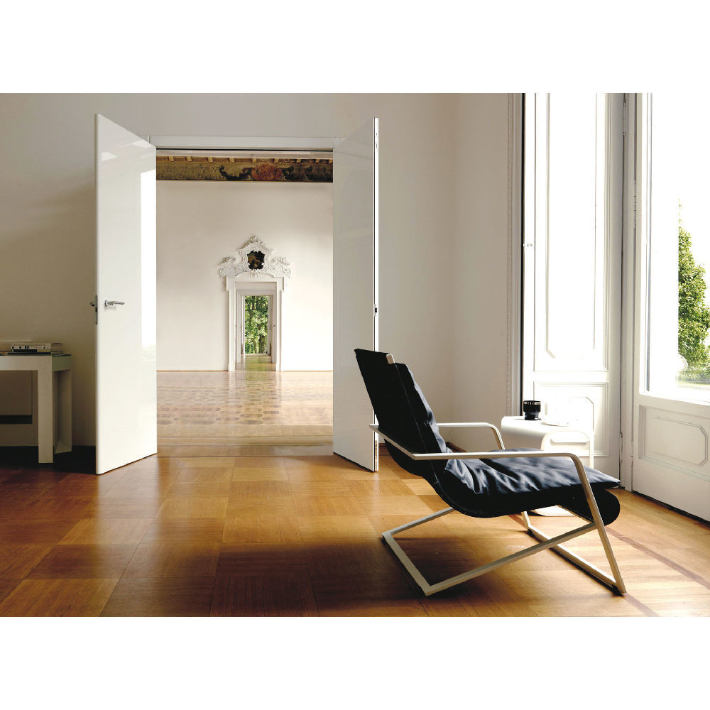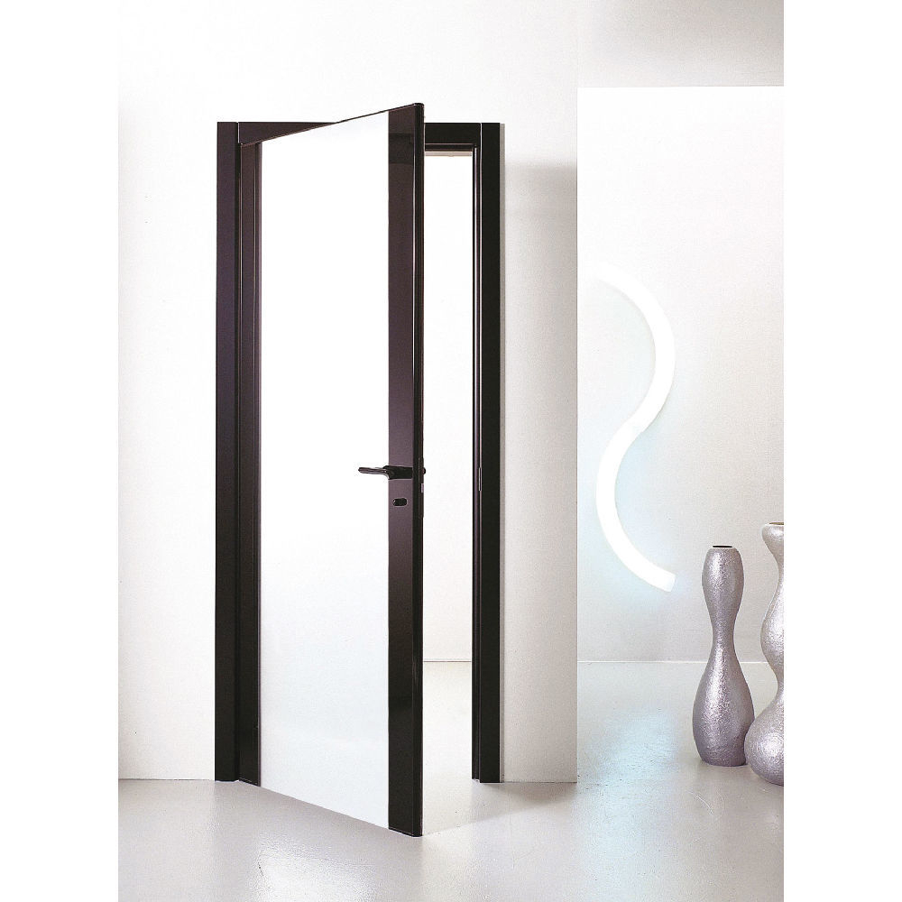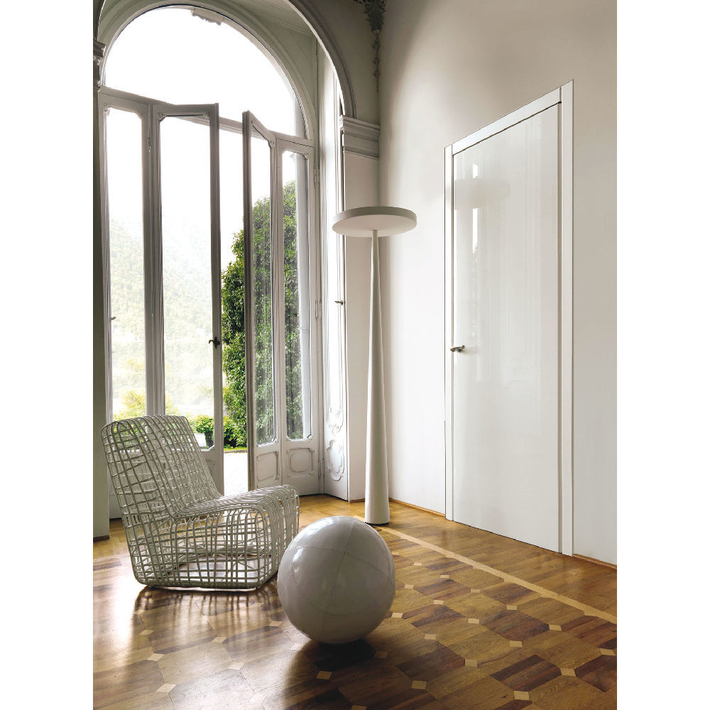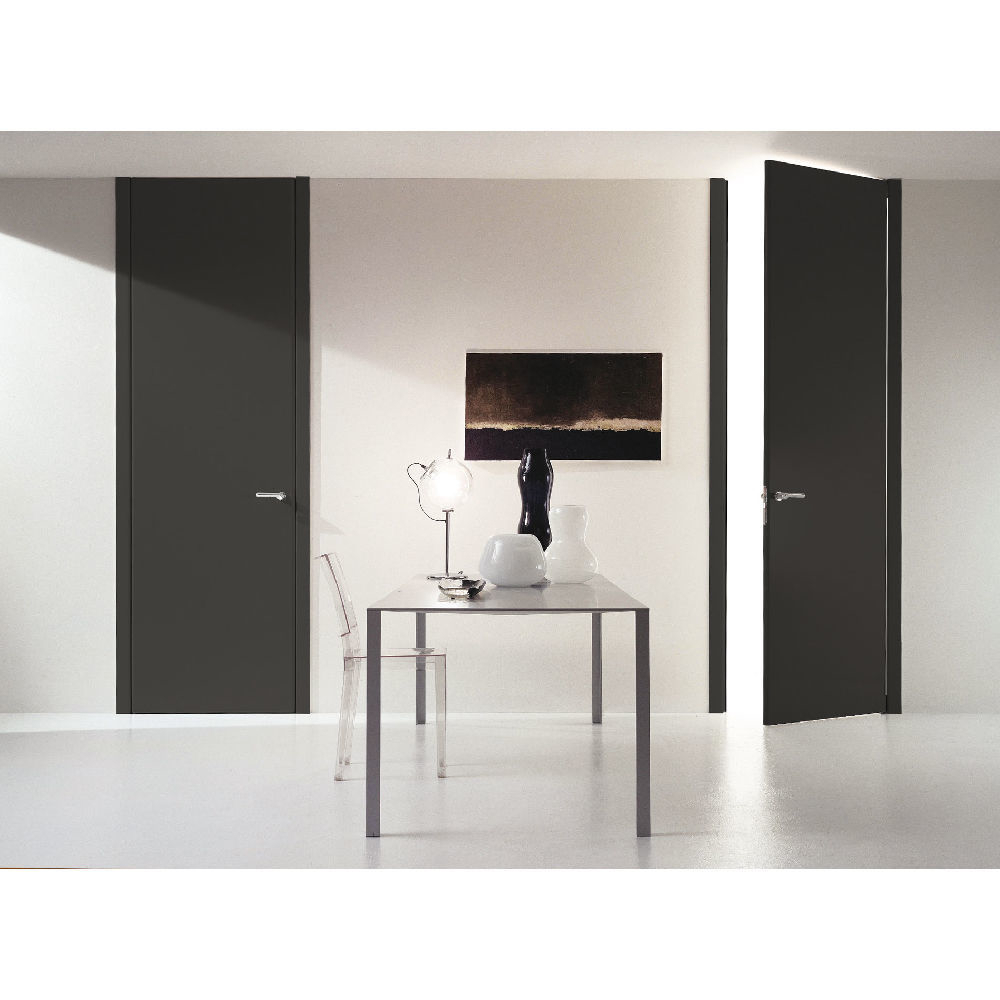 Plain panels, thickness 42 mm, opening by turning on vertical axes with round shape. Frame with rounded trims, lacquered glossy or matt. Door gasket; two hidden, reversible and patented hinges in zinc-burnished metal, specific lock, 70 mm backset, magnetic privacy lock, predisposition with double hub or cylinder with key on request.