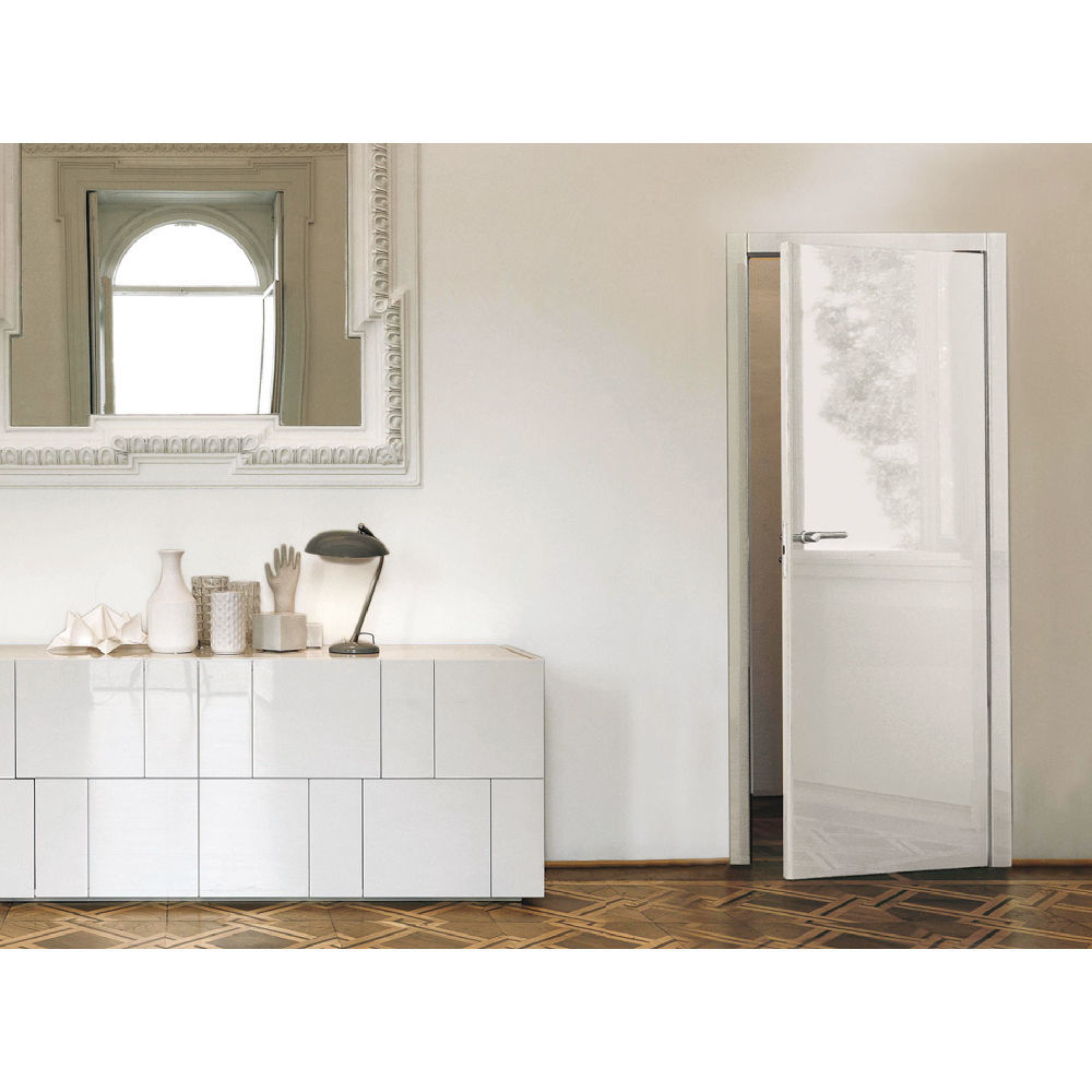 Plain panel, thickness 42 mm, opening by turning on a vertical axis with round shape. Frame with rounded trims, lacquered glossy or matt. Door gasket; two hidden, reversible and patented hinges in zinc-burnished metal, specific lock 70 mm backset, magnetic privacy lock, cylinder with key on demand.