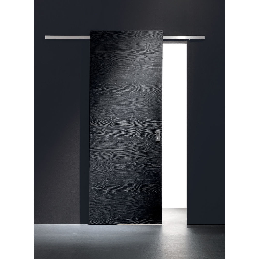 Sliding outside the wall door with specific track. Sliding plain panel, 46 mm thickness, veneered or lacquered with square section. Polished steel finish track with soft-closing mechanism. Specific handle.