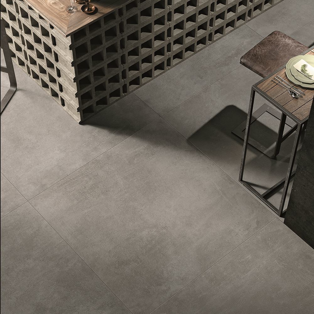 This concrete-look light gray porcelain tile is suitable for commercial and residential floor and wall installations.