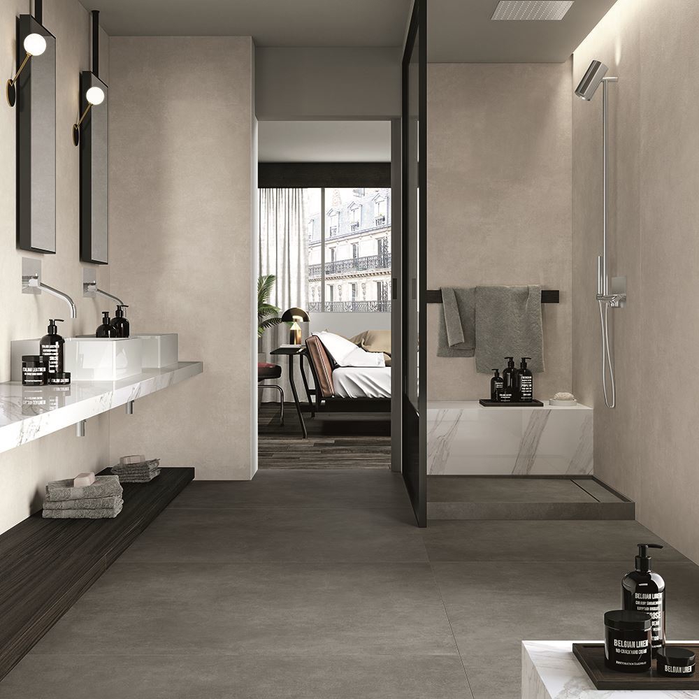 The perfect light gray porcelain material used for this tile production allows every designer and constructor to configure and customize the spaces following specific stylistic and furnishing needs.