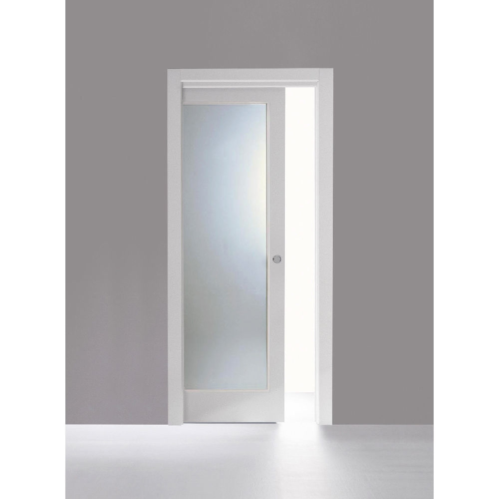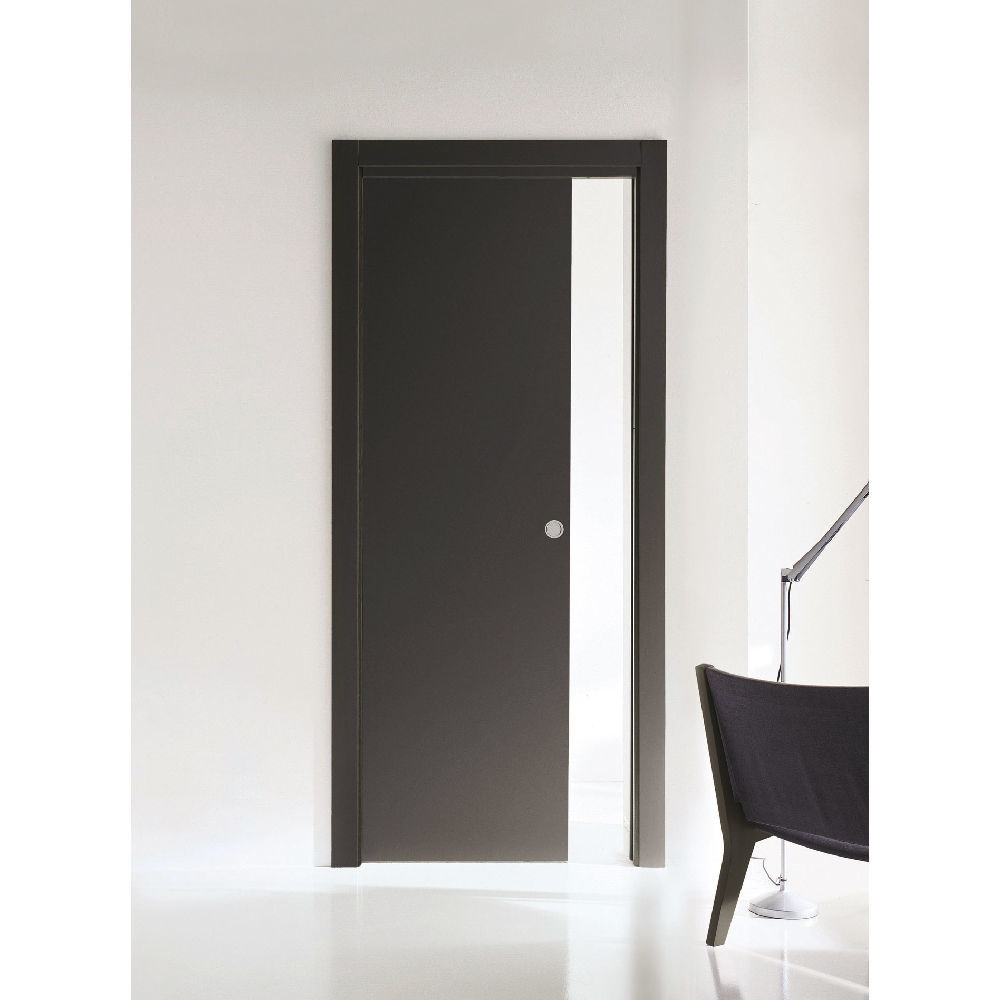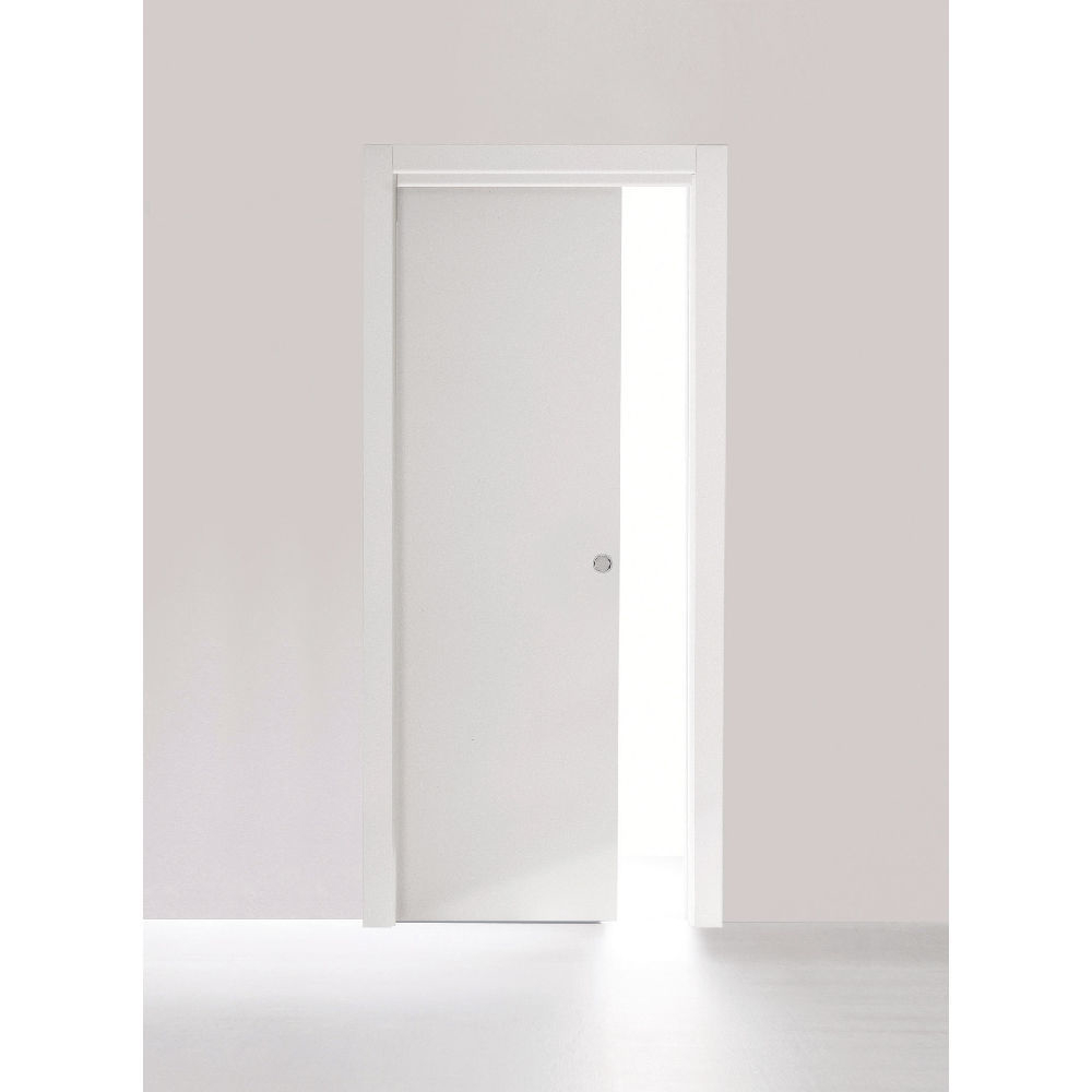 Internal door with panel and frame to be installed in a metallic case (not included). Solid honeycomb door, 42 mm thick, can be opened with sliding movement, veneered or lacquered with square section stop. Hook lock, 50 mm backset.