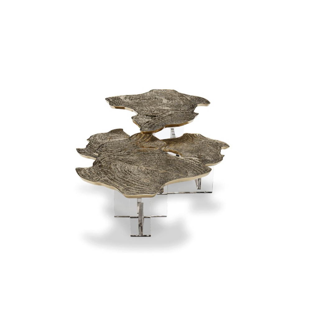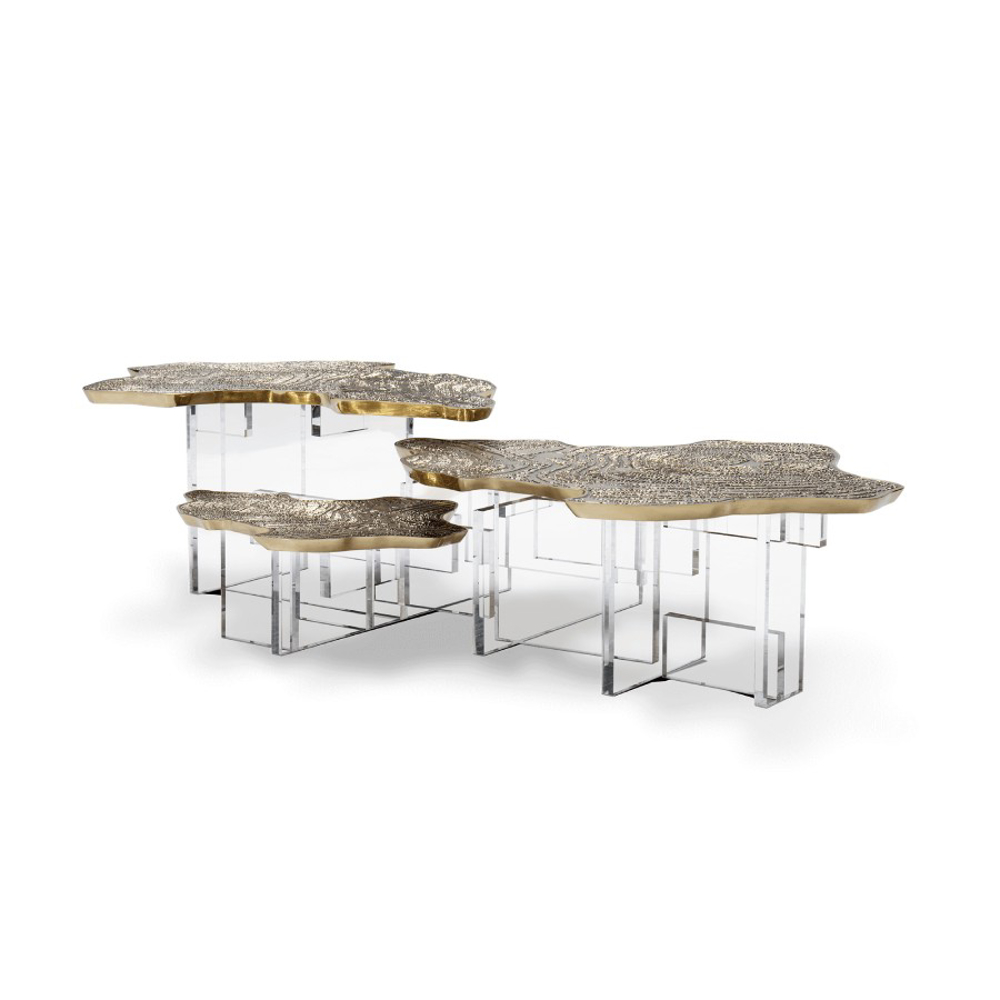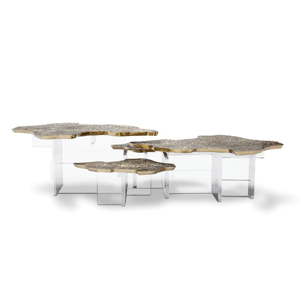 Monet is a tribute to the renowned French painter behind the Impressionism movement, and artwork that turns into a contemporary coffee table with a modern design twist. Innovatively depicting nature, the Water Lillies series are gently brought to life in an elegant coffee table with a gold surface made from cast brass with a unique textured finish. Featuring both contrasting shapes and materials, as the unconventional compositions of the artist, the contemporary coffee table is supported by a geometric acrylic base, allowing to capture natural light. An immersive exceptional object, the Monet coffee table is perfect for cutting-edge living rooms