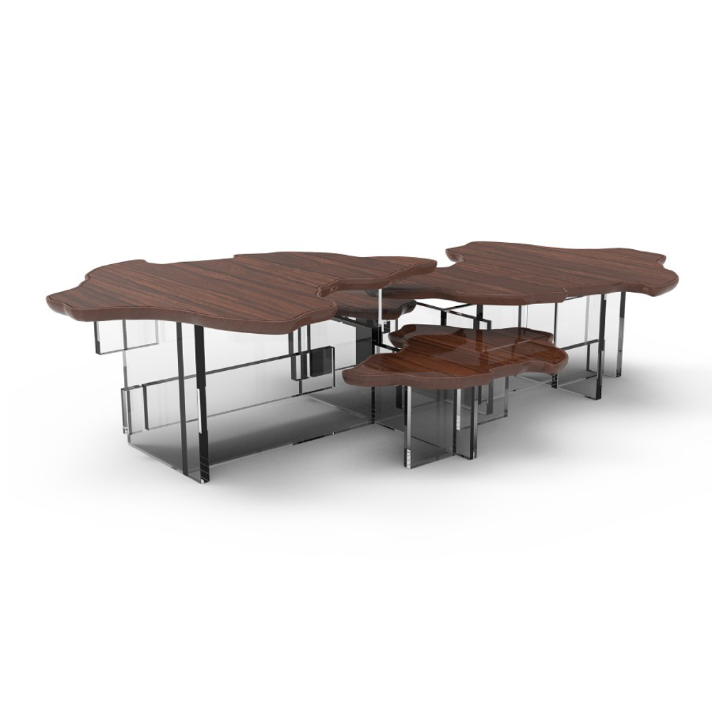 Contemporary coffee table with a geometric acrylic base, and a glossy pau santo veneer table top.