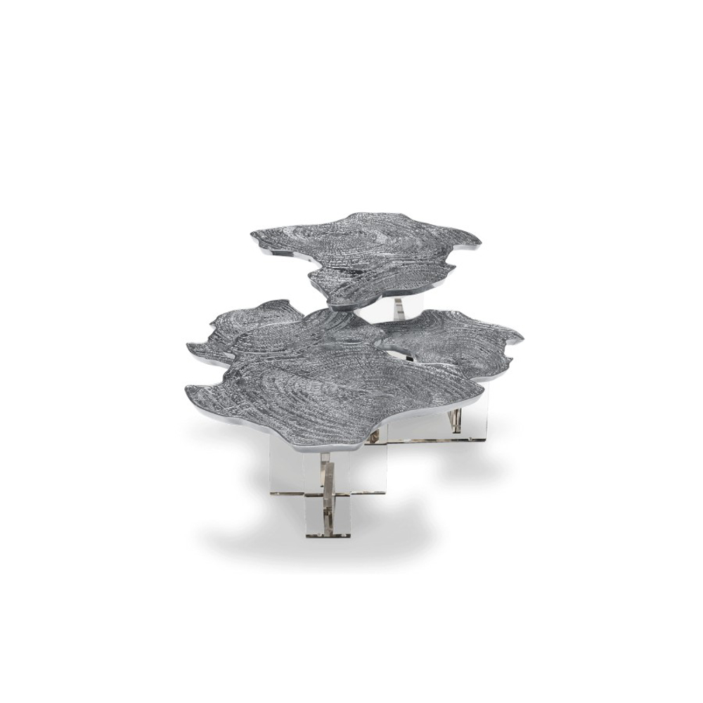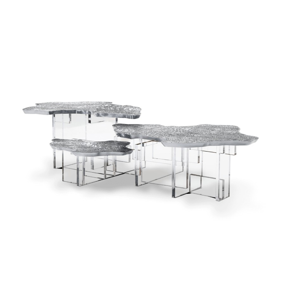 Depicting nature in an innovative way, the Water Lillies series are gently brought to life in an elegant coffee table with gold surface made from cast brass with a unique textured finish. Featuring both contrasting shapes and materials, as the unconventional compositions of the artist, the contemporary coffee table is supported by a geometric acrylic base, allowing to capture natural light. An immersive exceptional objet, the Monet center table is perfect for cutting-edge living rooms.