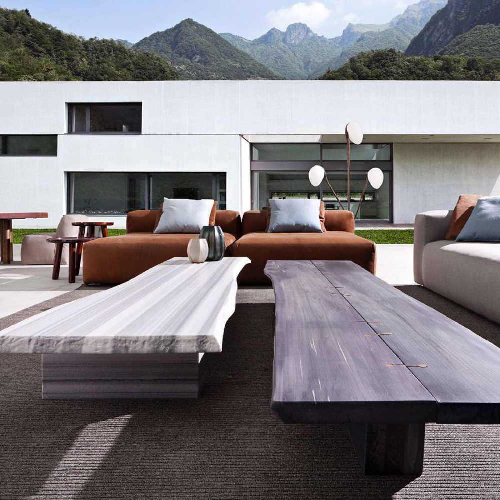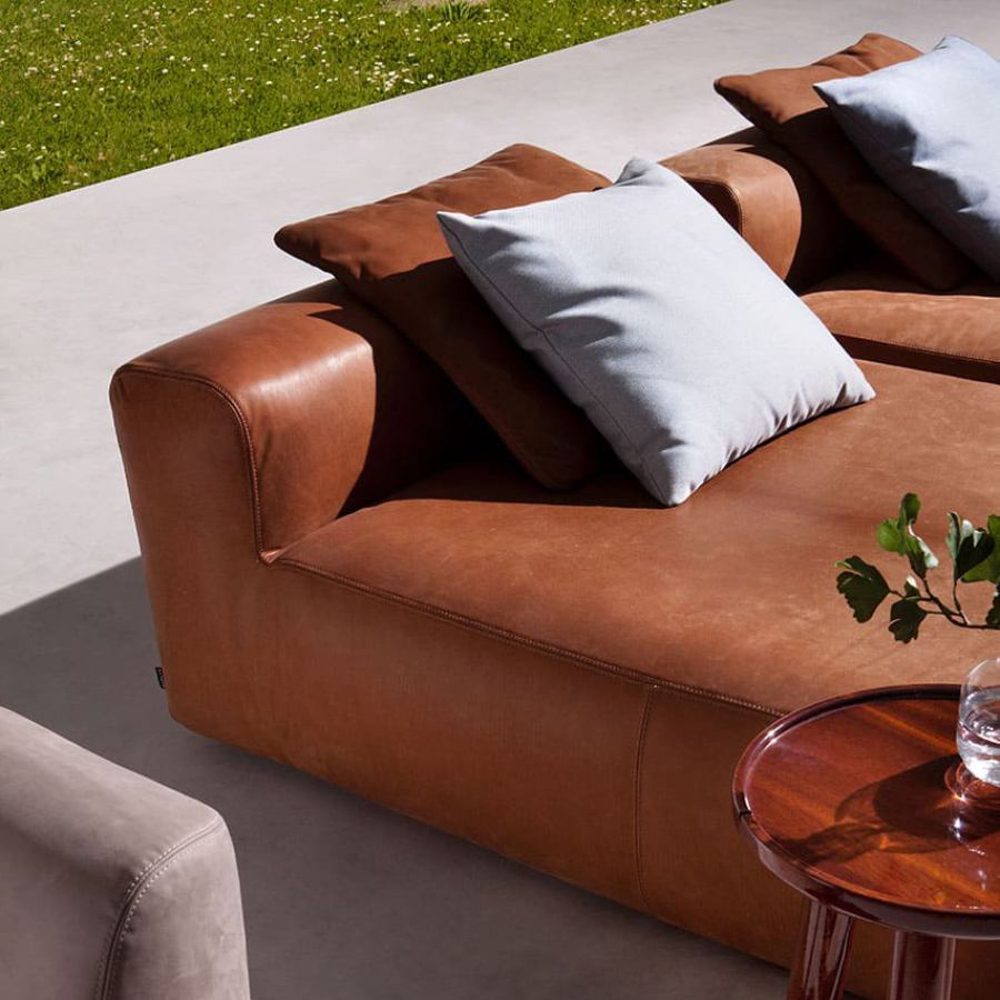 The squared design of the classical sofa develops its length creating a wide horizontal landscape of comfort with multiple seats. The abundant upholstered volumes bring to the outdoor the comfort usually dedicated to the interior design. The monolithic seat with no legs makes the sofa a single block of soft relaxing experience.