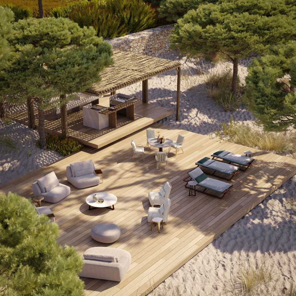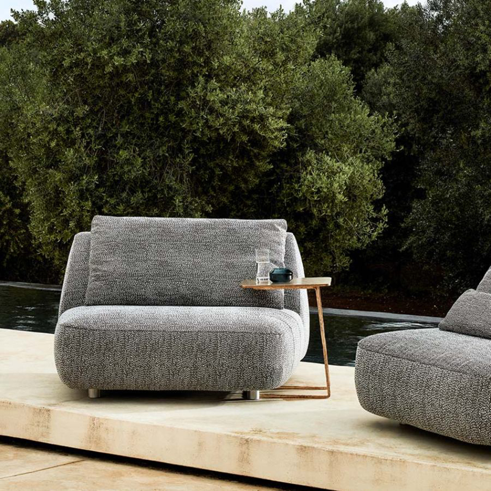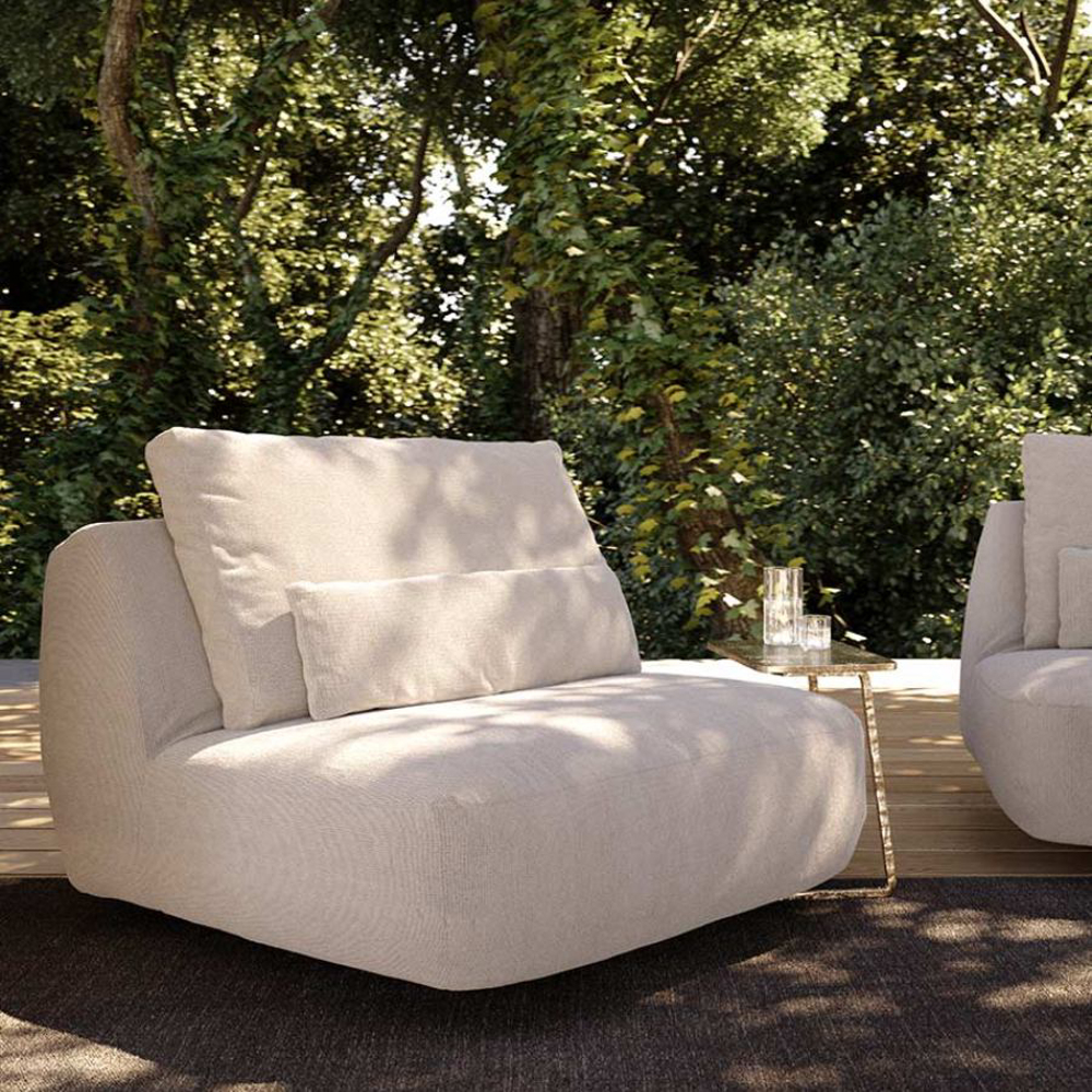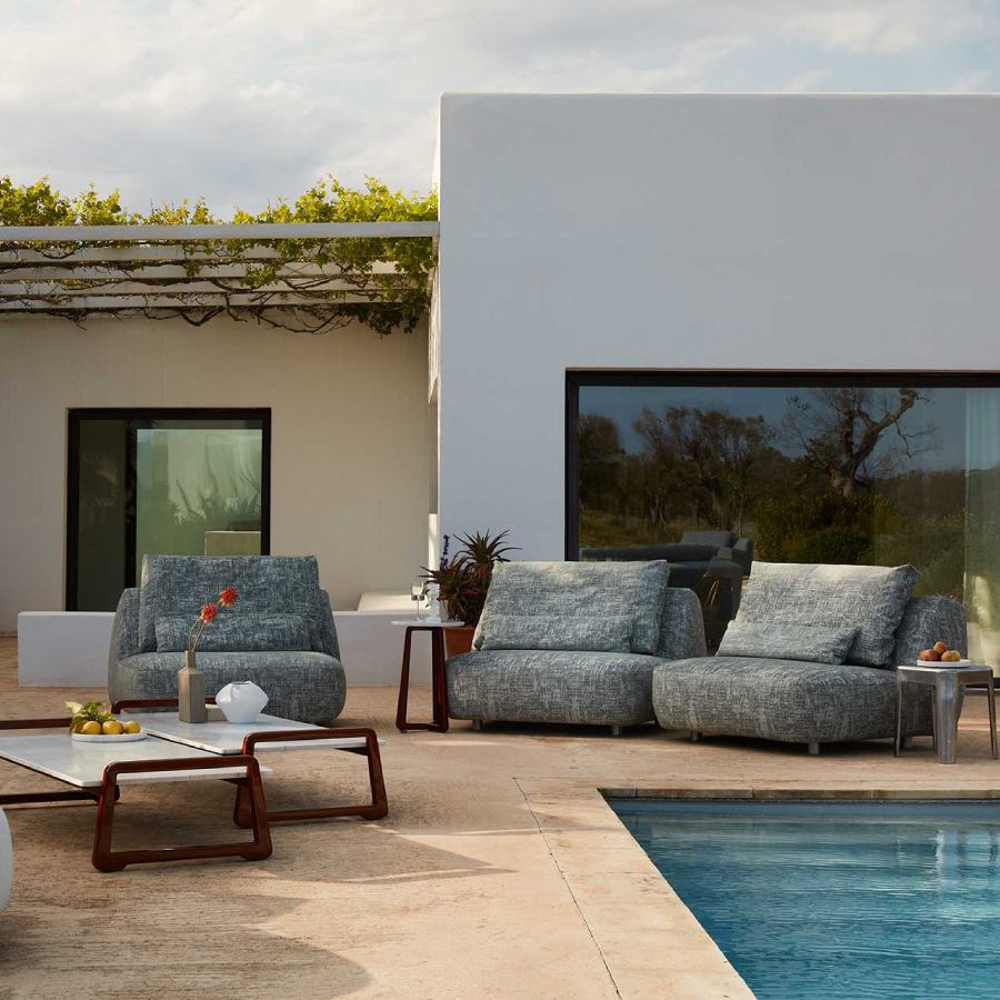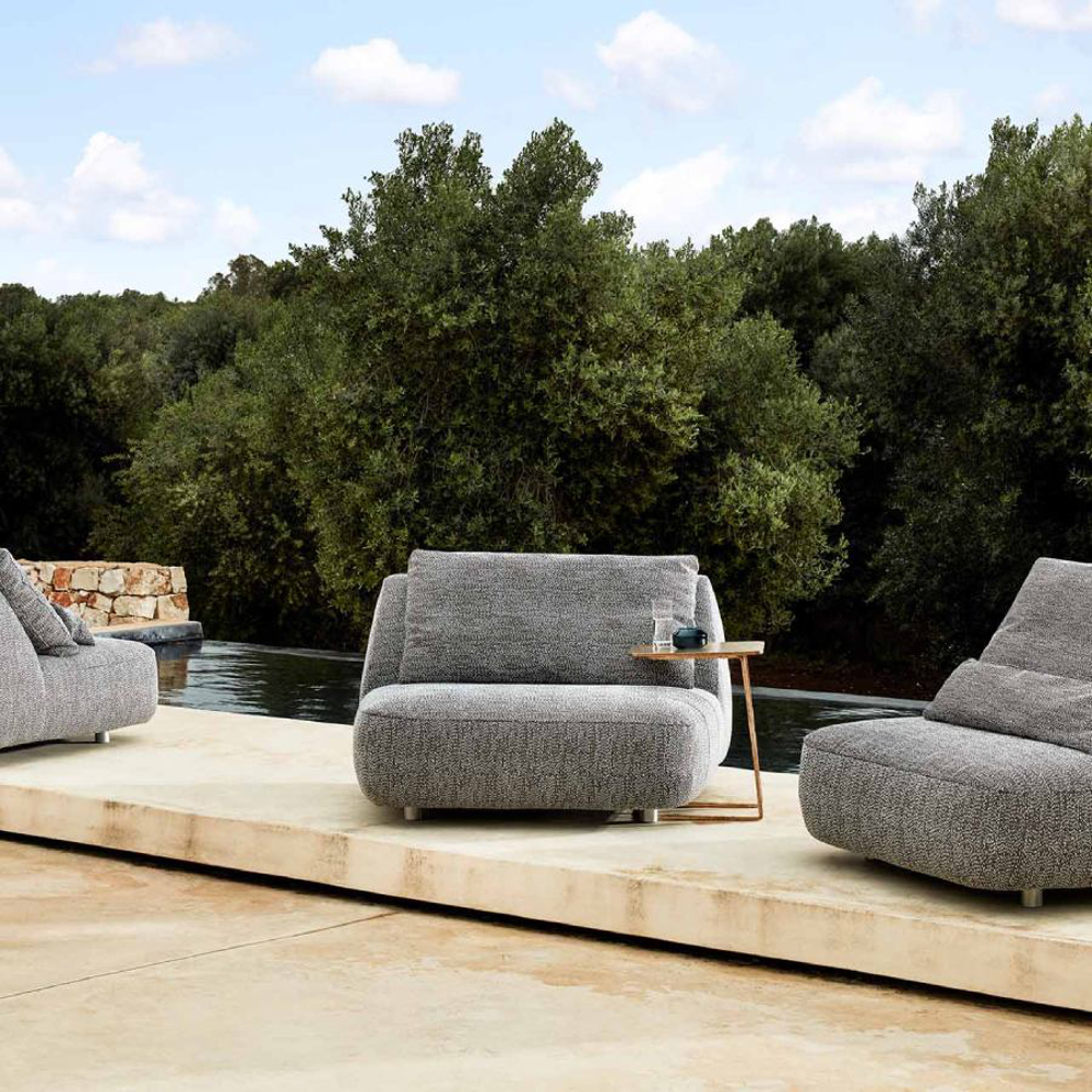 The different modules, with or without armrests, can stand on their own or together, creating various compositions. The seatback and backrest complete the sofa, making it perfect for beach clubs or poolside living areas.