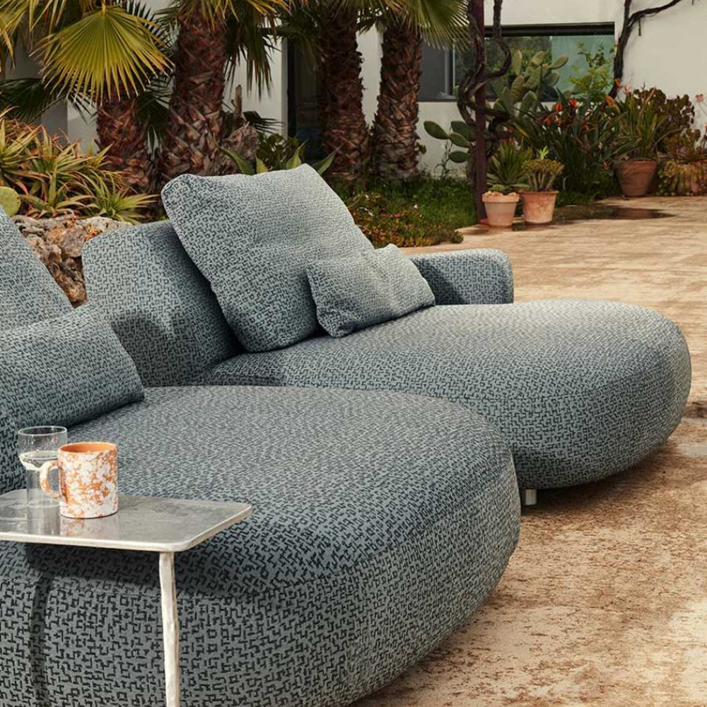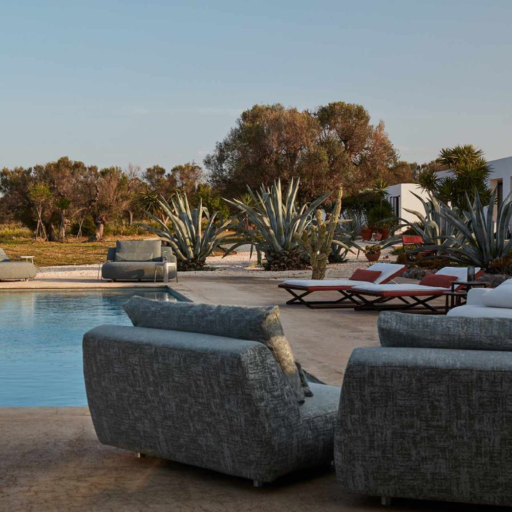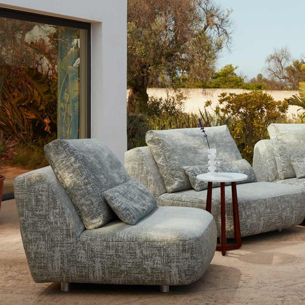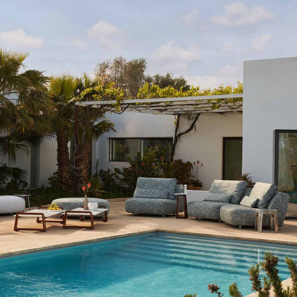 The different modules, with or without armrests, can stand on their own or together, creating various compositions. The seatback and backrest complete the sofa, making it perfect for beach clubs or poolside living areas.