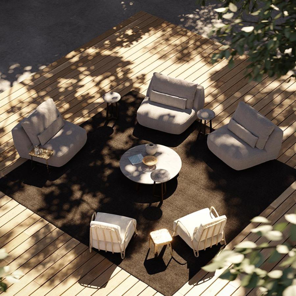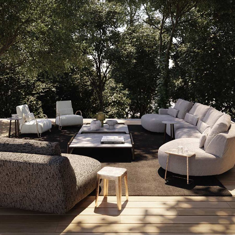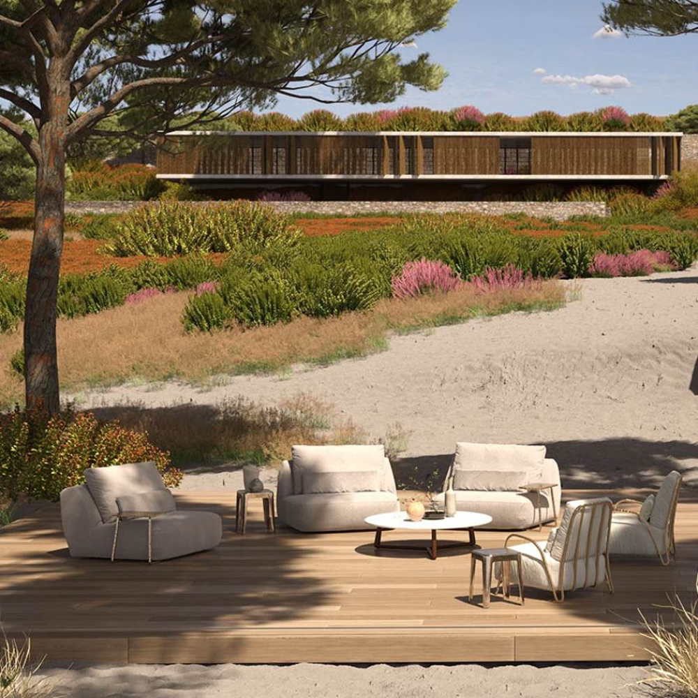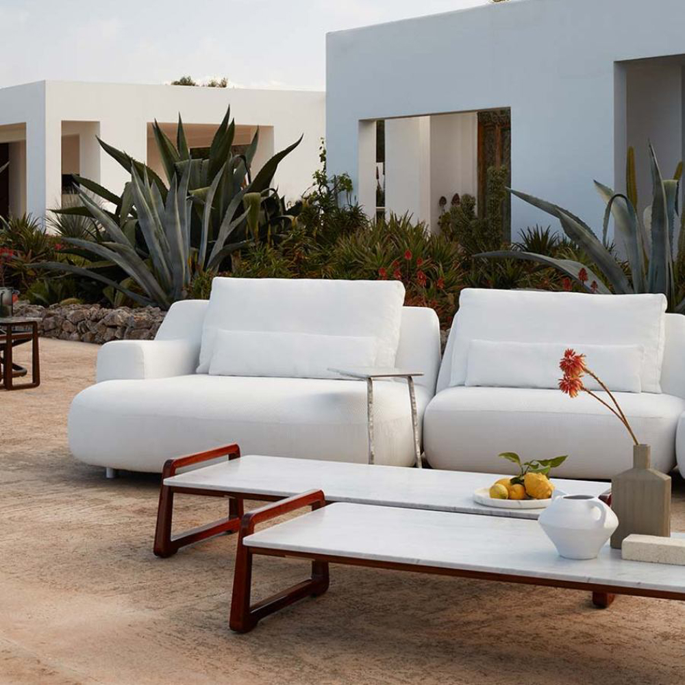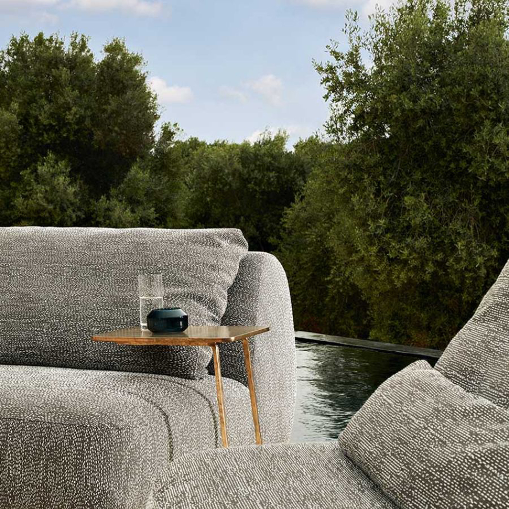 The different modules, with or without armrests, can stand on their own or together, creating various compositions. The seatback and backrest complete the sofa, making it perfect for beach clubs or poolside living areas.
