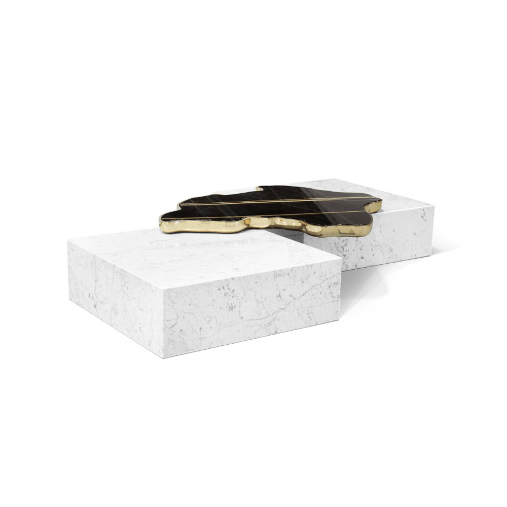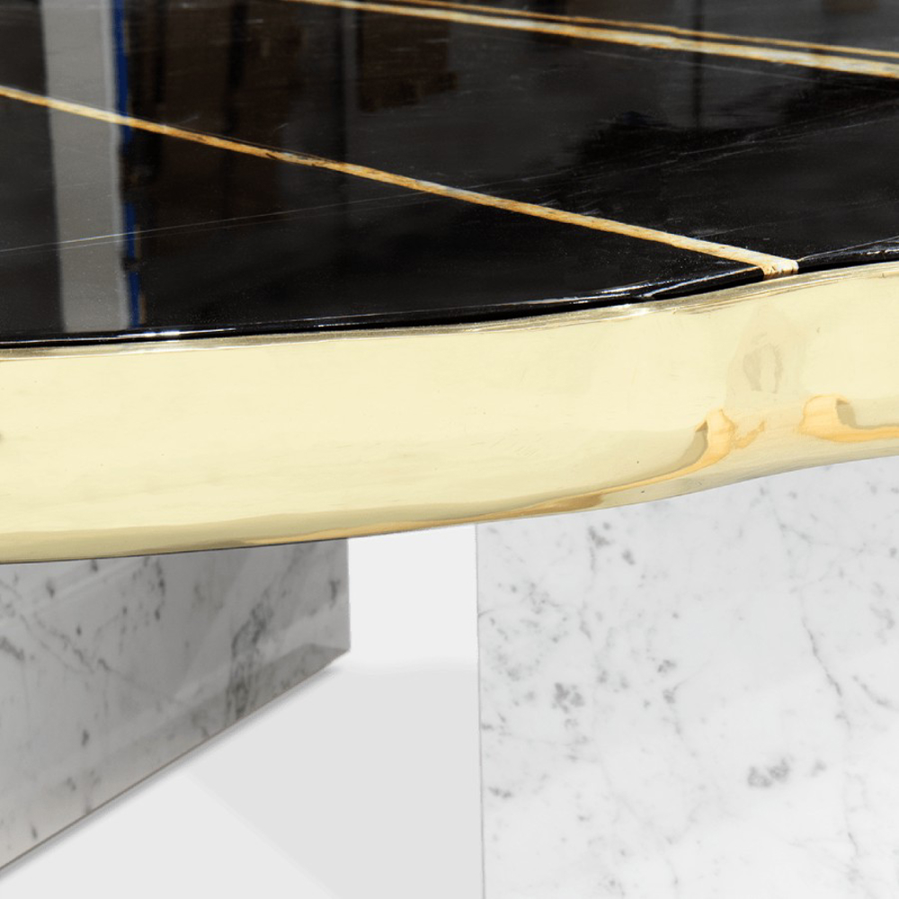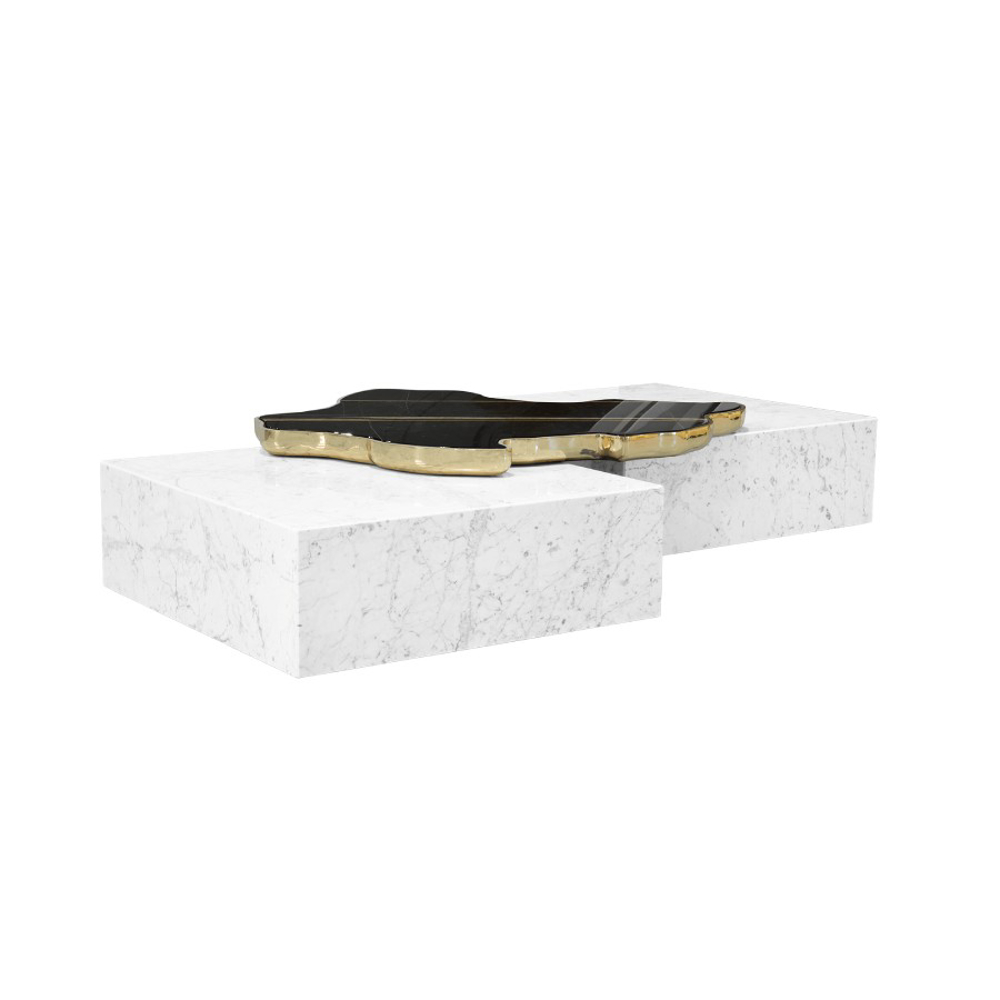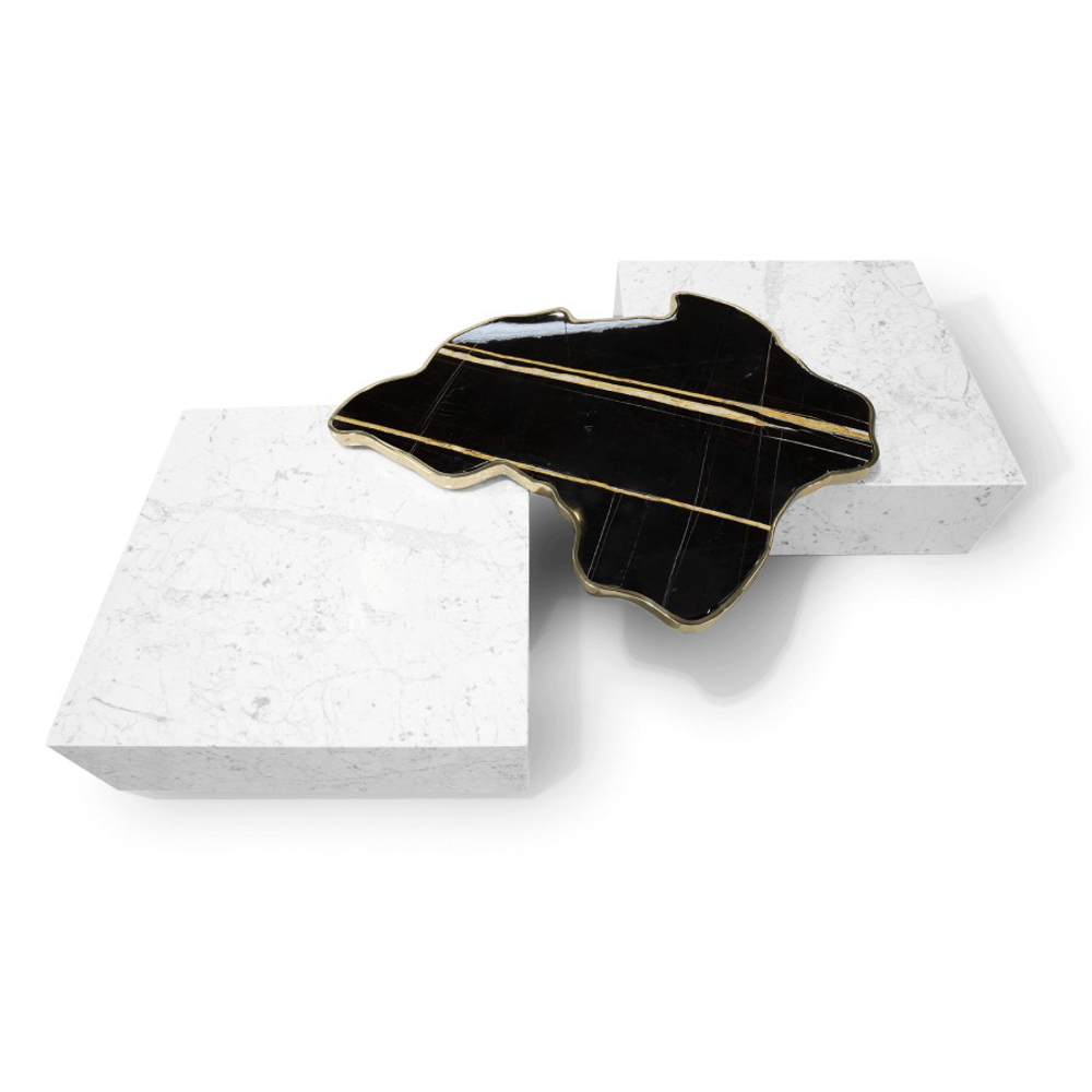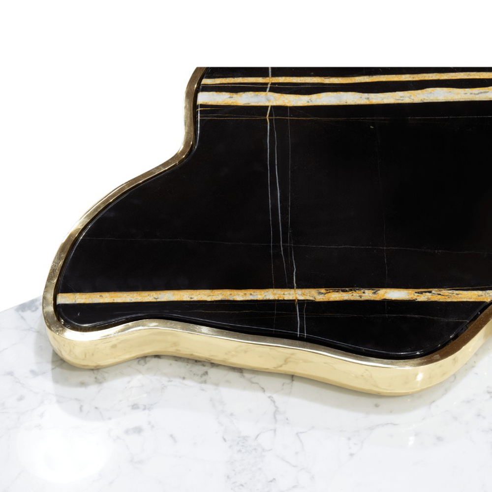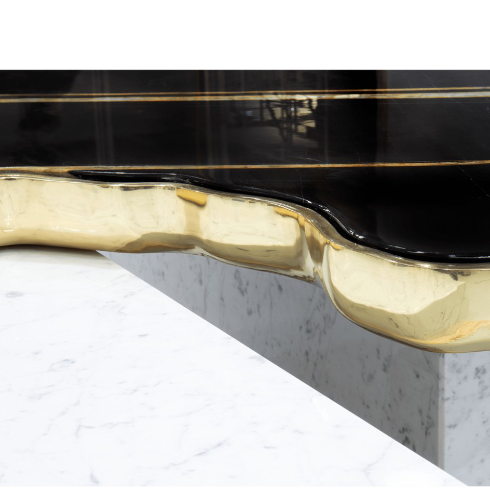 A contemporary center table composed by two square marble modules, linked by an organic marble surface element on top enveloped by casted brass.