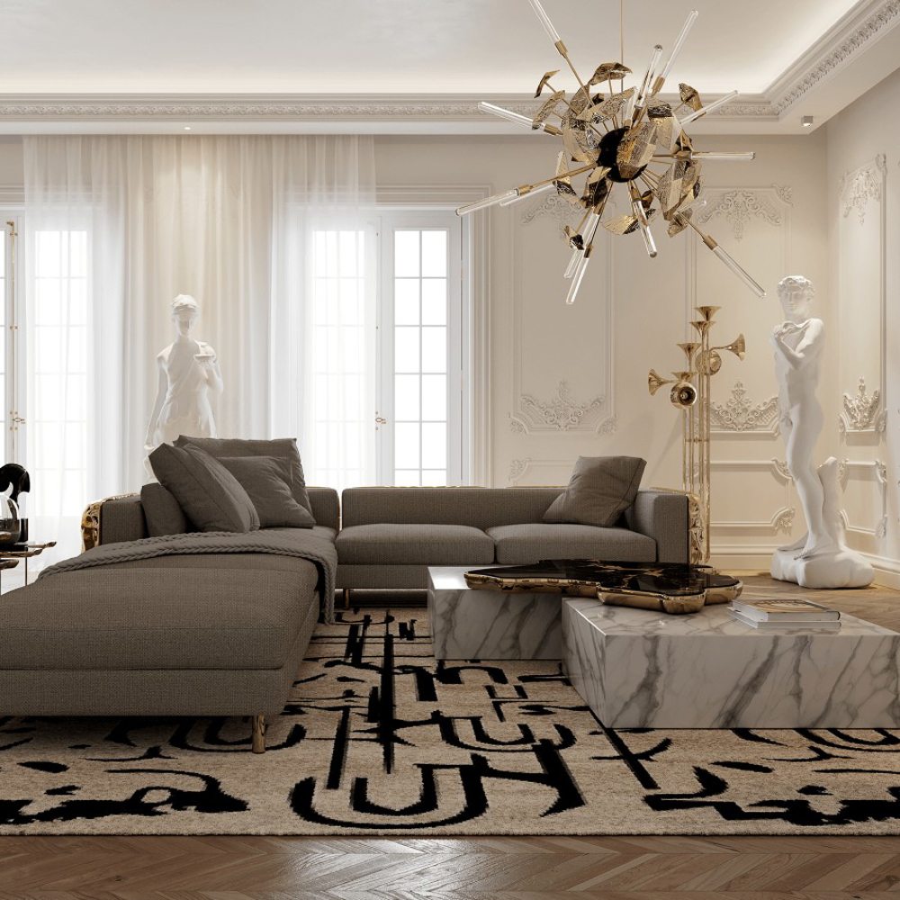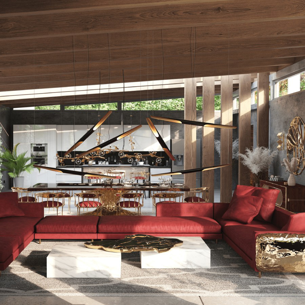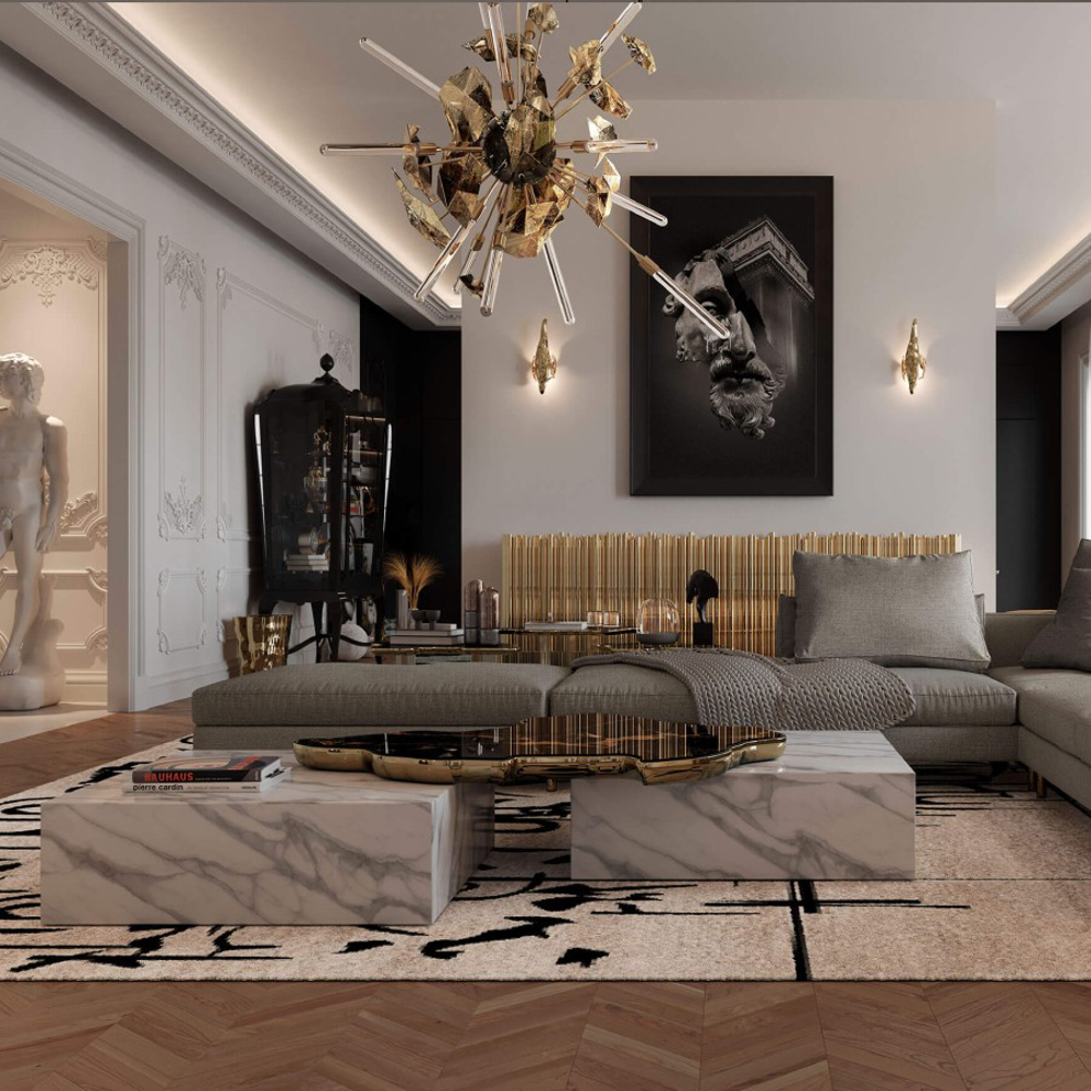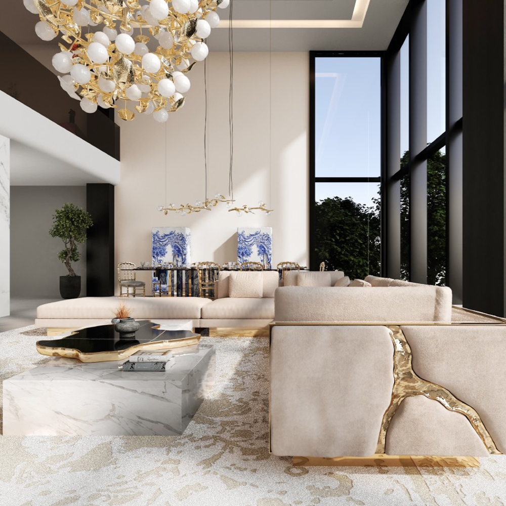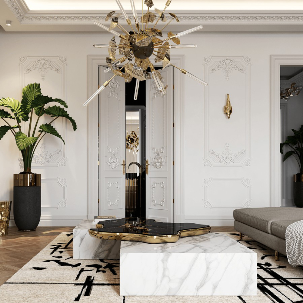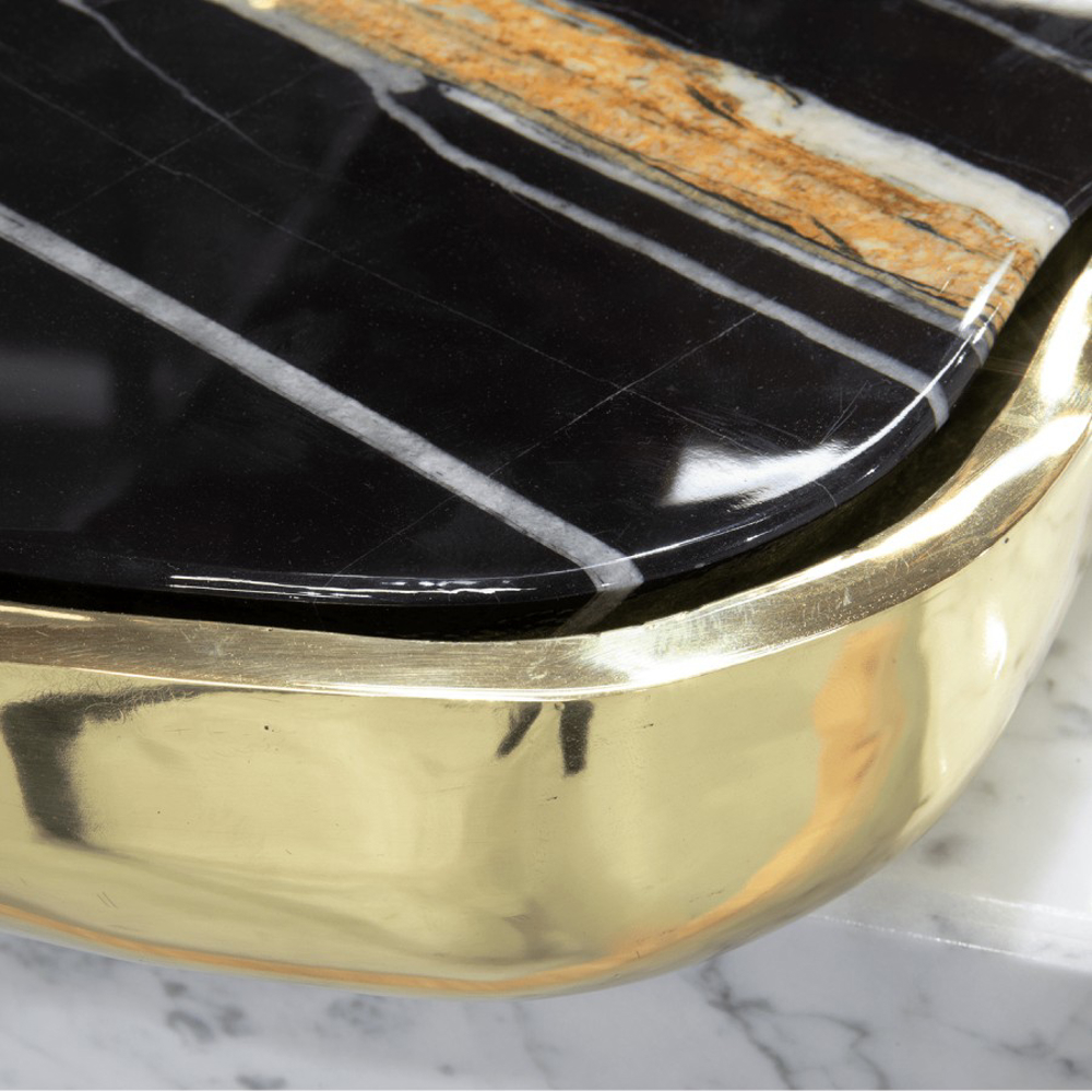 A contemporary center table composed by two square marble modules, linked by an organic marble surface element on top enveloped by casted brass.