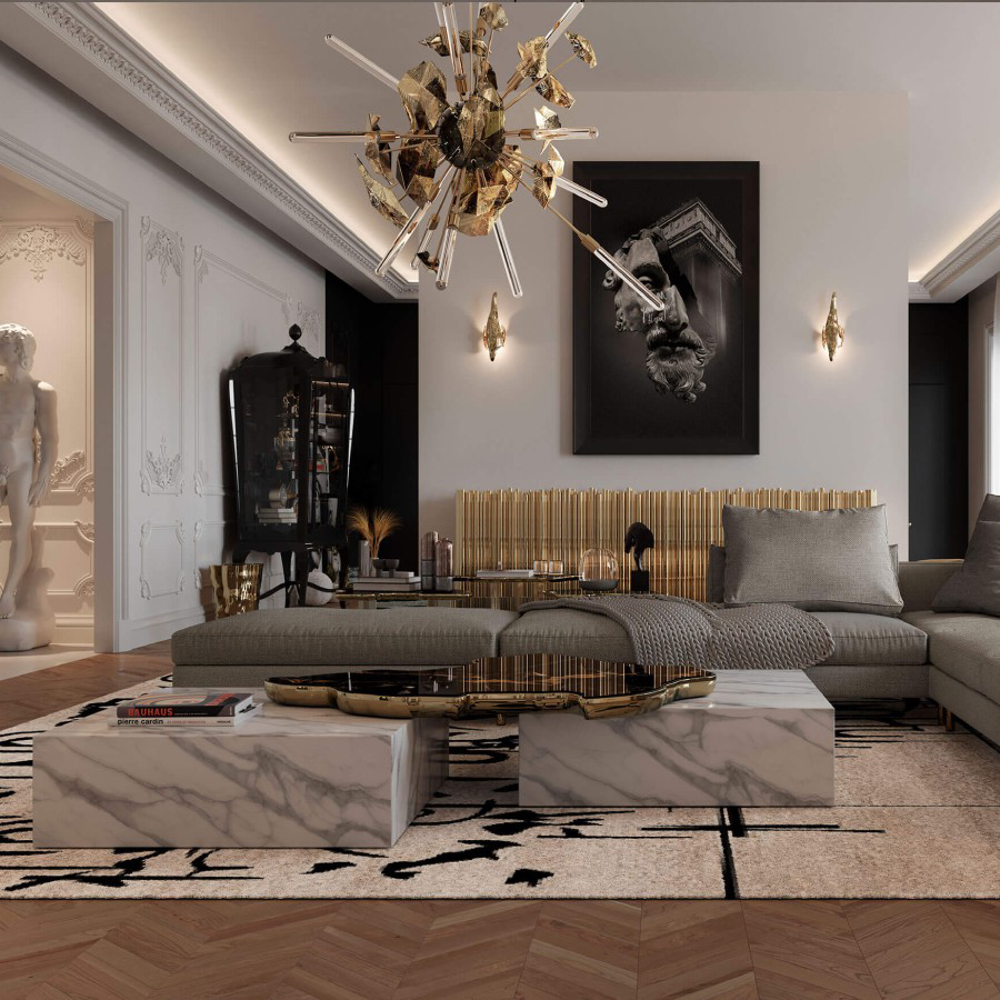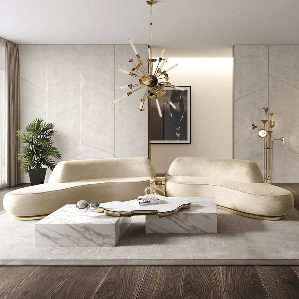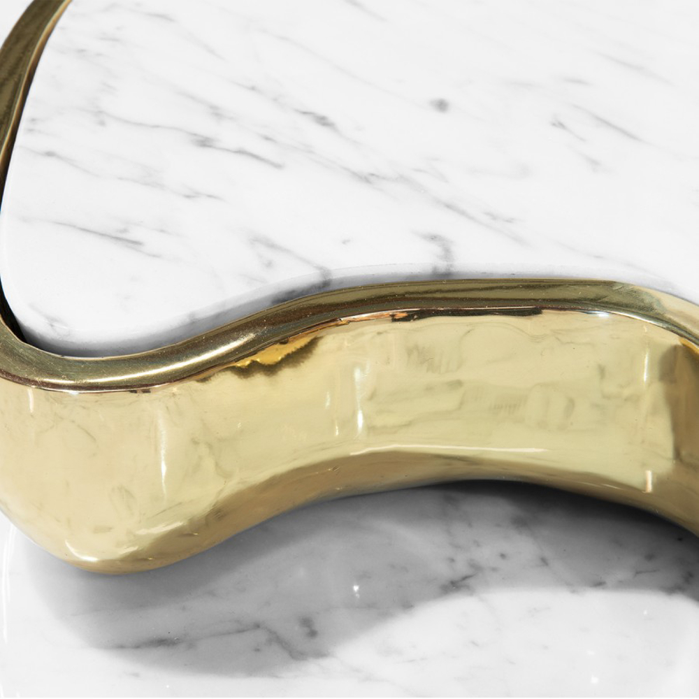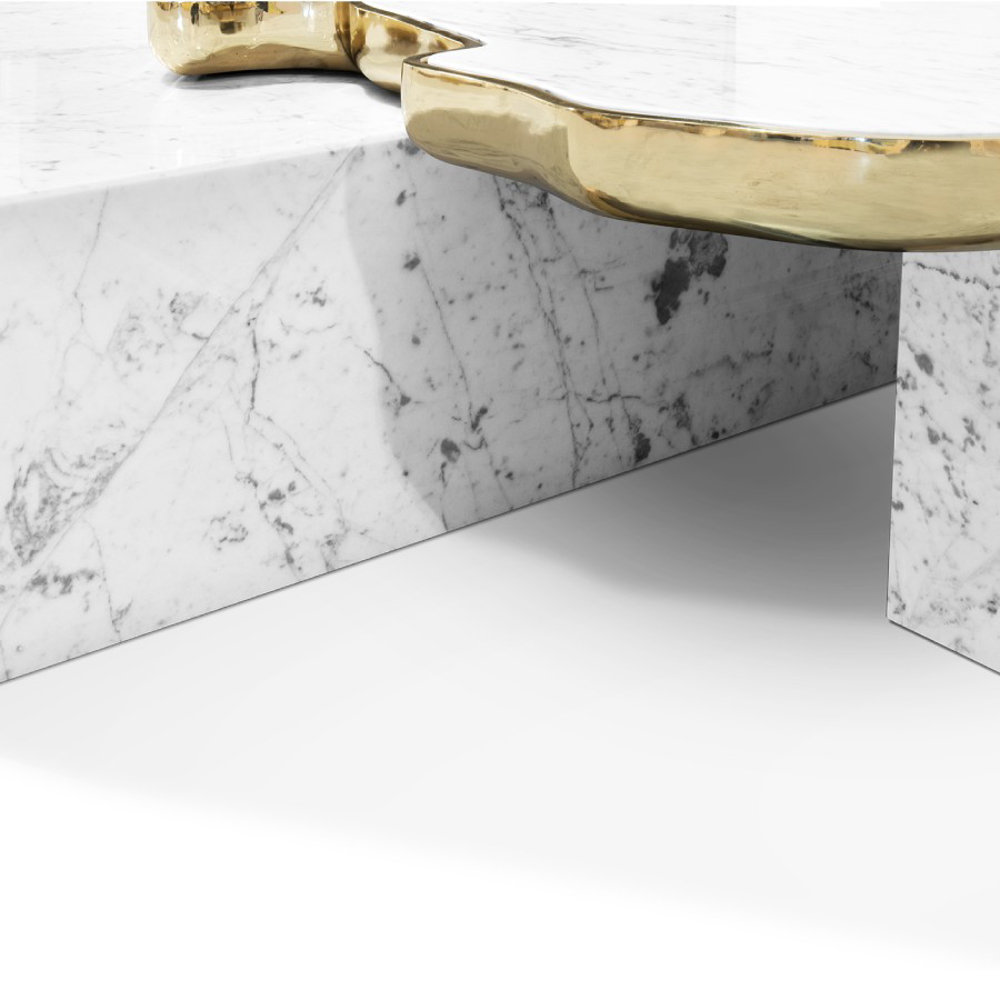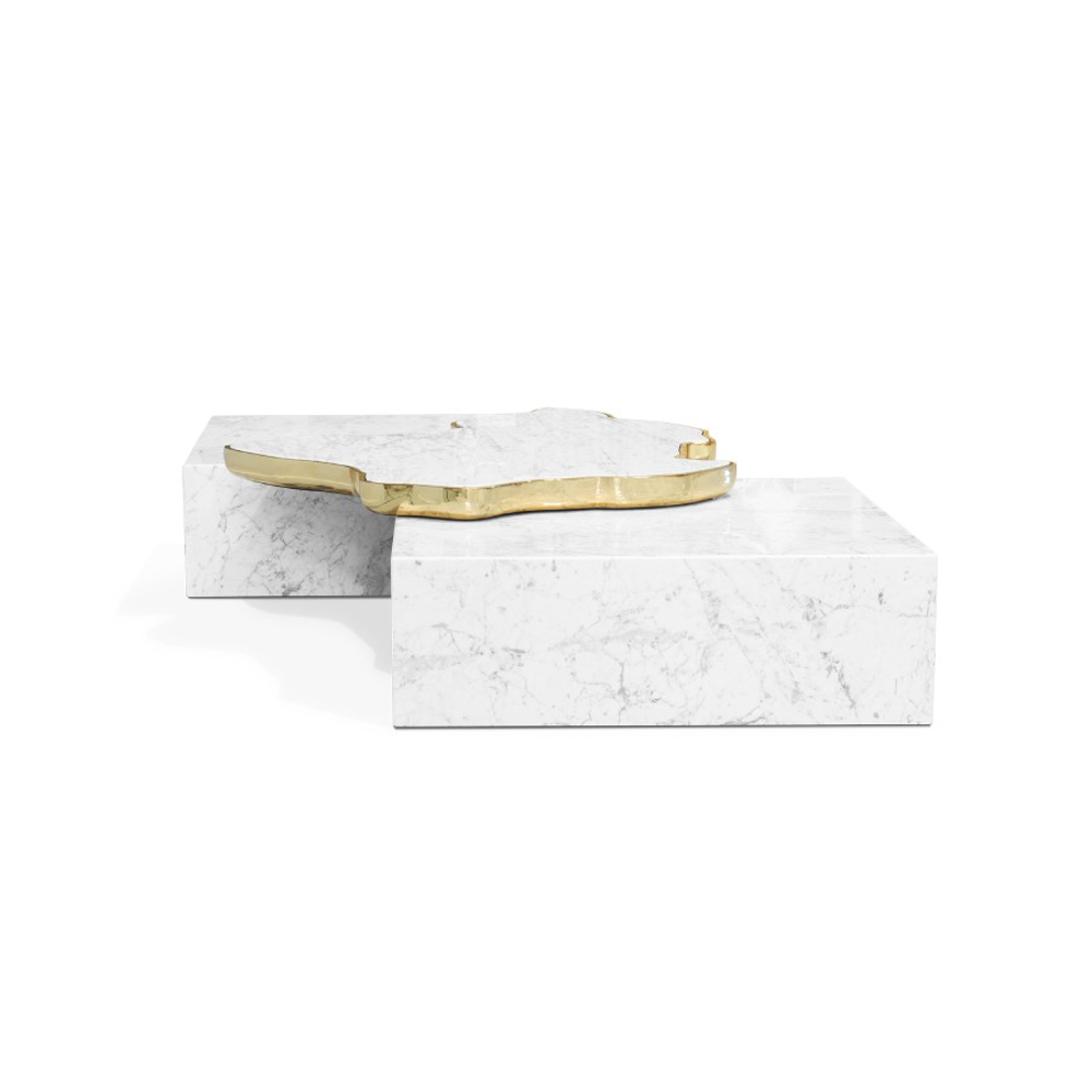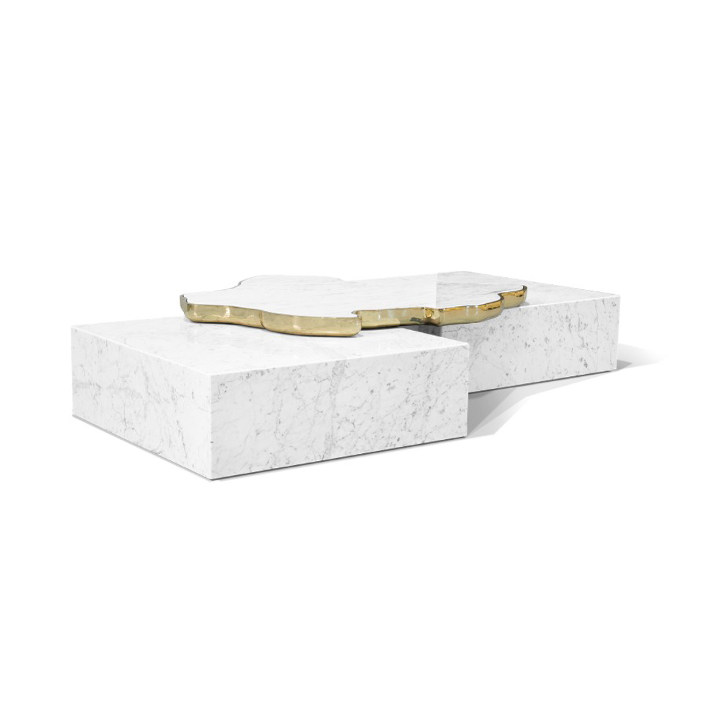 The design of Navarra modern center table captures unique Spanish warmth and finest craftsmanship. The rich colour background set off by thick and thin veins alike carries the eyes to the top of this table, framed by brass. Taking inspiration from its homeland, the Navarra coffee table brings an elegant flair into your home decoration. It is a contemporary center table composed by two square marble modules, linked by an organic marble surface element on top enveloped by casted brass. An exclusive design piece and polished choice for luxury home interiors.