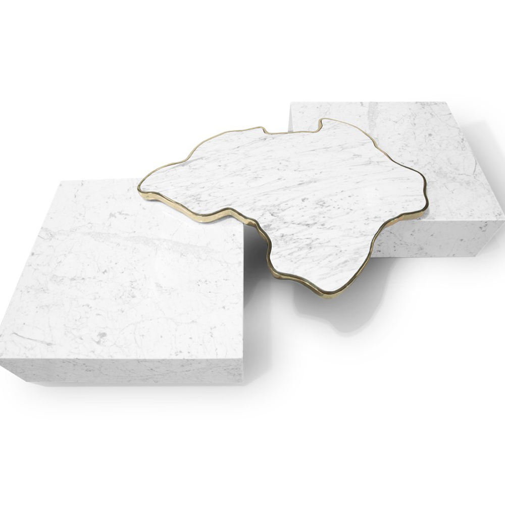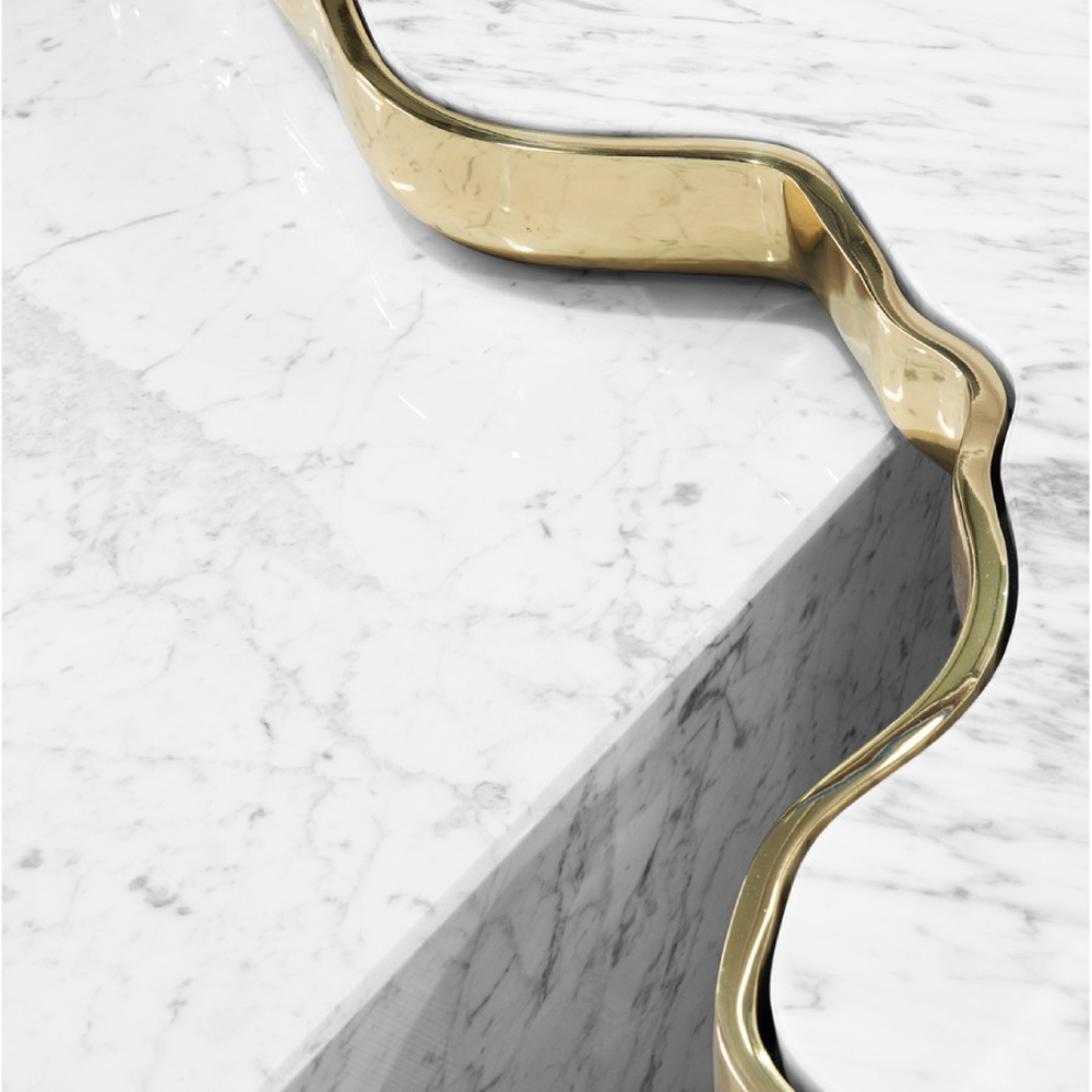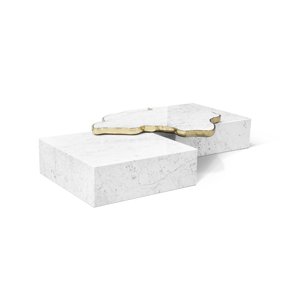A contemporary center table composed by two square marble modules, linked by an organic marble surface element on top enveloped by casted brass.