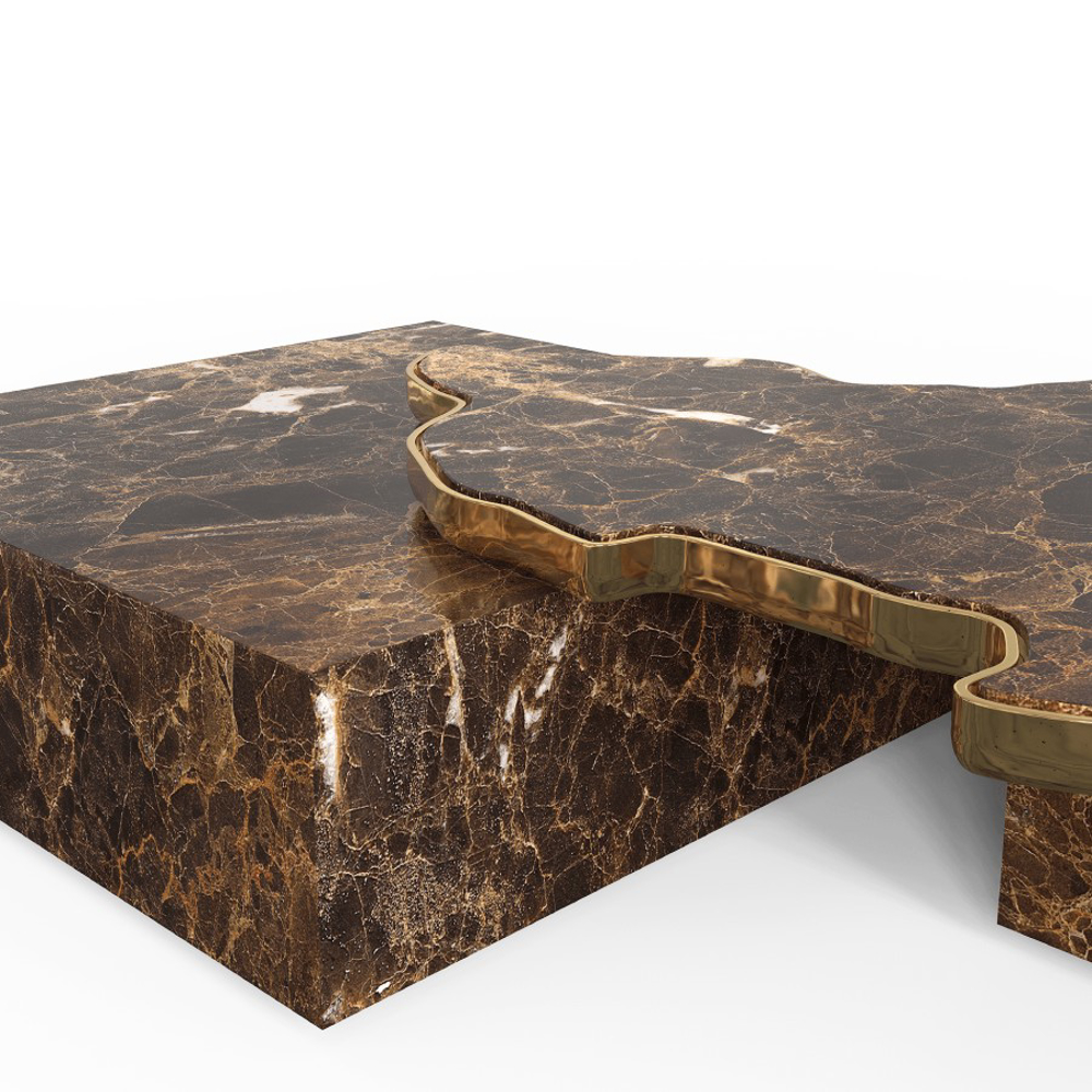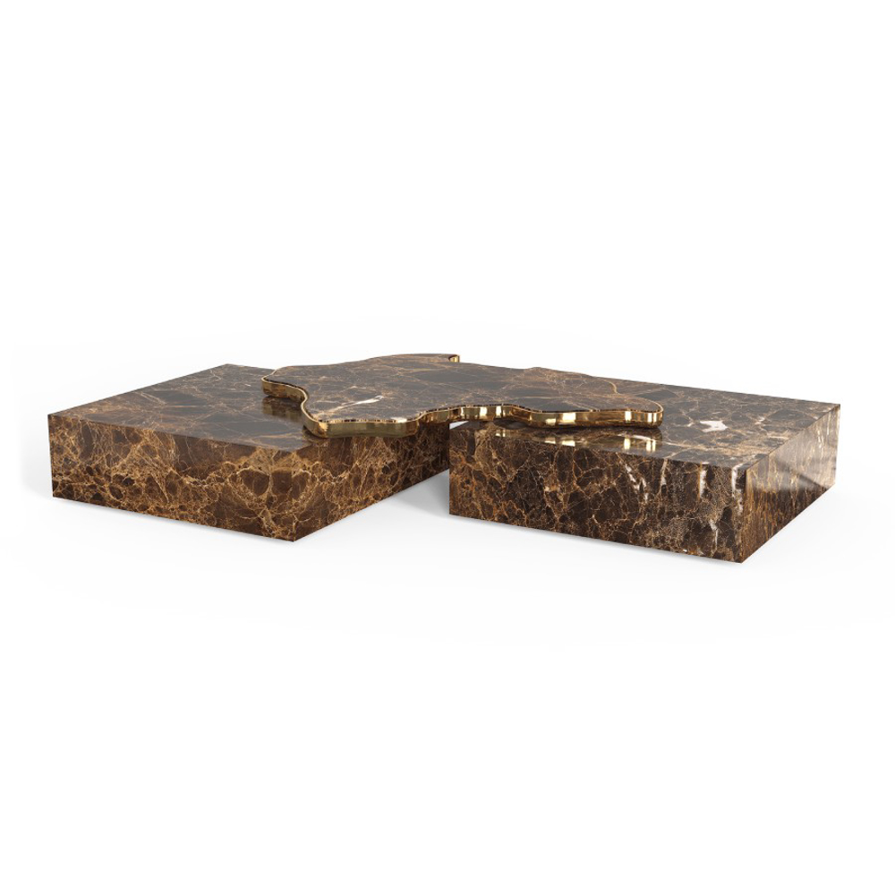 A contemporary center table composed by two square marble modules, linked by an organic marble surface element on top enveloped by casted brass.