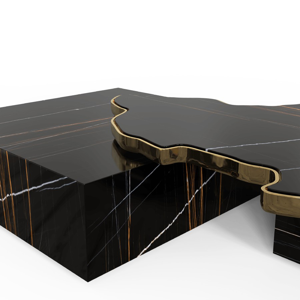 A contemporary center table composed by two square marble modules, linked by an organic marble surface element on top enveloped by casted brass.