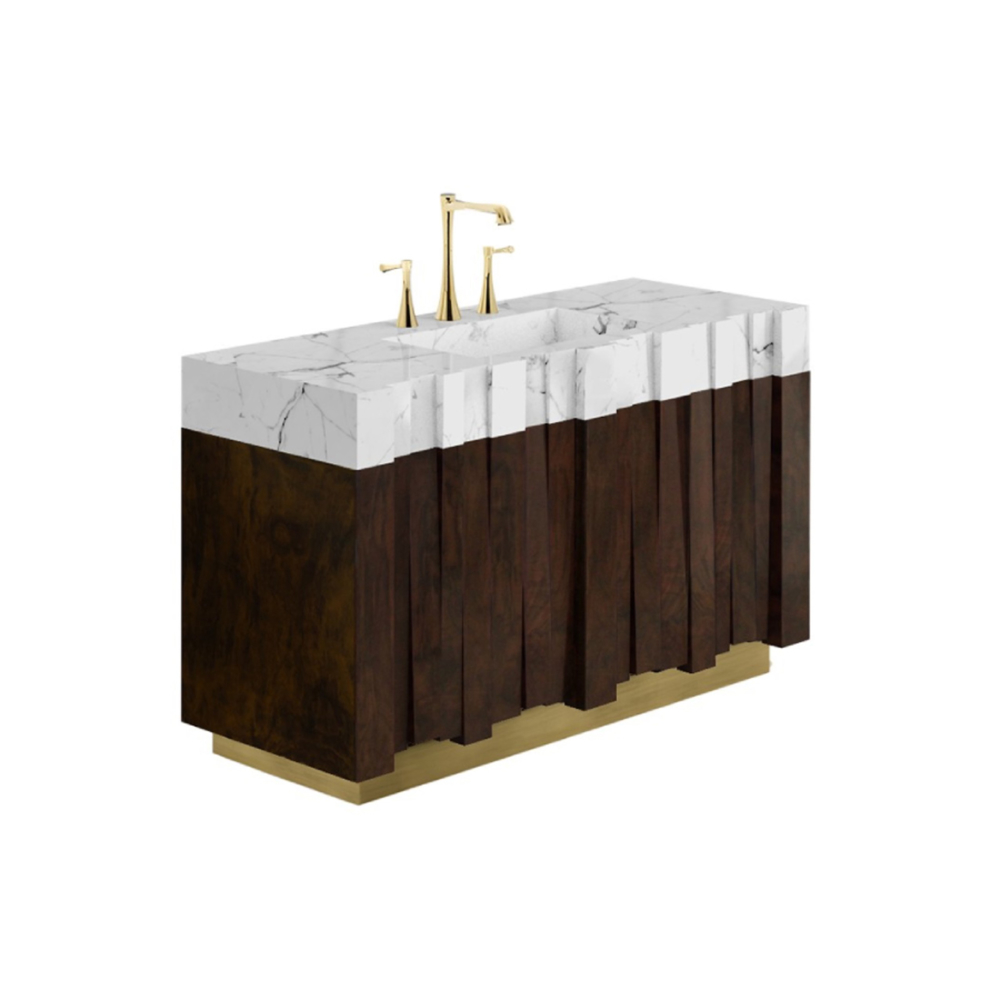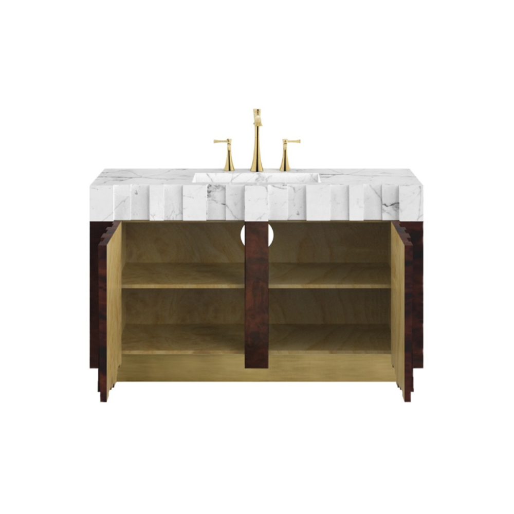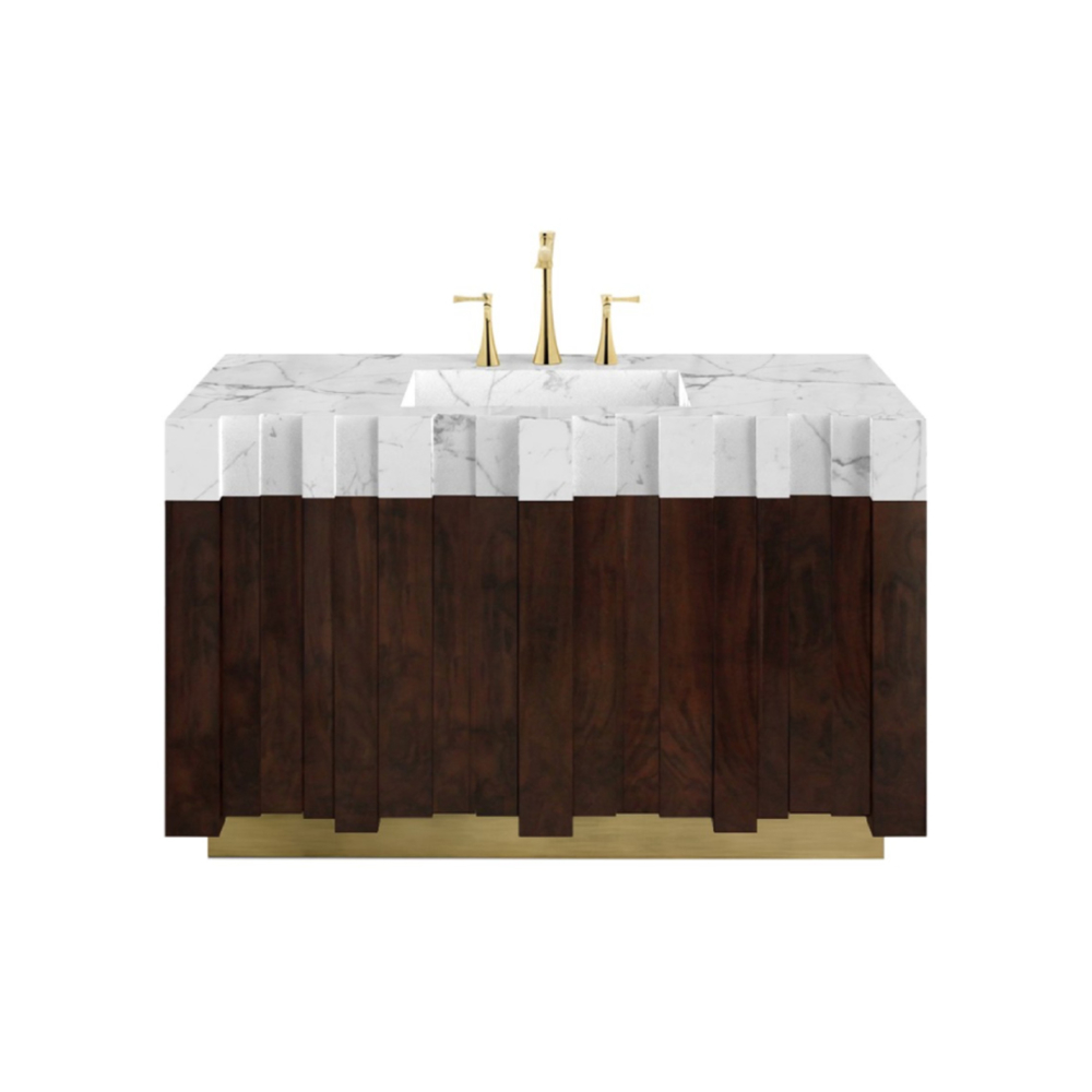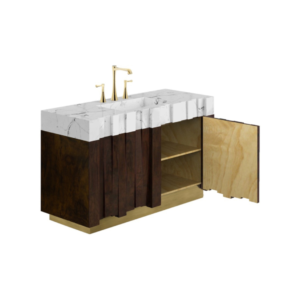 DESCRIPTION Nazca is a tectonic plate located in the southern Pacific Ocean. As a tribute to Mother Earth’s heartbeat, our designers created the Nazca Single Vanity Cabinet with a structure in matte walnut root veneer, a base in vintage brass matte, and a marble sink. This vanity cabinet will add a wonderful earth tone to any luxury modern bathroom interior design.
