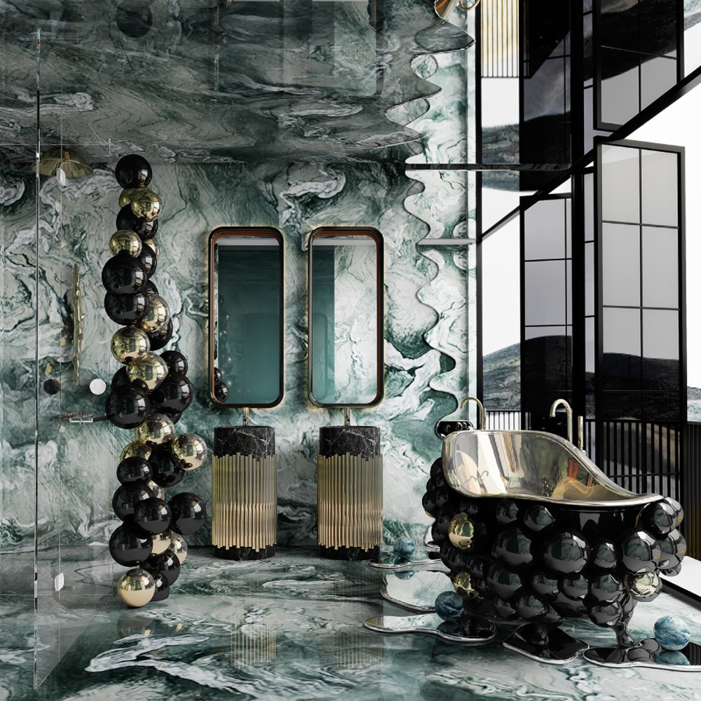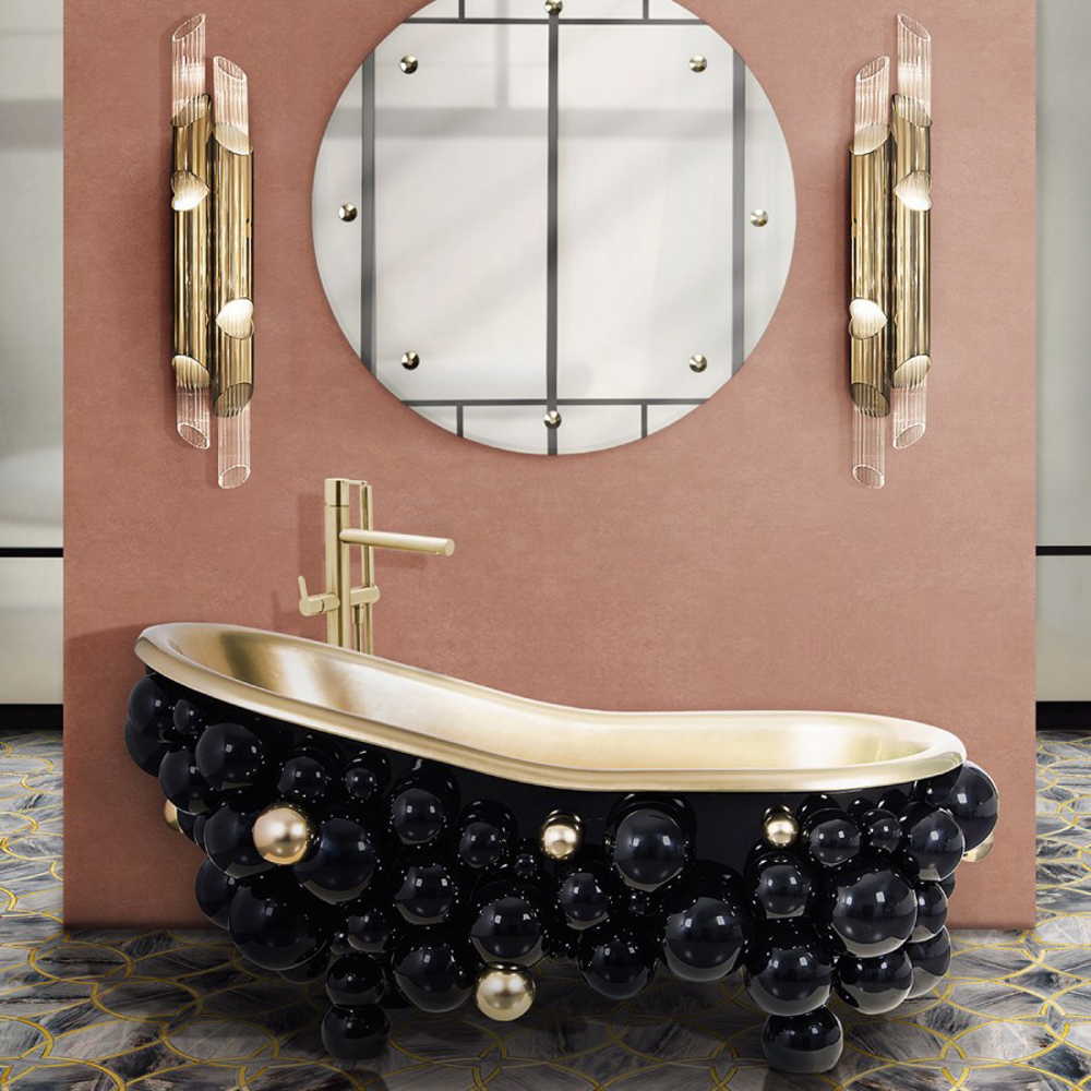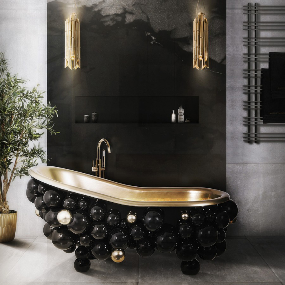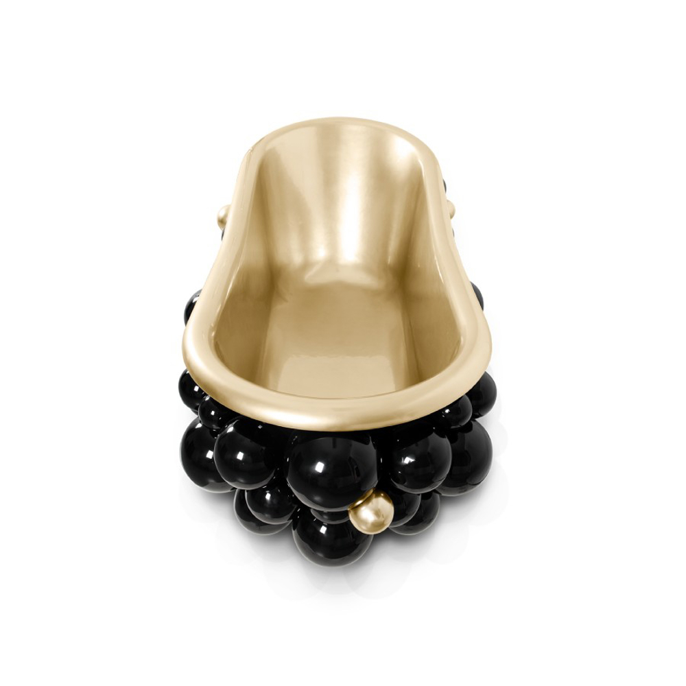 Fiber glass | Black lacquered spheres, High gloss varnish | Gold Painted Spheres, High Gloss Varnish; Tub: Casted iron, Gold painted; Water drainage: Floor
